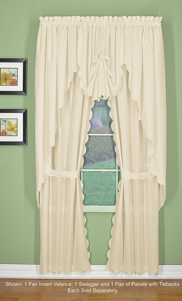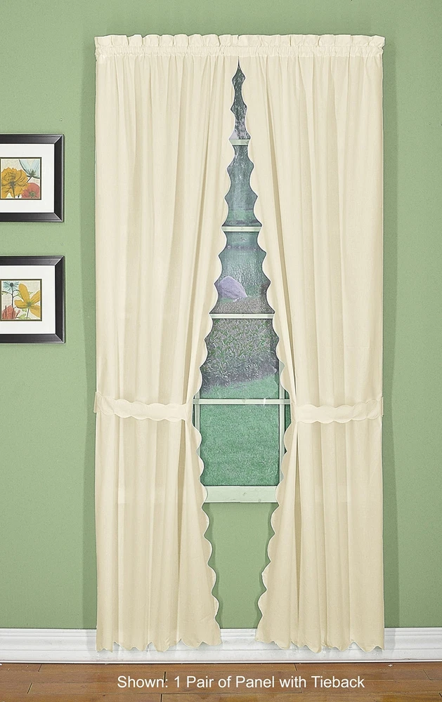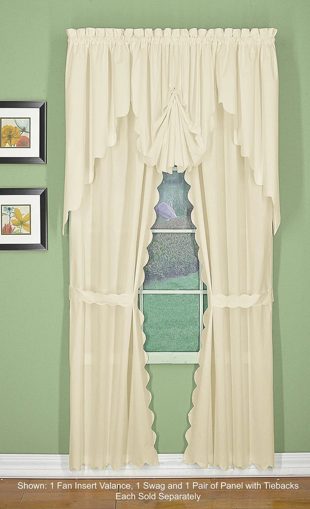 Orleans: tambour scallop edge curtain a classic look reminiscent of the Cape Cod curtain in style but with an updated design. This 50percent cotton 50percent polyester tambour scallop edge curtain will bring grace and elegance to any room. Every piece is beautifully embellished with scalloped edge bottom and/or side. Swags, valances and fan inserts are available to create your own favorite combinations of window toppers. Tiers in 30 inch and 36 inch come with pair of tiebacks. Panel pairs comes with pair of coordinated tiebacks! each piece hangs with a rod pocket and fit a rod up to 1 inch in diameter. Available in colors: white, ecru, sage, Buttercup, brick red and linen. Machine washable, easy care. Panel pair with tiebacks, valances, swag pair, Tier pair and fan insert are sold separately. 65Percent polyester; 35Percent cotton Engineered Tambour Scallop Edges Solid color, poly-cotton blend, Easy care-machine washable Engineered tambour scallop edges in L shaped panel pair, 2 tiebacks included, 4-piece-set