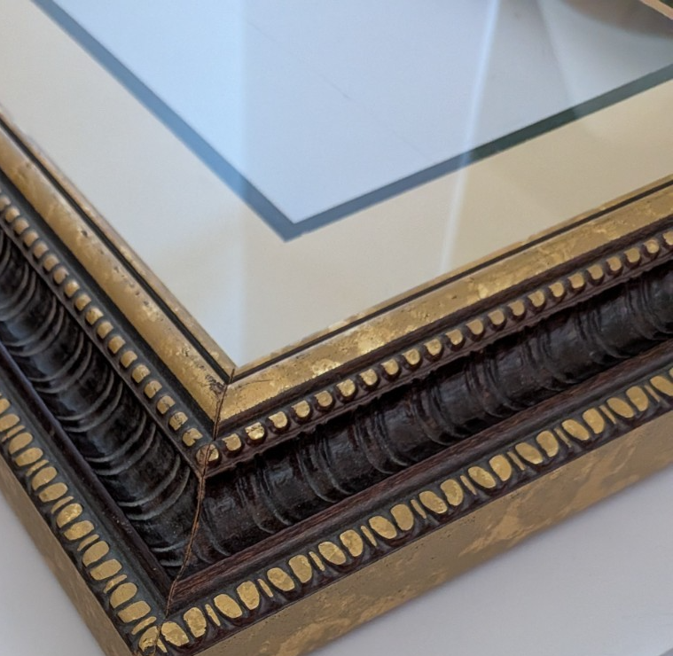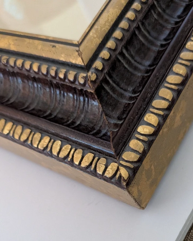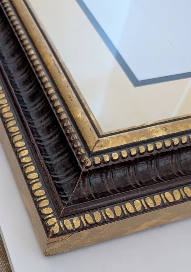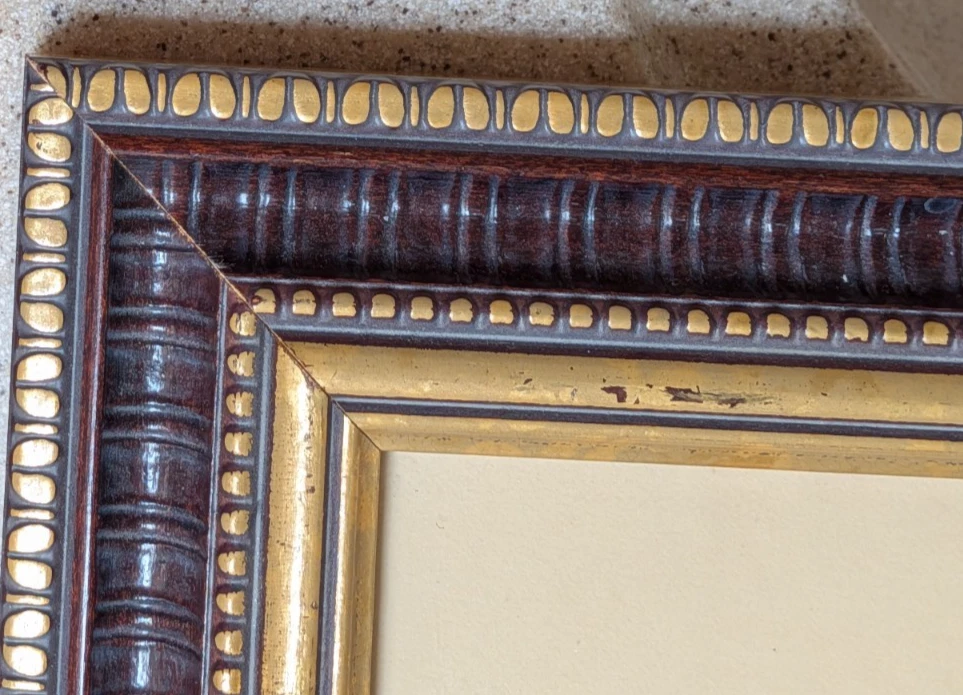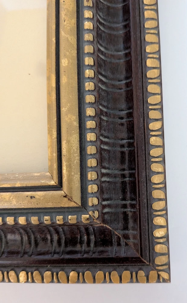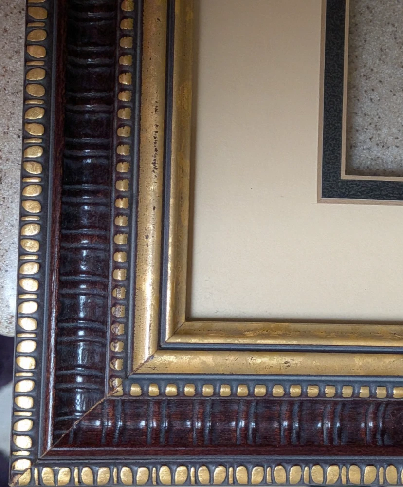 This frame is of composite wood with molded detail; gold painted (gilt-style); and purple ribbed outer molding with repeating gold dot/bead detail. Double mat: cream outer mat with a purple inner mat over a small cream edge. Standard glass.