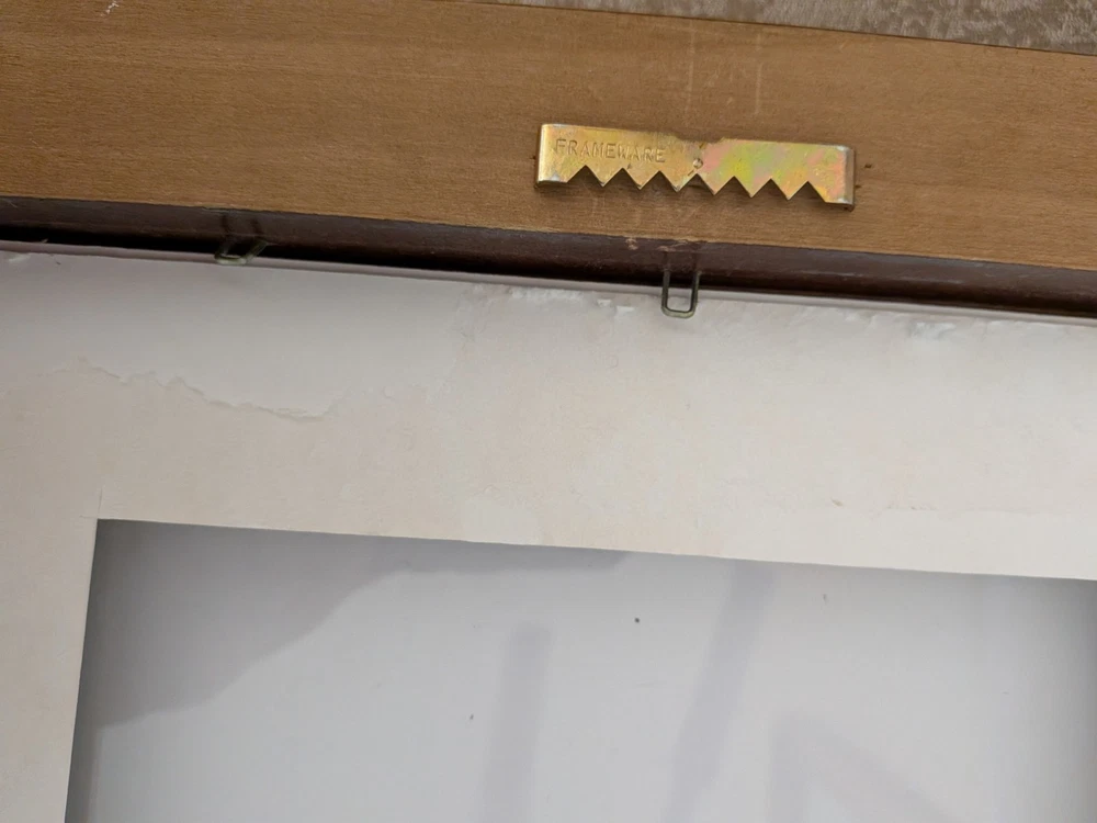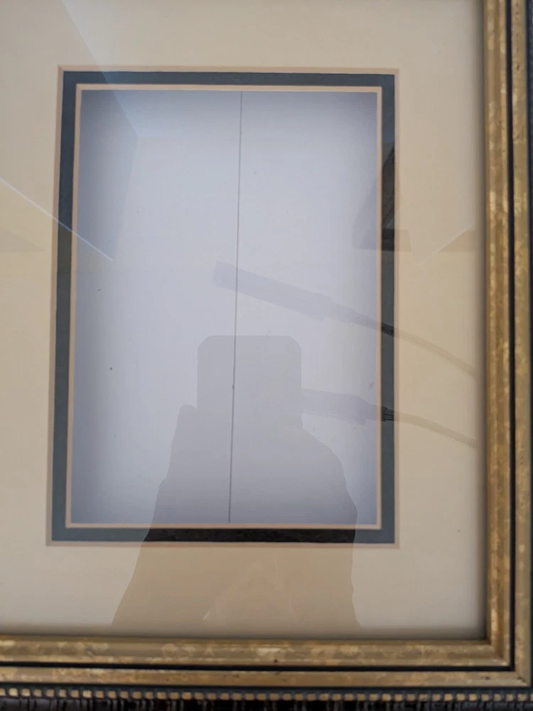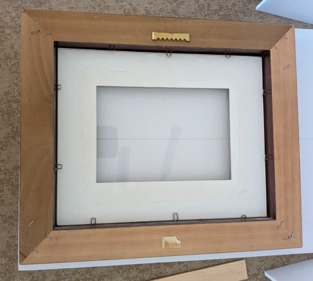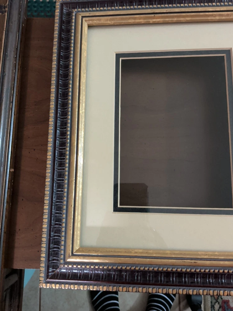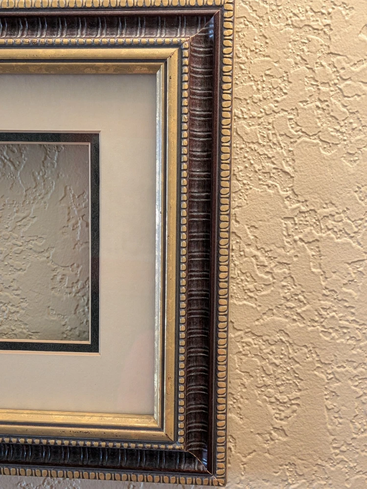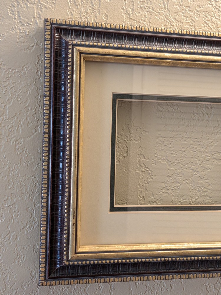 This frame is of composite wood with molded detail; gold painted (gilt-style); and purple ribbed outer molding with repeating gold dot/bead detail. Double mat: cream outer mat with a purple inner mat over a small cream edge. Standard glass.
