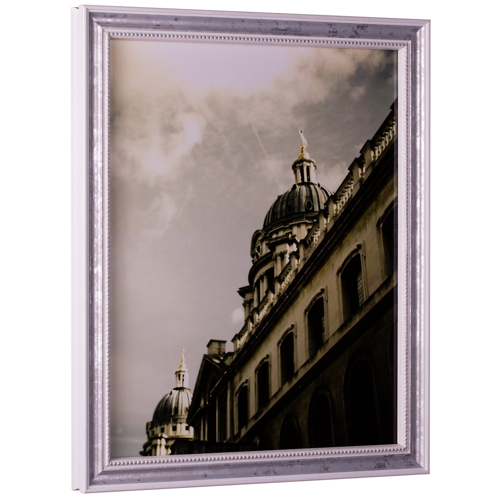 Victorian style; decorative silver facing with beaded inlay and white sidewall Frame includes: acrylic facing, cardboard backing and hanging kit (assembly required) Frame holds a 16 x 20 inch photo/print/poster (viewable area reduced by .25" on each side, due to frame lip) Frame moulding is .75 inches wide; solid Poplar wood Frame is designed for WALL HANGING only (hanging hardware allows for portrait or landscape orientation)