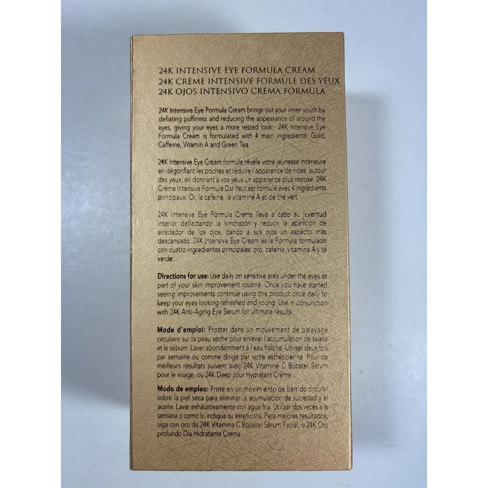 Targets puffiness and dark circles under the eyes, this paraben-free formula with gold, caffeine, and Vitamin A & E rejuvenates the delicate eye area. • 24K gold and caffeine ingredients • Reduces puffiness and dark circles • Paraben-free • Made in the USA • Net weight: 30g/1oz
