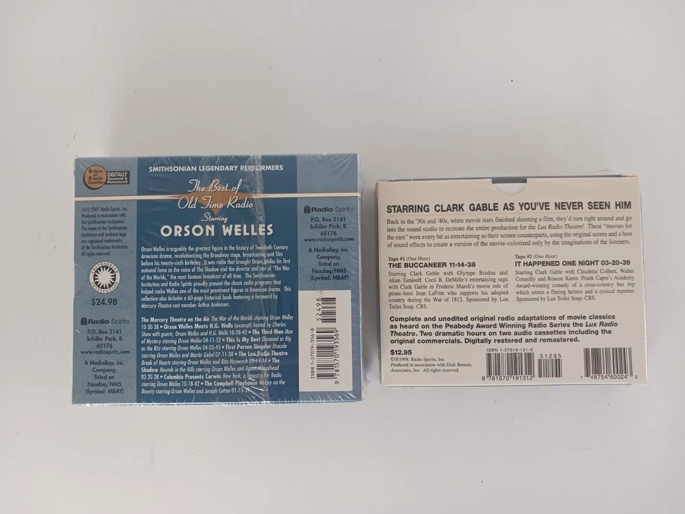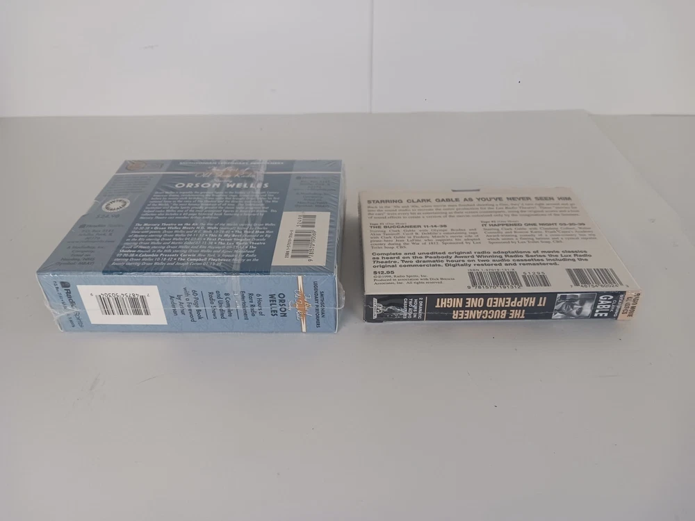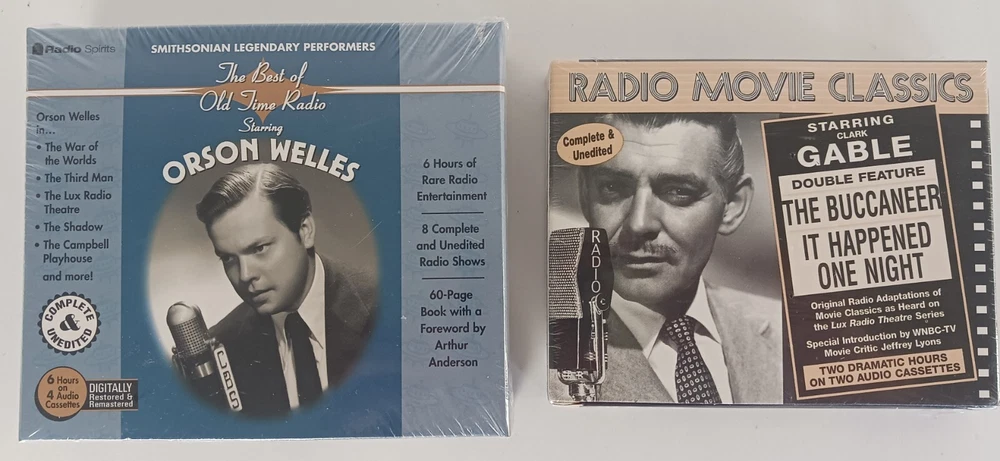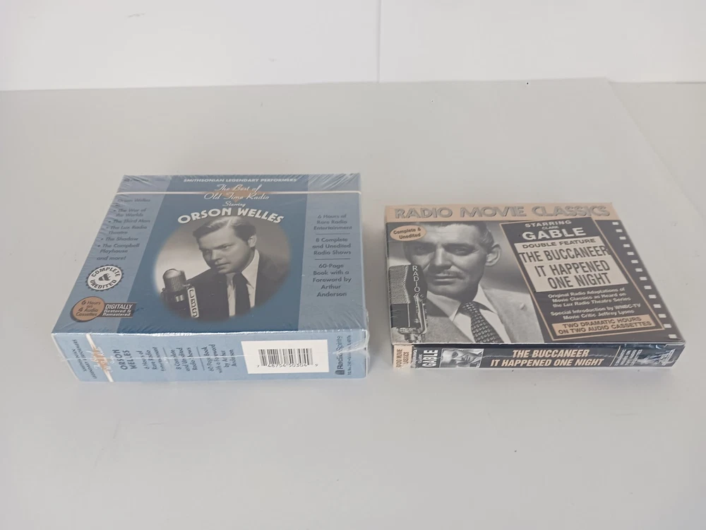 Orson Welles The Best of Old Time Radio, Radio Movie Classics Clark Gable, Cassette Tapes. Radio movie classic starring Clark Gable double featured the buccaneer It Happened One Night two dramatic hours on two audio cassettes. The best of old time radio starring Orson Welles. 6 hours of rare radio entertainment. It complete and unedited radio shows. 60 page book with a forward by Arthur Anderson. New in manufacturers original packaging. Ships out Same Day!