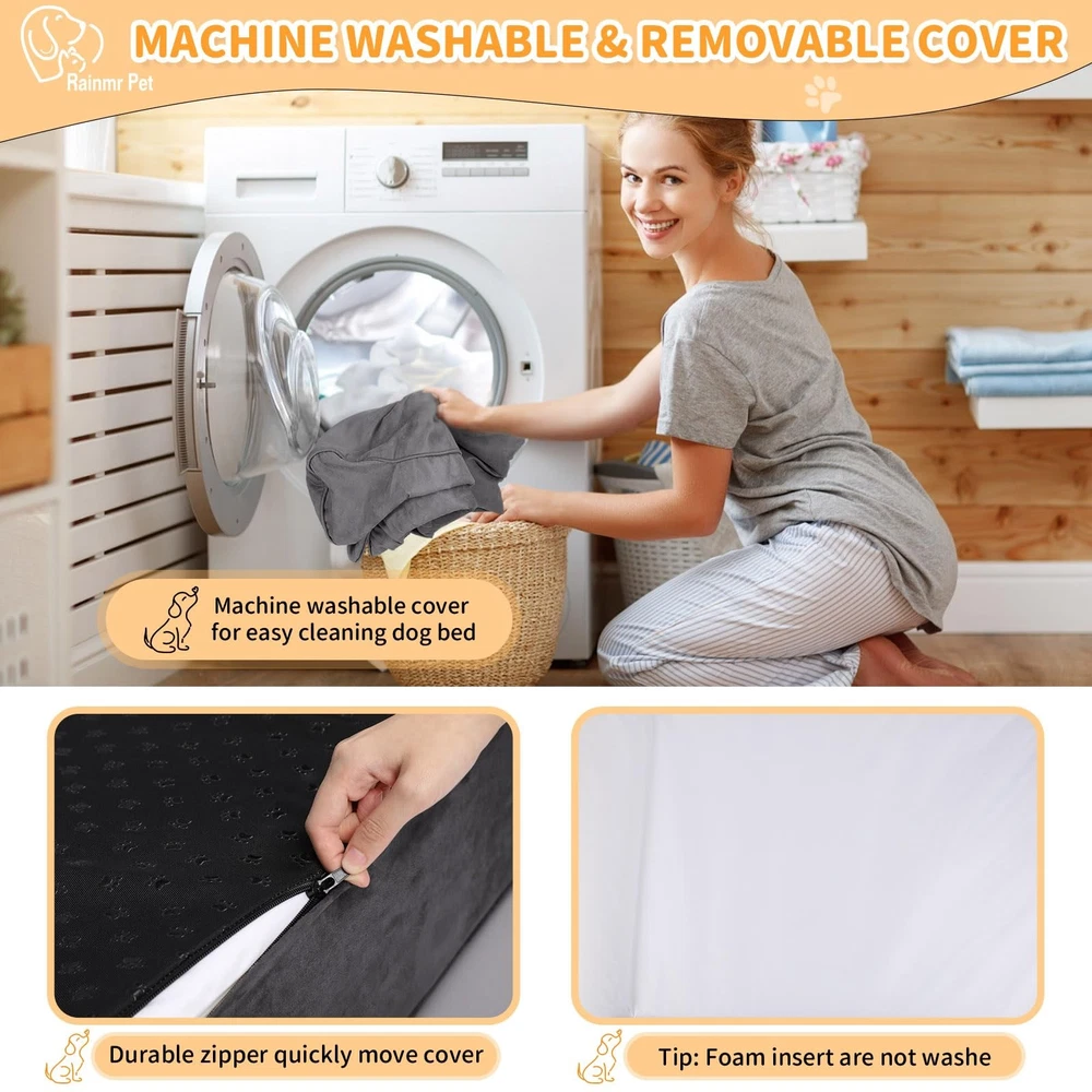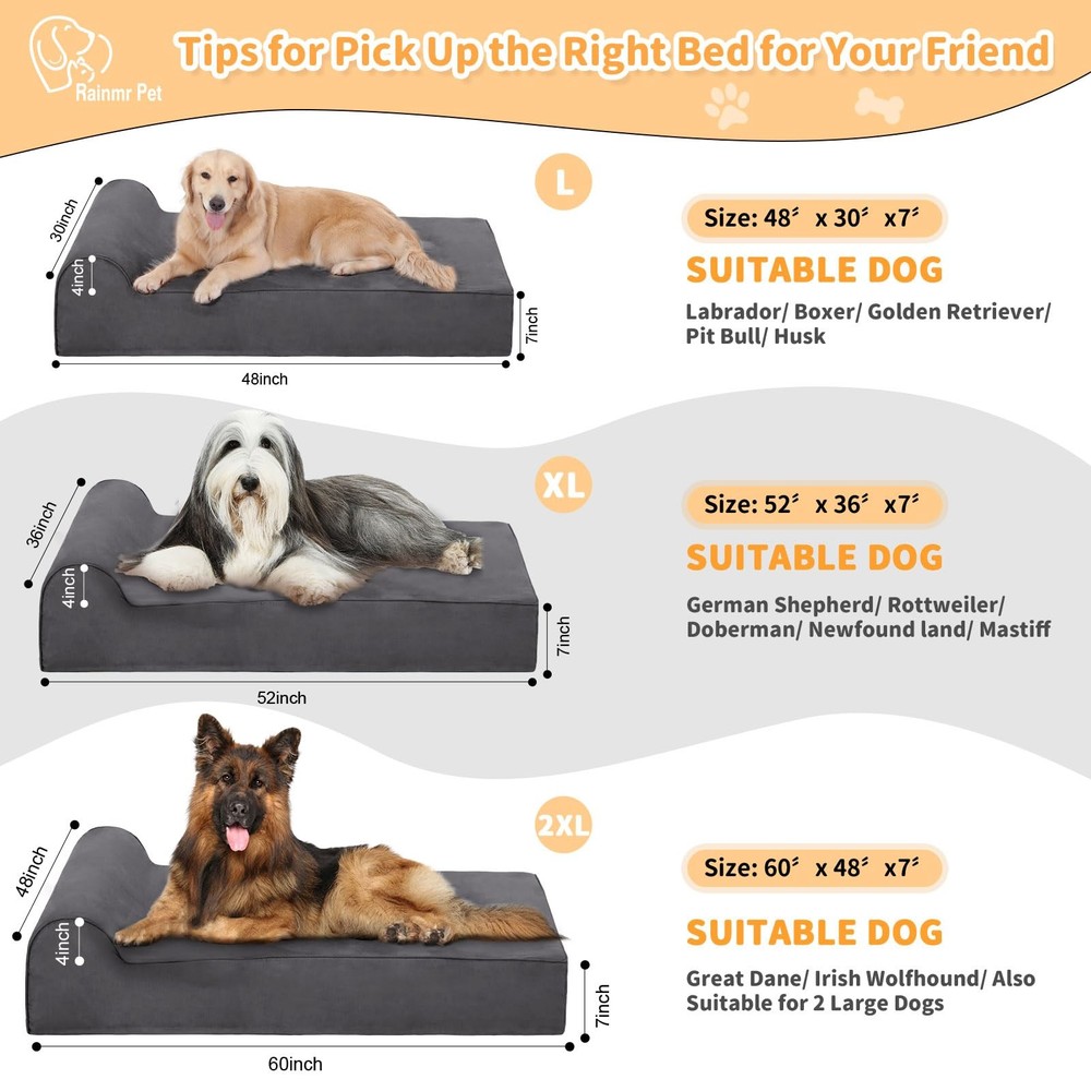 Big Dog Beds Advantages and Features Ultra Soft and Waterproof The orthopedic dog bed surface is made of ultra-soft microsuede material. The thick bed is soft and skin friendly, helping dogs fall asleep quickly. A TPU waterproof layer inside effectively prevents liquids from penetrating. Easy to Clean The dog bed cover is waterproof, removable, and machine washable, making cleaning simple and convenient. The durable U-shaped zipper makes it easy to remove and wash the cover. Strong Support Our extra large dog beds use thick, highly elastic foam sponge for excellent support and long-lasting resilience. They provide softness and comfort that help relieve body and joint pain. Multiple Sizes 1. Dog Bed L: 48 by 30 by 7 inches 2. Dog Bed XL: 52 by 36 by 7 inches 3. Dog Bed XXL: 60 by 48 by 7 inches Material Details 1. Filler: High density memory foam 2. Outer cover: Soft microsuede 3. Waterproof layer: TPU 4. Bottom: Non-slip surface 5. Zipper: Durable U-shaped zipper Removable and Washable Cover: The waterproof dog bed sofa has two layers of covers with high-quality U-shaped zippers, removable and machine-washable. Large dog bed covers are made of soft microsuede material. The fabric is designed to withstand rubbing, digging & nesting. The TPU 100% waterproof lining in the middle easily copes with accidents. This washable dog bed provides a cleaner environment for pets and protects the dog's health. 7 Inch Thick Three Layer Memory Foam Orthopedic Dog Bed: This Orthopedic dog beds are made of 3 layers of high-density sponge and memory foam, effectively and comfortably providing dogs with strong support. A large dog bed helps to relieve body pain and joint pain, promoting a deep sleep. This makes it suitable as a dog cot, or dog beds large sized dog option. Just-Right Size for Medium to Large Dogs: This large dog bed measures 48" x 30" x 7". It is suitable for Labrador, Boxer, Golden Retriever, Pit Bull, Husky, and other large dogs. The large dog bed provides ample space for dogs to stretch out and sleep comfortably in any occasion. The jumbo dog bed can be used in various environments, including dog cages, cars, backyards, indoors and outdoors, offering your dog a comfortable and warm bed at all times. It also fits well as a dog couch, kennel pet bed, or dog beds medium sized dog. Upgraded Non-slip Design: Our dog bed is equipped with an upgraded non-slip bottom that holds the dog bed in place, ensuring your dog feels safe and happy while playing. The 4" headrest pillow is designed to help distribute the body’s pressure on the bed, which is important to maintain your pet’s sleeping position during long sleep periods. Helpful Tip for a Smoother Transition: When you receive your dog bed for large dogs, please allow 24–48 hours for the bed to fully expand to its standard height and shape. To help your dog quickly get used to the new bed, place a blanket, toy, or cushion from their previous bed on top. Familiar scents from their old items can make the transition smoother and more comforting.