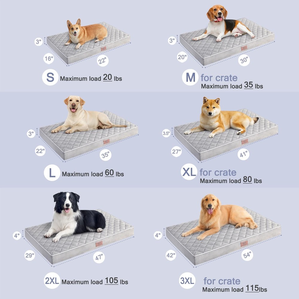 Orthopedic Dog Beds for Large Dogs with Removable Washable Cover, Dog Crate Bed for XXL XL Large Medium Dogs, Velvet Plush Pet beds, Anti-Slip Bottom Sleeping Kennel Pad Mat, Grey 【Waterproof Lining & Ultra-Soft】There is no need to worry about the dog wetting the large dog bed, because there is a waterproof layer under the plush surface of the dog crate bed, which can prevent liquid leakage and fully protect the egg foam. 【Velvet Surface & Anti-slip Bottom】Cozy dog bed pad has an ultra-soft velvet sleep surface and it provide the perfect balance of comfort and breathability as well as better protection against biting, scratching, damage.There are non-slip plastic dots on the bottom of the dog crate bed, so as to bring a sense of security to the dog, keep it in place when your dog is playing. 【Washable Dog Bed】Waterproof pet bed with zippered removable cover that's machine washable for quick cleanup and no-fuss care, Just get the egg foam off, without your concern. and your pet mattress can be clean and soft as new. 【Orthopedic Dog Bed Support】Softer and more supportive than memory foam dog beds our orthopedic large dog bed with 3” high mattress design provides even weight distribution to cushion hips, heads, and tails. It relieves muscle tension and encourage restful sleep. 【Multiple Sizes & Suitable For Any Scenario】There are 5 different sizes, it's a suitable dog bed pad for medium, large and extra large dogs.The dog bed can be used in a variety of scenarios, including dog cages, cars, indoors and outdoors.It can be used as a crate mat, kennel bed, cage bed, or even as a dog travel bed in a car or truck.