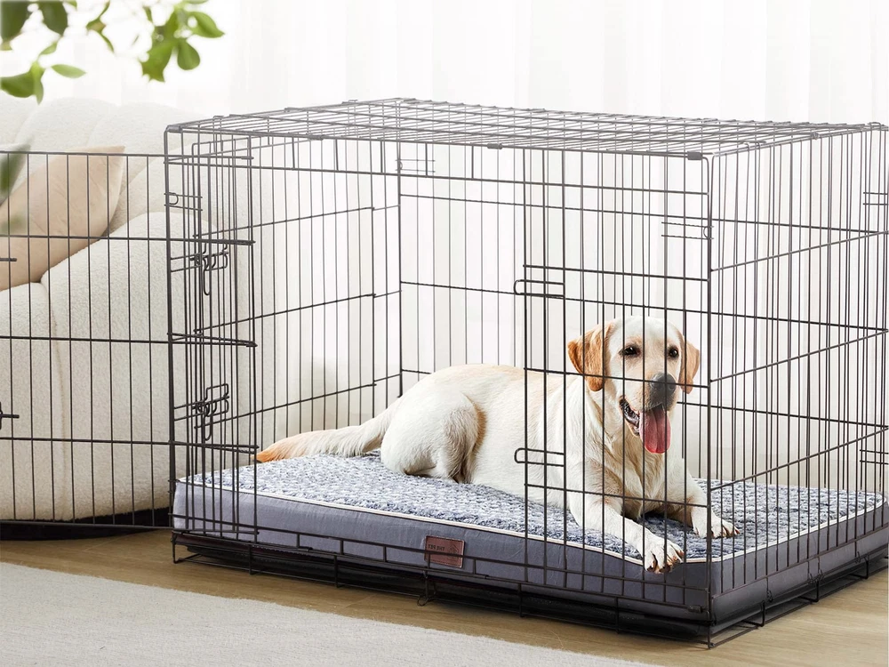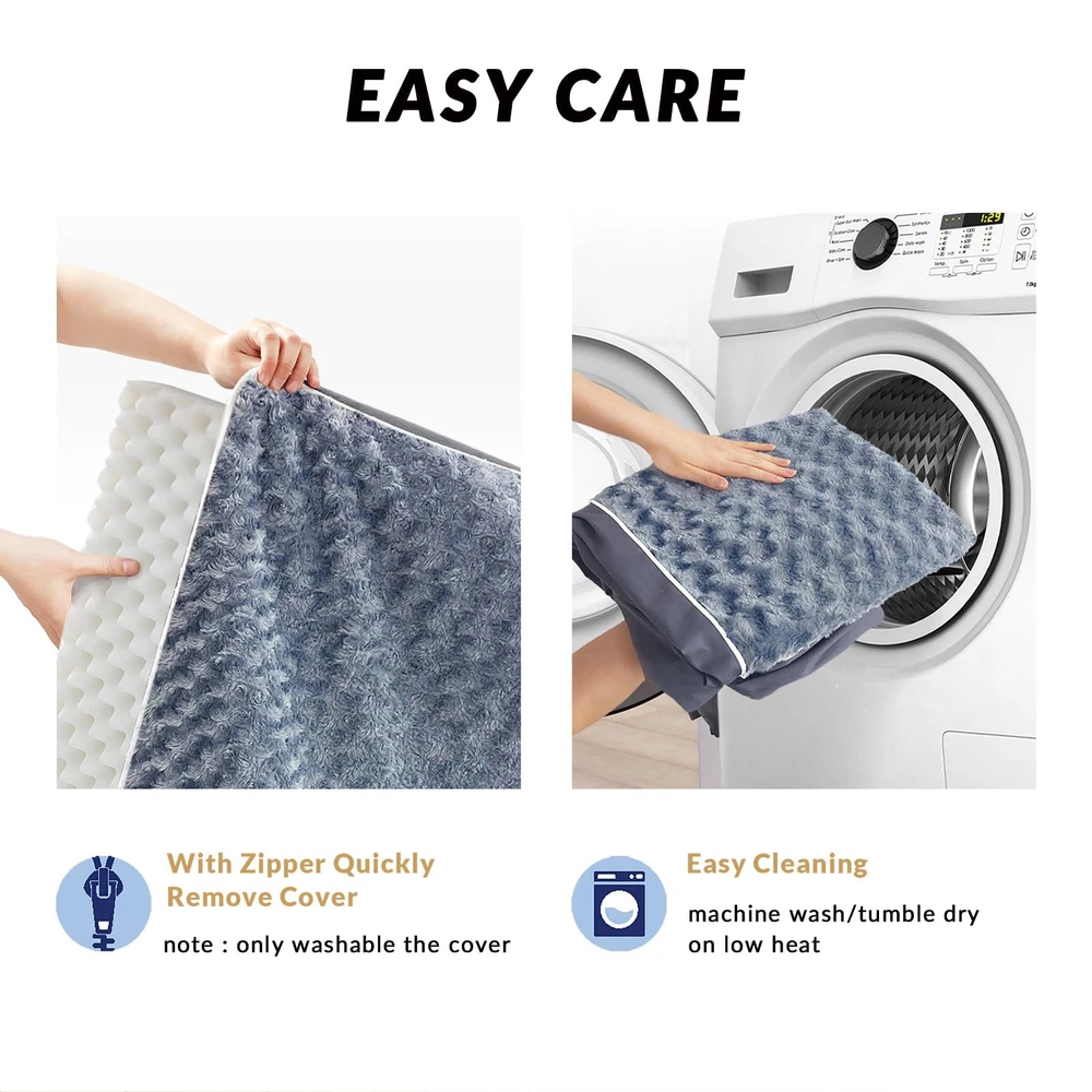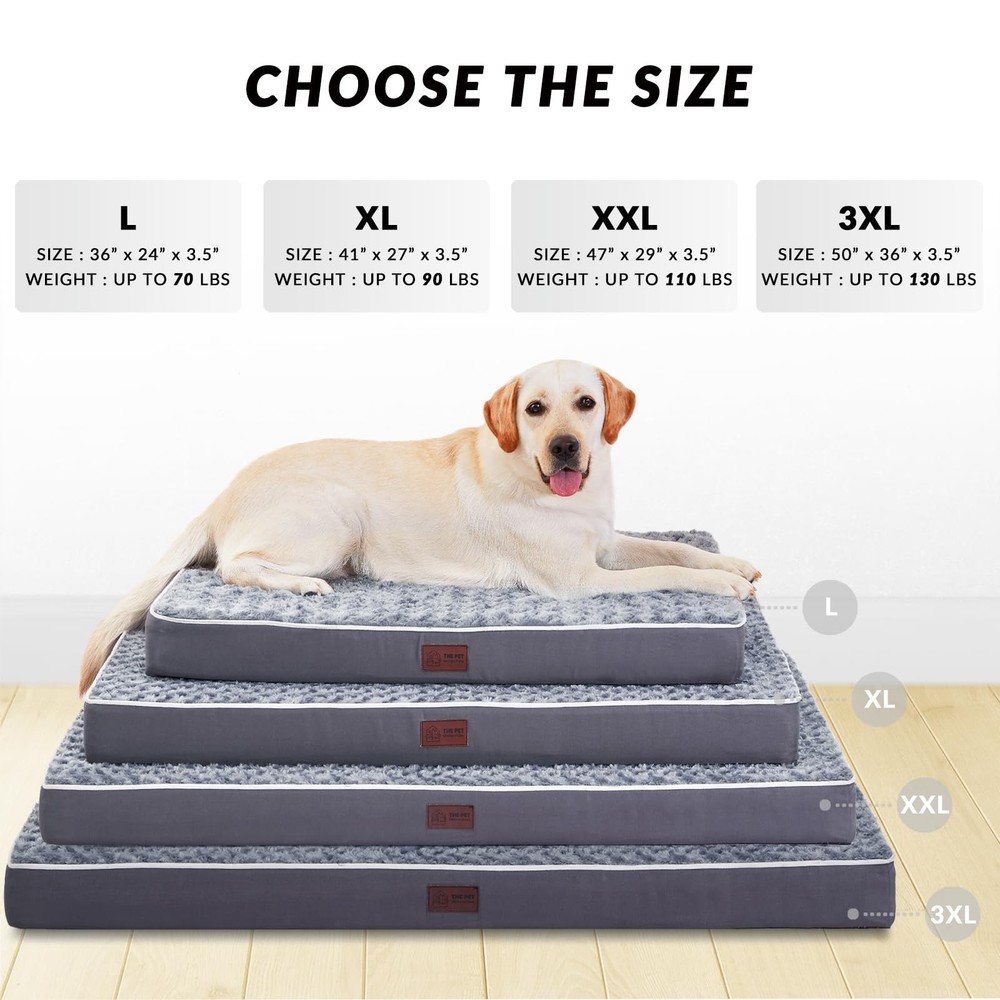 Dog Bed for Large Dogs Memory Foam - The large orthopedic dog bed is filled with double layers of memory foam, the top blue sponge is soft and the bottom white sponge is supportive. And the memory foam can gradually soften as the dog's body temperature rises, evenly supports the dog's whole body, keeps the dog in the most comfortable posture, and effectively relieves the dog's fatigue and the bone and joint pain of the elderly dog Removable and Machine Washable Cover - Waterproof pet bed with zippered removable cover that’s machine washable for quick cleanup & no-fuss care, zip it up or off for convenient cleaning! Just throw cover and lining in the washer, they’ll be great as new Soft Surface Materials and Anti-Slip Bottom - This large dog crate bed with a super soft faux fur sleeping surface on the outside of the memory foam dog beds, with an eye-catching rose pattern for a luxurious look, the dog is extremely comfortable to lie down on. The bottom is equipped with non-slip points to make the dog bed not easy to move. Note that it is not resistant to pet bites Size & Suggestions -The extra large dog beds comes in four sizes to fit large dogs 70-130 lbs and is approximately 3.5 feet tall. This dog mat is very suitable for large and elderly dogs as well as dogs with arthritis, and different models of dog beds can be selected according to the actual situation Waterproof liner & Wide Range of Applications - The dog kennel bed with white waterproof lining for wrapping memory foam and preventing liquid leakage. In addition, the pet beds can be used in a variety of places, can be used with dog cages, brackets