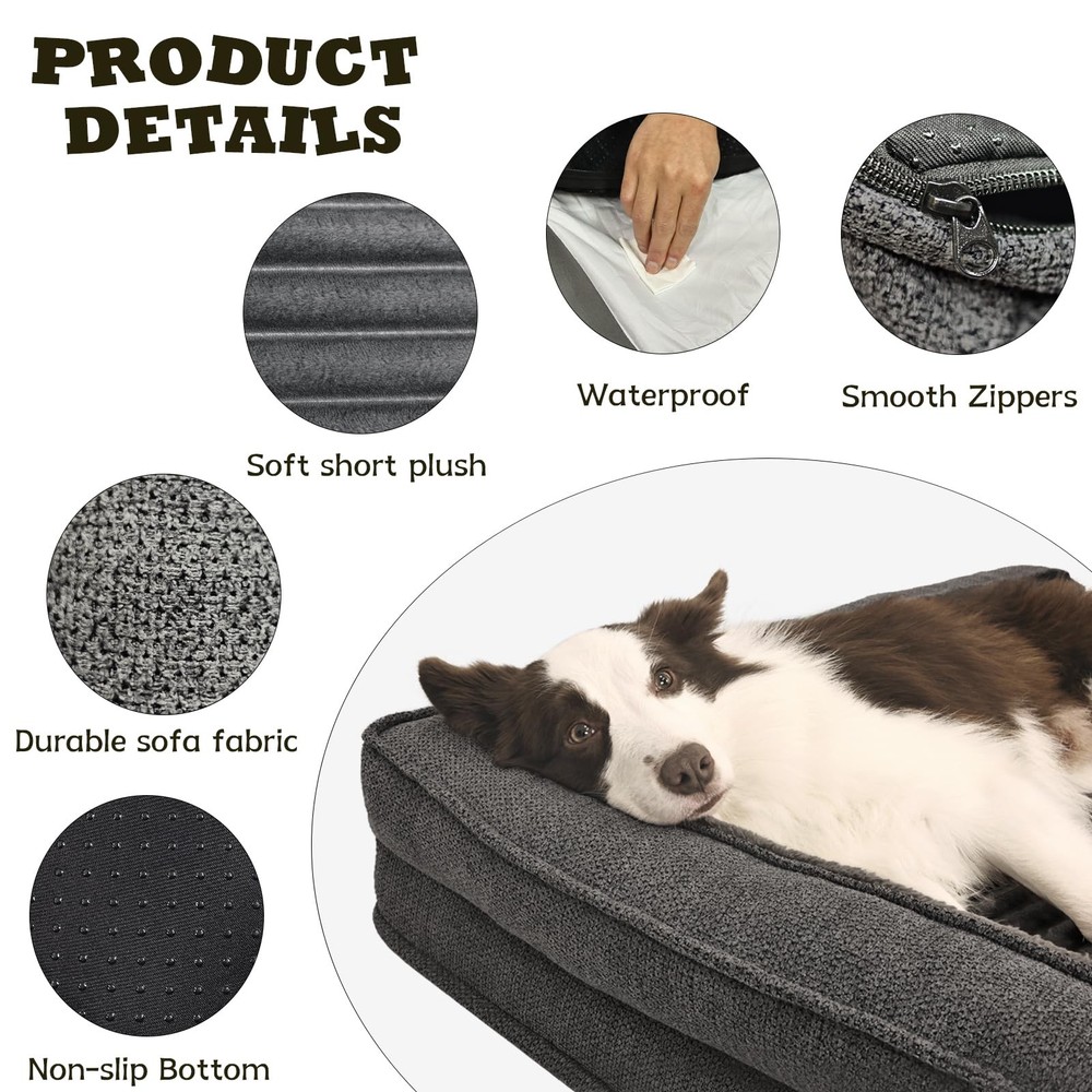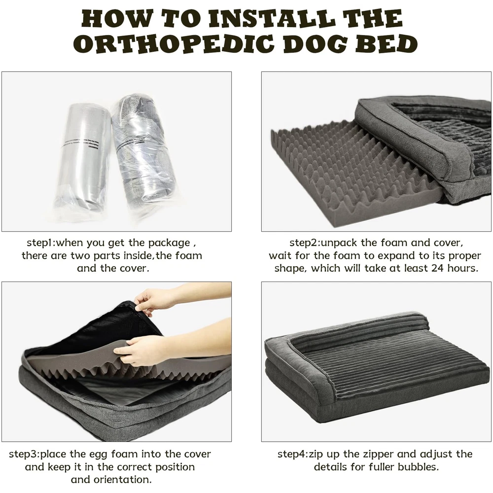 Orthopedic Dog Beds for XLarge, Large Dogs, Waterproof Egg Foam Dog Sofa Bed with L Bolster Sides, Washable XLarge Pet Bed with Removable Cover & Non-Slip Bottom, 40 x 28 inch, Gray 【Orthopedic Foam Support】This dog bed is made up of orthopedic egg foam that evenly spreads the pressure on your dog and is well supported, so it's great relief for dogs with arthritis and older dogs to ensure they have a better night's sleep. 【2-sides dog bed】The large dog bed has 2 pillows, the L-shaped design on both sides can be extra good support for the head and neck, and the other remaining large space can give the dogs better sleeping space, so that the dogs get all over the body to relax and sleep better. 【Soft Surface】Corduroy fabric provides a cozy warm feeling, giving your dog a more comfortable and warm space to rest in. 【Size-XLarge】The xlarge dog bed is 40*28*7 inches, suitable for dogs not more than 80 pounds, if you want to give your dog more space, it is recommended to buy a larger dog bed. 【Easy To Clean】The dog beds for large sized dog has a removable and washable and pillow cover, the large dog bed can also be easily machine washed, please zipper up the zipper and put it in the washing machine before washing, please tumble dry at low temperature or dry in the sun. The Anti-slip bottom prevents sliding when the dog gets in. 【Warm Tips】Please open the package and leave it for at least 72 hours after receiving it to ensure that it forms a full shape, or you can manually make it better full.