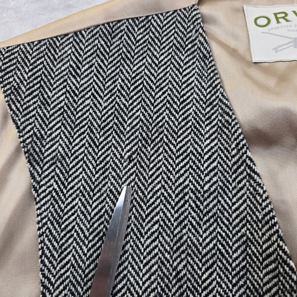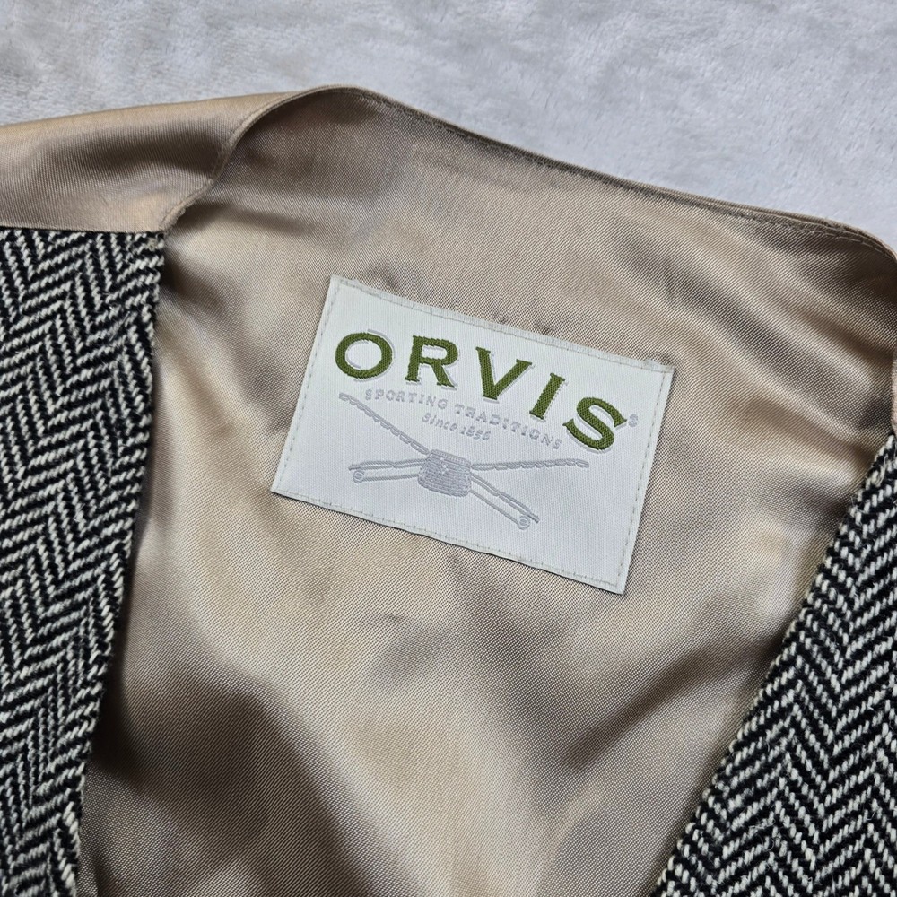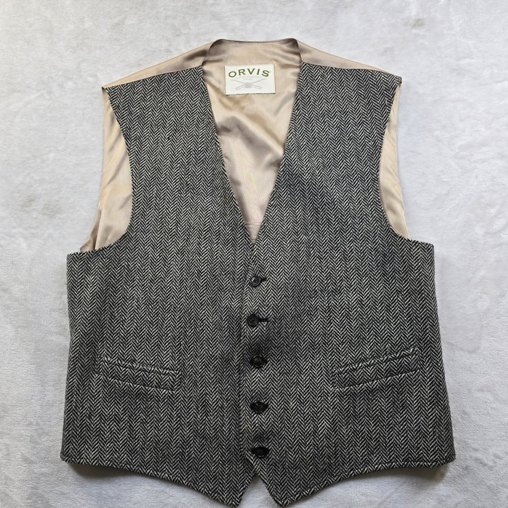 This classic Orvis vest features a timeless black and white herringbone pattern, perfect for adding a touch of sophisticated country style to your wardrobe. Crafted with a full button front and a smooth satin-like back with an adjustable cinch for a tailored fit. No size/material tag on item, size based on measurements seen in photos. • Brand: Orvis • Size: Men's M • Color: Black and White • Material: Herringbone wool blend (inferred) • Notable Features: Five-button closure, two front welt pockets, adjustable back strap Condition: Good pre-owned condition. There is a small snag/pull on the front left chest area (pointed out in photos). Please see all photos for condition and measurements. Orvis, Herringbone, Vest, Waistcoat, Mens, Medium, Tweed, Country, Equestrian, Formal, Layering, Classic, Traditional, Sporting, Wool