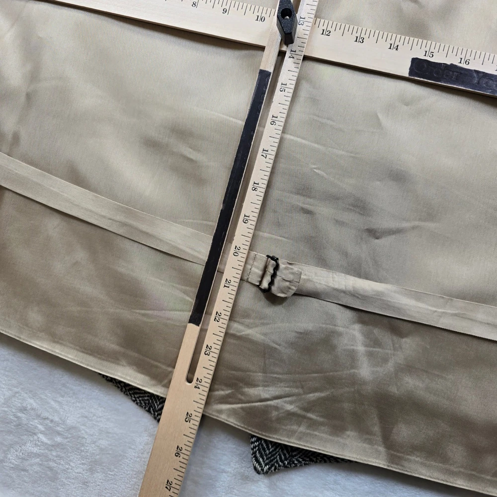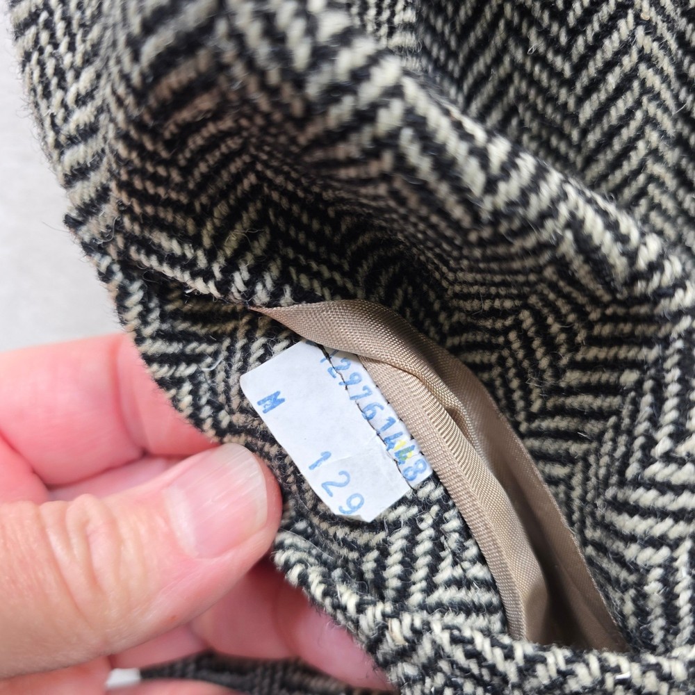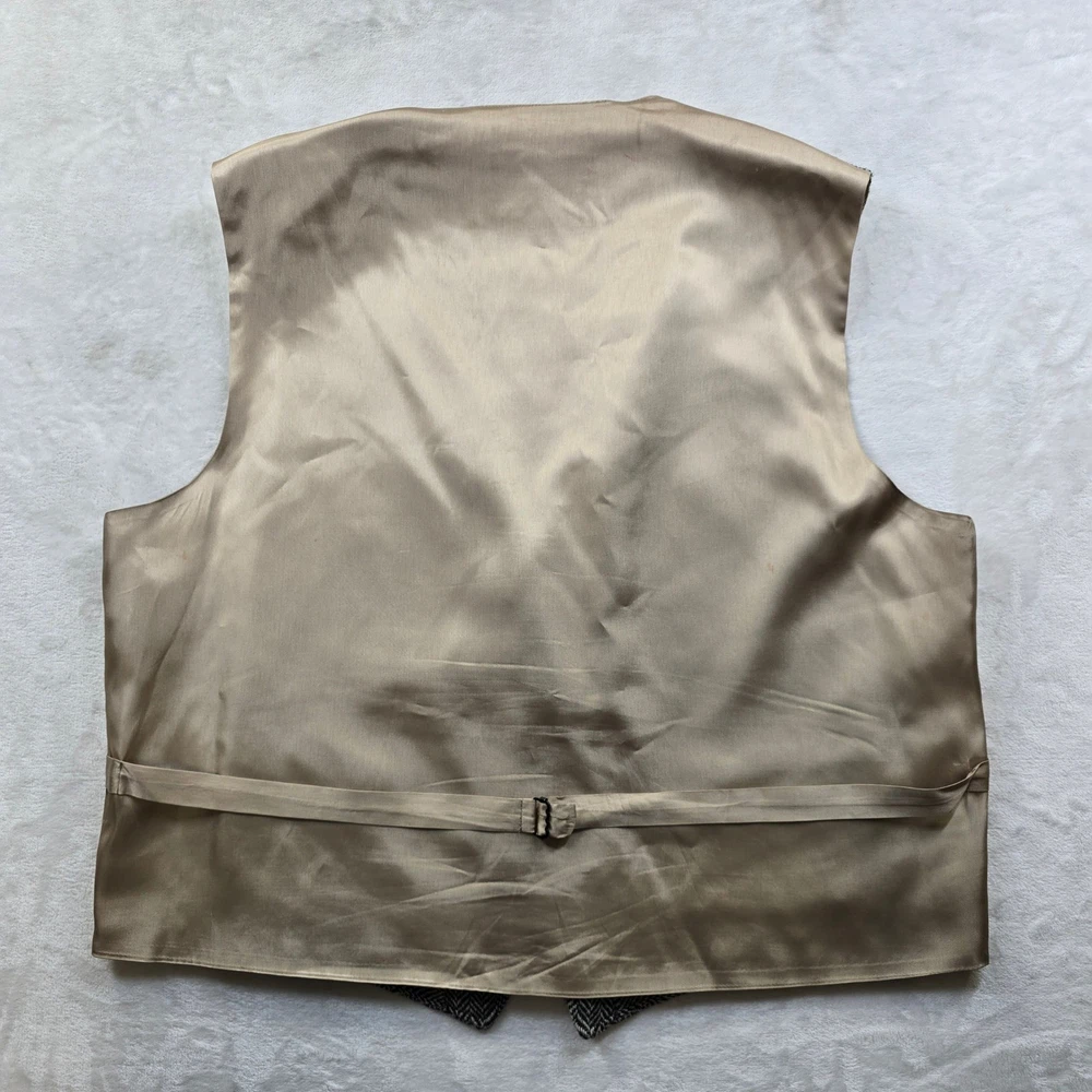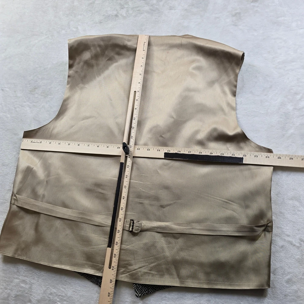 This classic Orvis vest features a timeless black and white herringbone pattern, perfect for adding a touch of sophisticated country style to your wardrobe. Crafted with a full button front and a smooth satin-like back with an adjustable cinch for a tailored fit. No size/material tag on item, size based on measurements seen in photos. • Brand: Orvis • Size: Men's M • Color: Black and White • Material: Herringbone wool blend (inferred) • Notable Features: Five-button closure, two front welt pockets, adjustable back strap Condition: Good pre-owned condition. There is a small snag/pull on the front left chest area (pointed out in photos). Please see all photos for condition and measurements. Orvis, Herringbone, Vest, Waistcoat, Mens, Medium, Tweed, Country, Equestrian, Formal, Layering, Classic, Traditional, Sporting, Wool