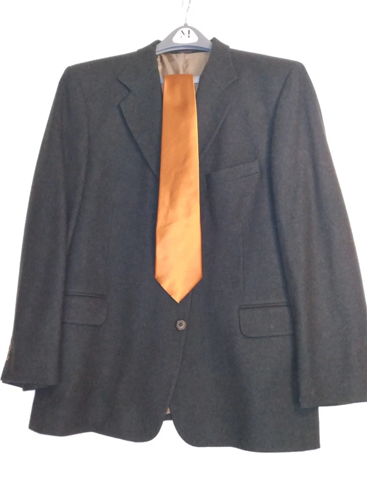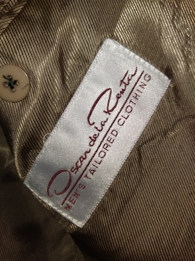 Oscar de la Renta Sport Coat NO size tag ESTIMATED/measured at 46 regular Dark, dark green with flecks of brown and burnt orange Lightweight wool Necktie pictured comes with. Length laying flat, bottom of collar to hem = 33 inches Shoulders, laying flat = 19 Chest, laying flat = 23.5 Sleeve = 26