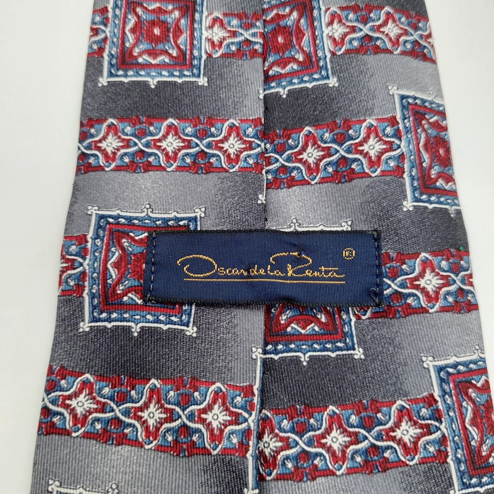 Oscar de la Renta Men's Geometric Necktie Tie Gray Red 100% Silk 57" Vintage