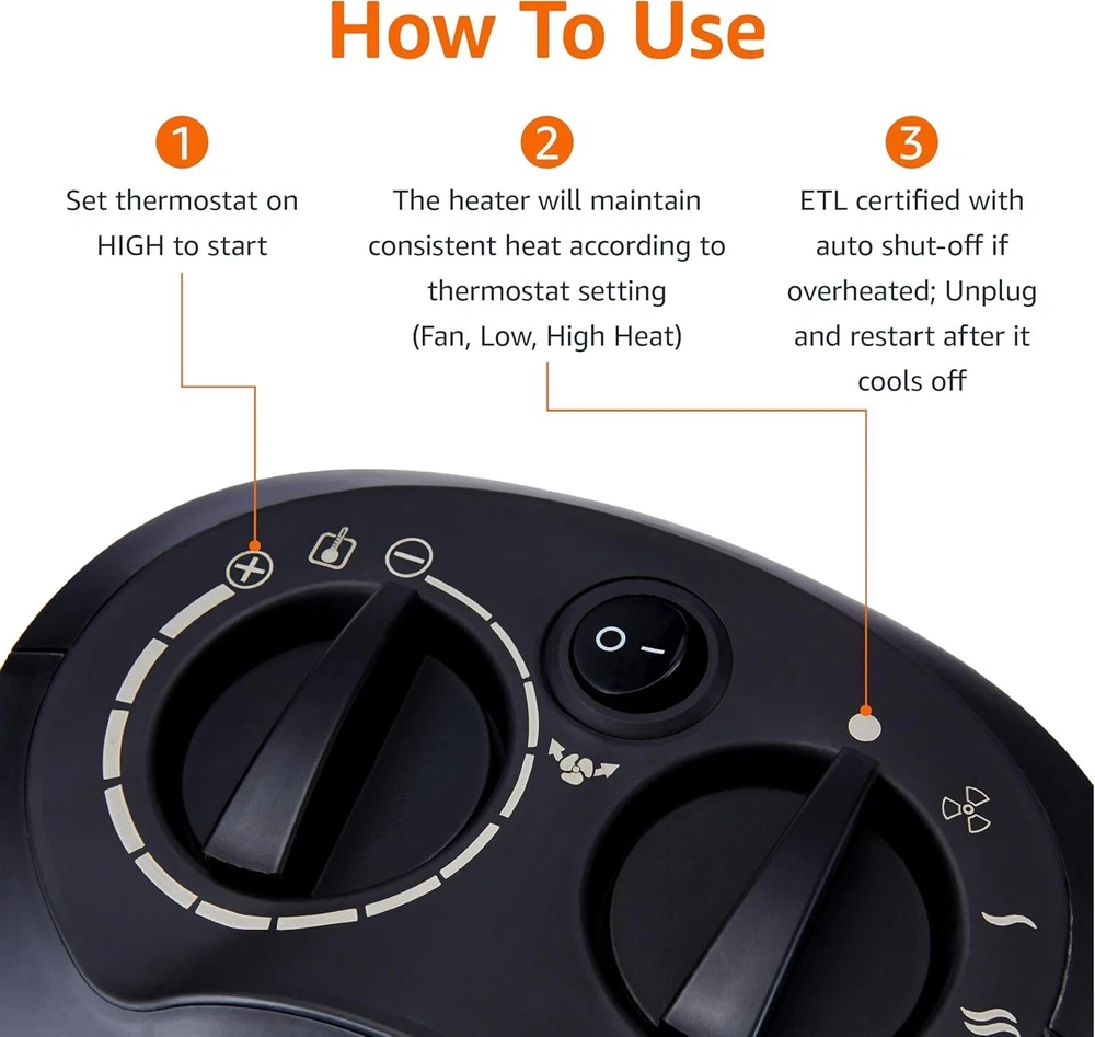 Oscillating Ceramic Space Heater, Portable Heater for Indoor Use, for Office and Home, With Overheat and Tip-Over Protection, Thermostat, 1500W, Black, 7.52"D x 6.34"W x 9.45"H Description: EVEN HEAT DISTRIBUTION: The heater's 45-degree oscillation function ensures even heat distribution across the room, warming a wider area for maximum comfort. CUSTOMIZABLE HEATING OPTIONS: Choose from three settings to suit your needs - High (1500W), Low (900W), or Fan Only for air circulation without heat. COMPACT & PORTABLE: Weighing just 3 lbs and sized at 7.5“L x 6.3”W x 9.5“H, this space heater is easy to move and perfect for your Home, Office. CERTIFIED SAFETY: TÜV-Certified for peace of mind, with built-in Tip-Over Protection, Overheat Protection, and a Power Indicator Light for safe operation. RAPID HEATING TECHNOLOGY: Ceramic heating provides fast and efficient heat in minutes, keeping you warm quickly on cold days. NOT FOR HUMID ENVIRONMENTS: Please avoid using this heater in Bathrooms, Laundry Rooms, or other high-moisture areas.