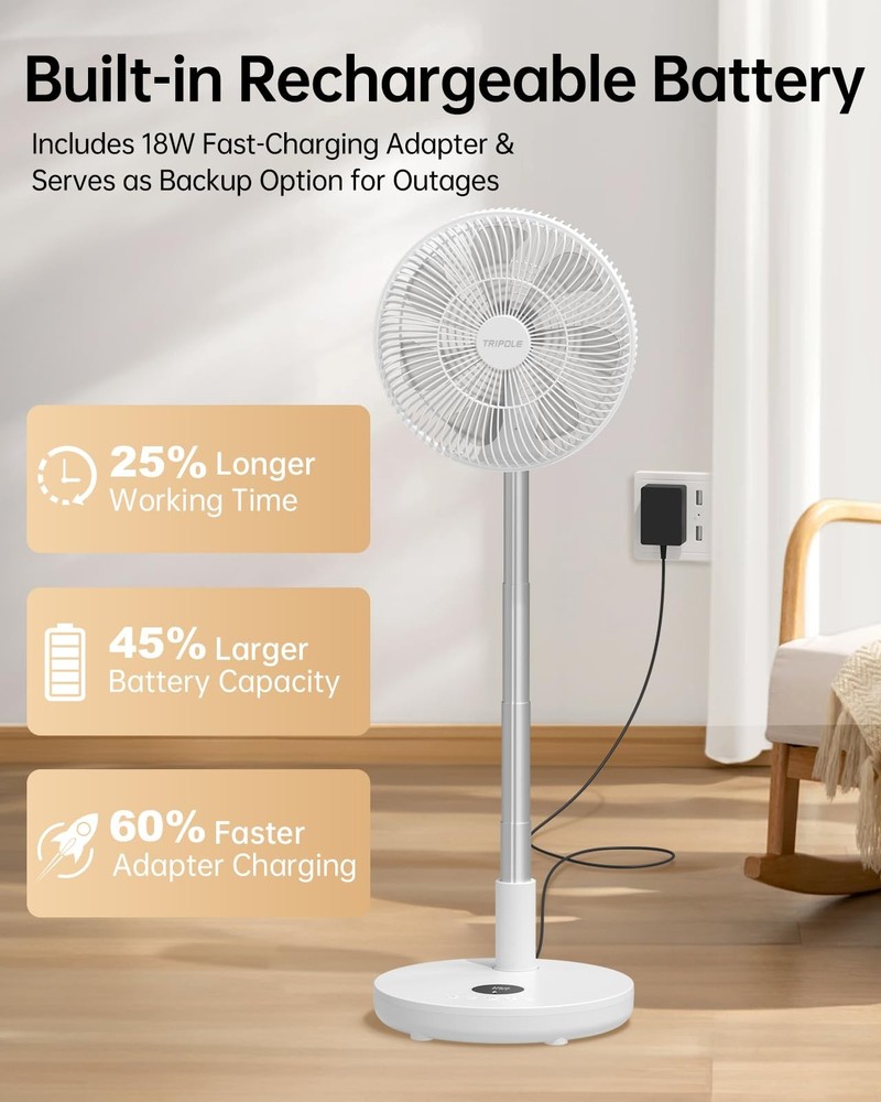 Reusability:RechargeableBatteries Included?:YesIncluded Components:Remote, Dc AdapterNumber of Blades:7Power Source Type:Battery PoweredType:Does not applyNumber Of Boxes:1Wattage:44.4Package Dimensions LxWxH:13.27x13.27x7.68 InchesMounting Type:Floor MountModel Number:Kw12Room Type:Bedroom, Home OfficeUPC:Does not applyNumber of Speeds:6Number Of Lithium Ion Cells:3Brand:TripoleInstallation Type:PortableSwitch Type:Push ButtonBatteries Required?:YesElectric Fan Design:Floor FanNumber Of Power Levels:6Style:ModernSize:12 InchColor:Pure WhiteIs Cordless:YesMotor Type:Dc Brushless MotorIndoor Outdoor Usage:Indoor, OutdoorUnit Count:1.0gtin13:Does not applyRecommended Uses For Product:Cooling, Air CirculationModel Name:Kw12Control Method:Remote, TouchWeight:5.47 PoundsController Type:Remote ControlBattery Weight:210.0Finish Type:White