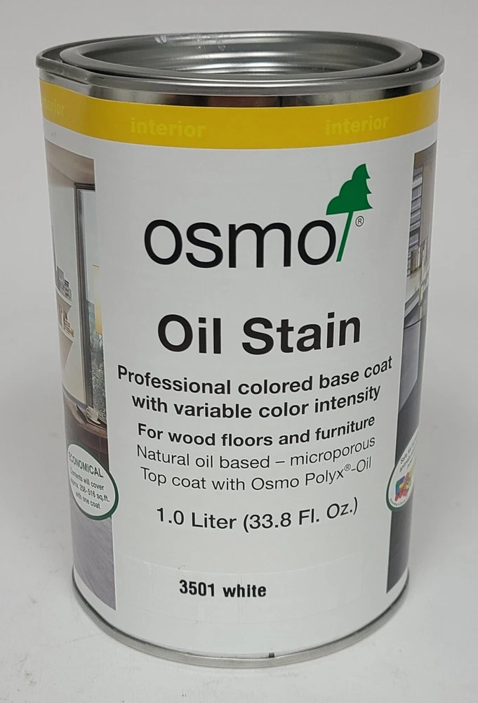 Osmo Oil Stain Wood Finish 3501 WHITE Interior 1.0 L Dented Can Can may be dented, missing the original label or a minor amount of oil. Contents still good. Natural oil-wax based - microporous Top coat with Osmo Polyx-Oil Coverage rate: 1.0 liter can covers 258-516 square feet
