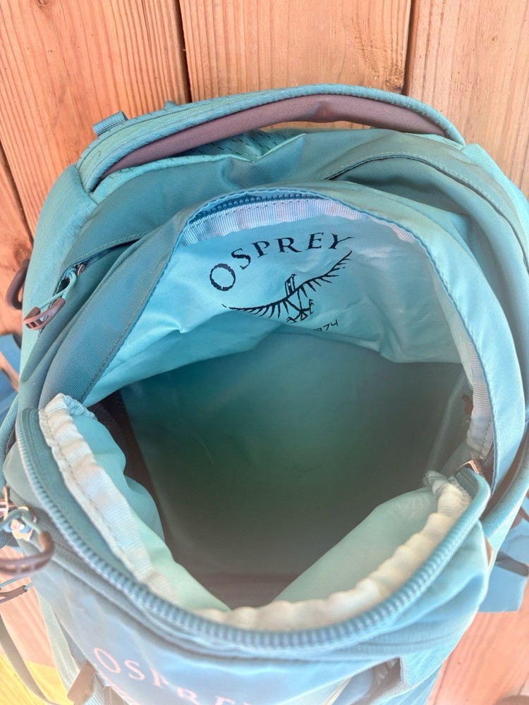 Vintage: No Size: One Size Personalized: No Handle/Strap Material: Nylon Pocket Type: Multi Purpose Closure: Zip Material: Nylon Sport/Activity: Backpacking Color: Teal Number of Pockets: 7 Capacity: 46 L Frame Material: Nylon Insect Repellent Treated: No Type: Backpack Features: Adjustable Size, Collapsible, Divider System, Ergonomic Handle, External Pockets, Foldable, Harness, Hidden Compartment, Hip Belt, Lightweight, Multifunction Compartment, Padded, Padded Straps, Sling Strap, Water Resistant, Zip Fastener Department: Unisex Adults Brand: Osprey