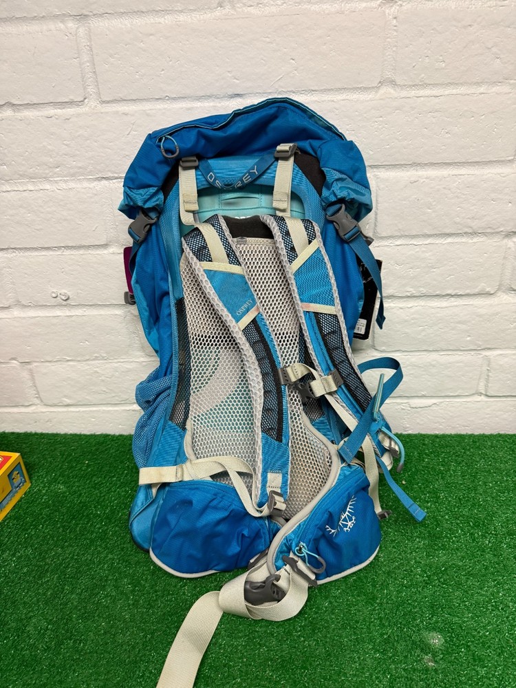 Gently used Osprey backpack in great condition. All straps, zippers, and buckles work perfectly. Light signs of yellowing (see photos). Ideal for hiking, camping, or travel. Lightweight yet durable build with plenty of compartments for organized packing. Ships quickly and securely.