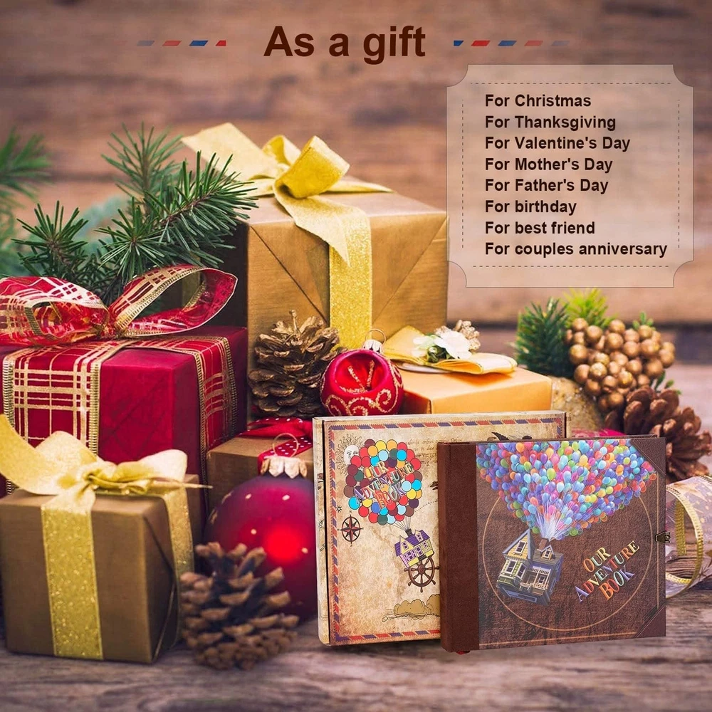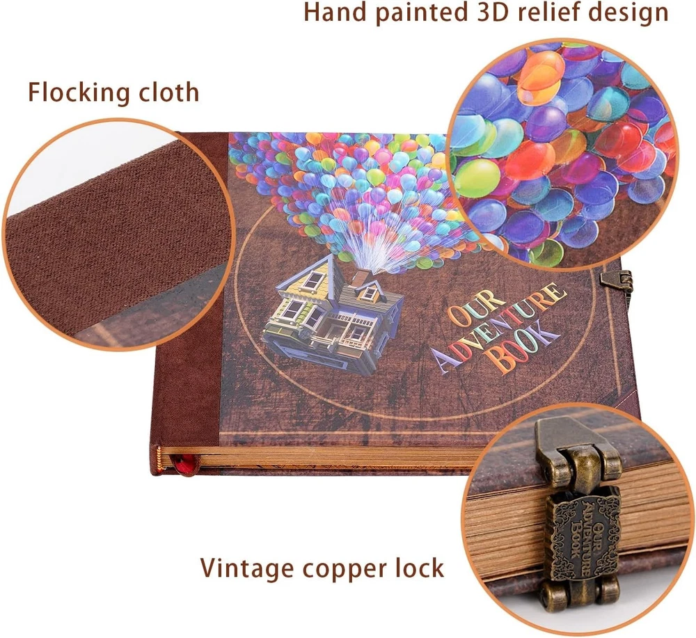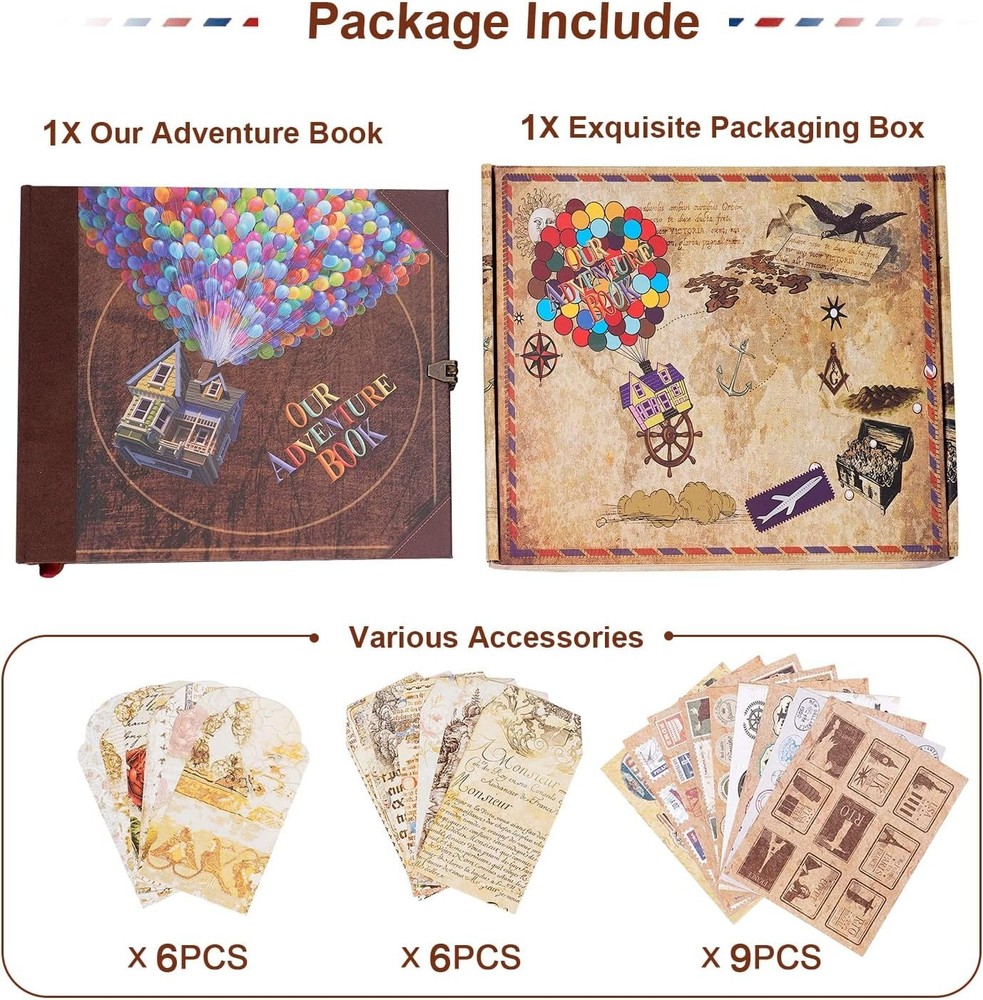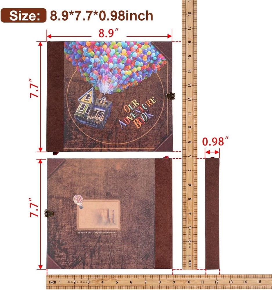 Our Adventure Book Scrapbook Photo Album,Retro Style Embossed Letter Cover Travel Diary Journal Scrap Book Kit For Couples,Memory Book For Anniversary Wedding Scrap book for "L x "W x "H. 73 sheets(146 pages) hold over 300 Adventure Book Scrapbook has a sturdy craft paper bag on the back,can store stamps, travel tickets,etc. Date adventure book:You can DIY photos any way you want,made for a collection of retro-style is a best gift memory book for couples. This anniversary book included pack with exquisite gift box x1, several bookmark cards, several stickers. Up house scrapbook design:Three-dimensional font cover and retro classic hardcover notebook of thick craft paper, non-fading, each scrapbook contains a variety of different retro page also is a good gift for kids school photo album. Travel Scrapbook:A perfect size DIY our adventure book travel journal diary picture book,and you can put it in a backpack while traveling.Adventure challenge couples scratch off book. Artwork Gift Idea:The perfect artwork details, packaging and DIY customization make it an amazing birthday gift,Christmas gift, Thanksgiving gift, Mother's Day gift, Father's Day gift and Valentine's Day is a perfect gift for your best friends, anniversary,Memory book for couples for womens day. Love home love Making life instersting
