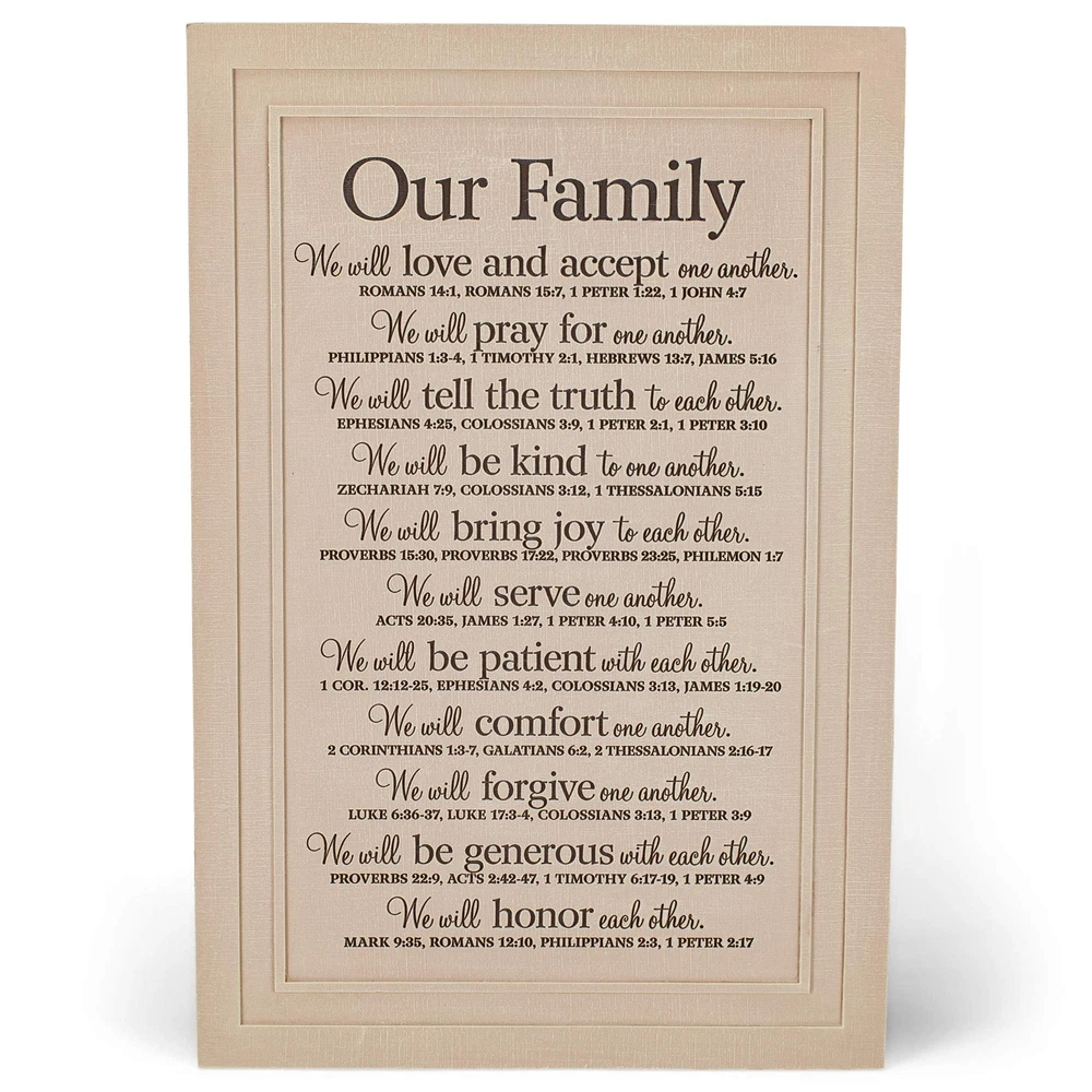 11 1/4 x 16 3/4large our family wall plaque. We are known for our high quality and our design team creates innovative, visually appealing and spiritually uplifting encouragement products that will appeal to you. Every product we sell has a well-chosen Scripture incorporated into the design. In addition, each Lighthouse product comes with of three booklets - power of the cross, your new life, or the source of hope. Each of the booklets shares a message of hope from God's word. plaque features textured cream design Made of reconstructed concrete to simulate natural-cut stone with ready to use wall hanger Measures approximately 11.25 x 16.75 Inches; Display as a decorative wall piece Your purchase helps support orphans and children with special needs in Ghana, Africa