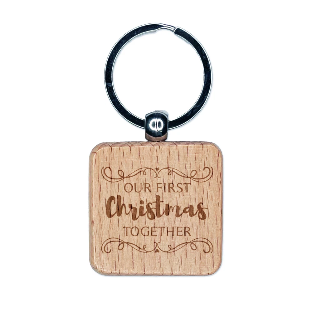 Our First Christmas Together Filigree Engraved Wood Square Keychain Tag Charm