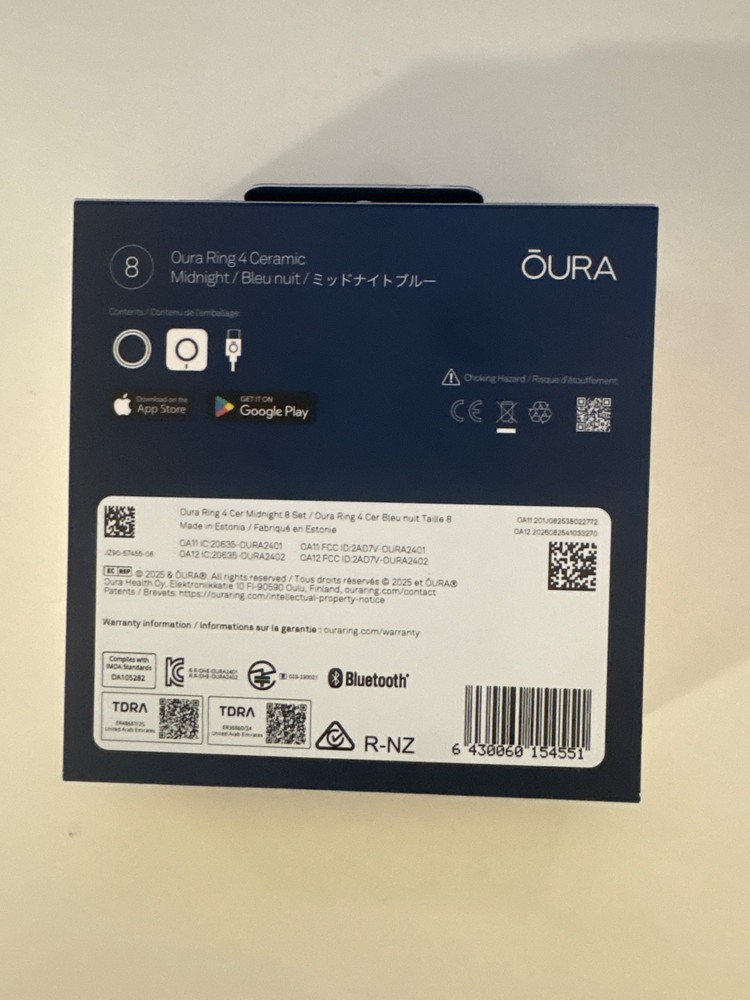 The Oura Ring Gen 4 Health Fitness Smart Ring in Ceramic Midnight, Size 8, is a brand new activity tracker designed for unisex adults. It features a 240 x 240 display resolution, heart rate measurement system, and up to 7 days of battery life. This smart ring, suitable for both indoor and outdoor activities, also includes a sleep tracker and runs on the Android operating system. With its sleek ceramic design and advanced sensors like the accelerometer, the Oura Ring Gen 4 is a perfect tool for tracking your fitness and health goals, especially for those interested in running and jogging.