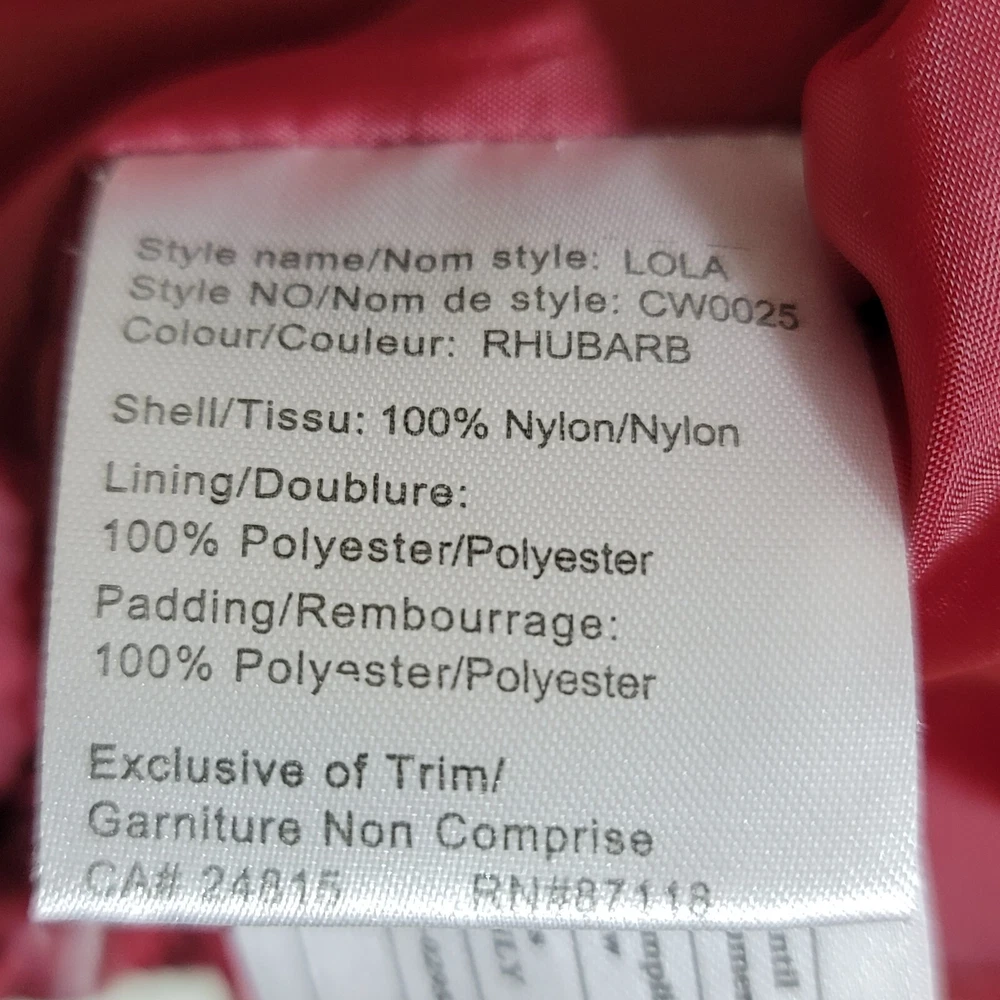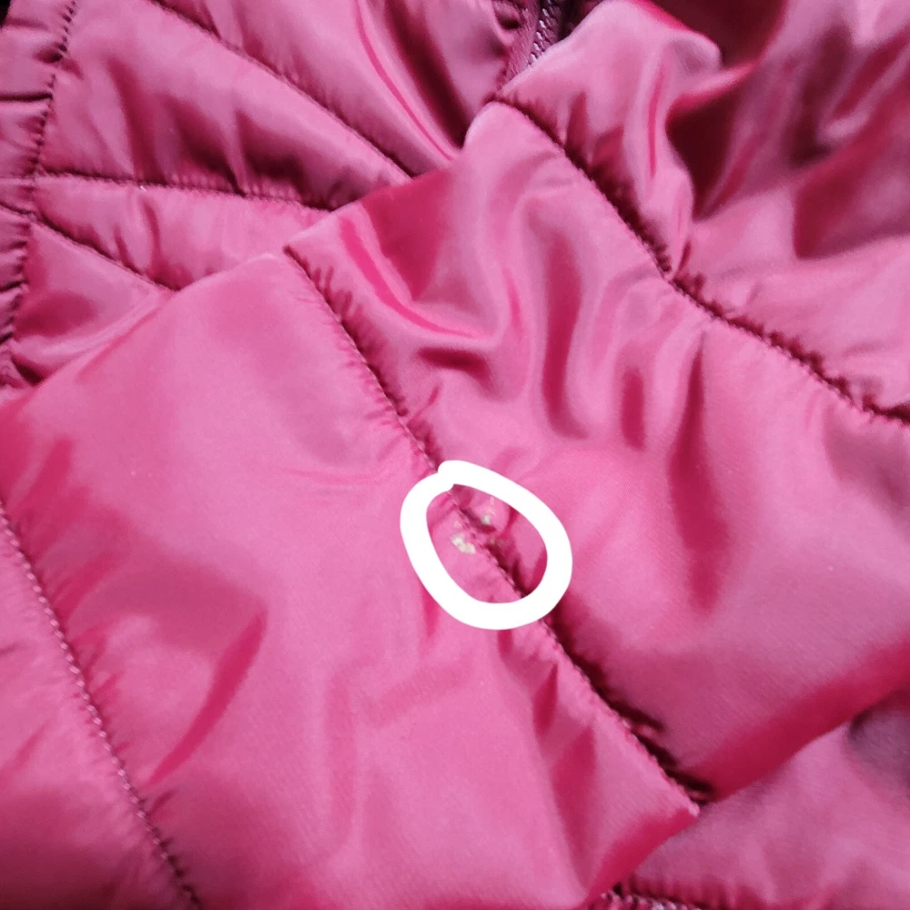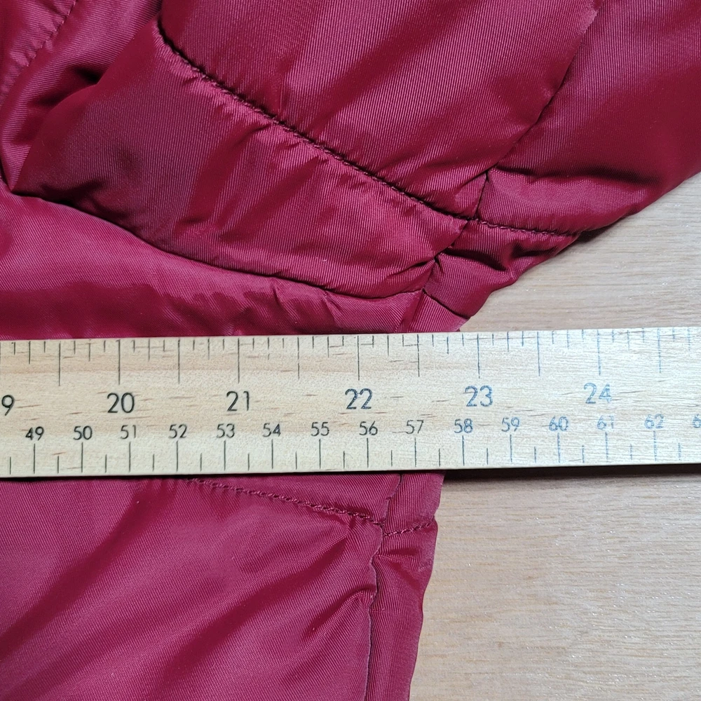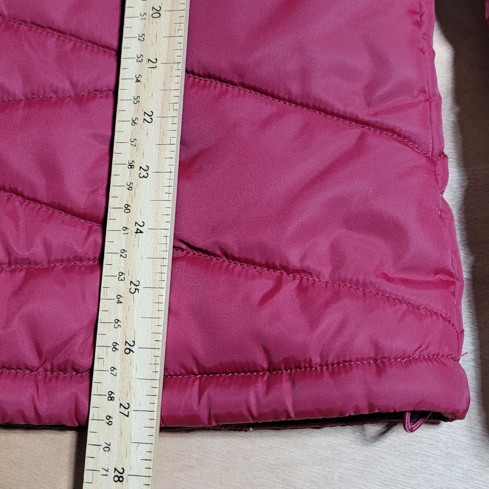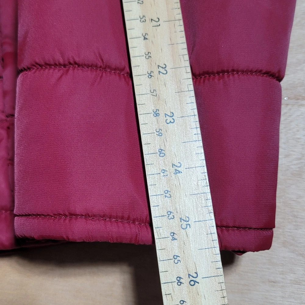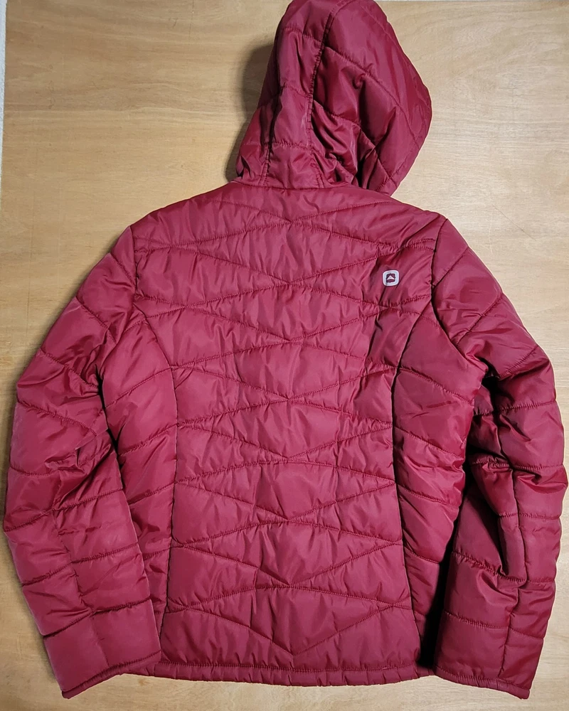 OutBound Jacket Womens XL Burgundy Lite Hooded Long Quilted Small spot on sleeve, see photo for more detail. otherwise very nice coat I ship ups during Canada strike