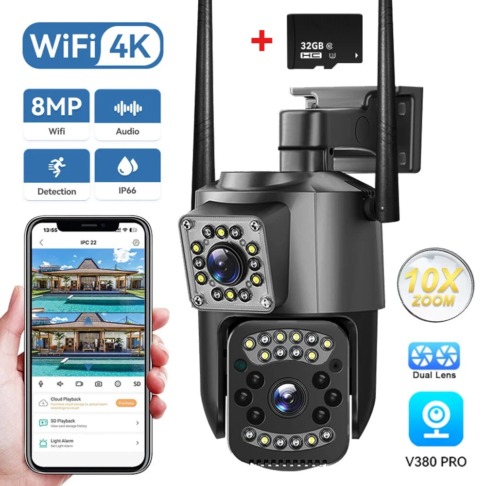 Features : 1. 2K 4MP (2MP+2MP) HD Dual Lens Network IP Camera For Indoor&Outdoor 2. Dual light source design, built-in 8 pcs infrared light + 8 pcs white light, night vision infrared and night vision full color can be set; 3. Pan&Tilt: horizontal 0~350 degrees, vertical 0~90 degrees; 4. 2.4G WIFI + RJ45 network port for Internet access; 5. power supply DC 12V/2A 6. Dual Design, Support SD / TF storage and cloud storage; 7. Two-way voice intercom, two-way video synchronous recording and playback 8. Humanoid detection/vehicle detection/pet detection/other detection 9. Automatic tracking/movement alarm, alarm output sound and light linkage; 10. AI intelligent algorithm to achieve video 3D positioning and continuous tracking of target alarms; 11. Support Android/IOS APP remote management (V380 Pro). Real Two Way Audio Notice: APP: V380 PRO does not support 10XZOON 350° Pan Rotates & 90° Tilt Rotate Rotates 350° Horizontally and 90° Vertically, 80° View Angle You can control it in the "V380 Pro" app directly whenever you want and wherever you are . AI Humanoid Detection When the security ip camera detect motion, Led show up to scare thief. This security analyzes visitor's body shape and identify human immediately. This smart home camera will capture the human's abnormal movements. Dual Screen Live video one camera can monitor two positions,which is equivalent two cameras,saving you more money. IP66 Waterproof / Dustproof The camera case is made of high-quality ABS plastic, which is waterproof, sun-proof and dust-proof. It is suitable for any environment.