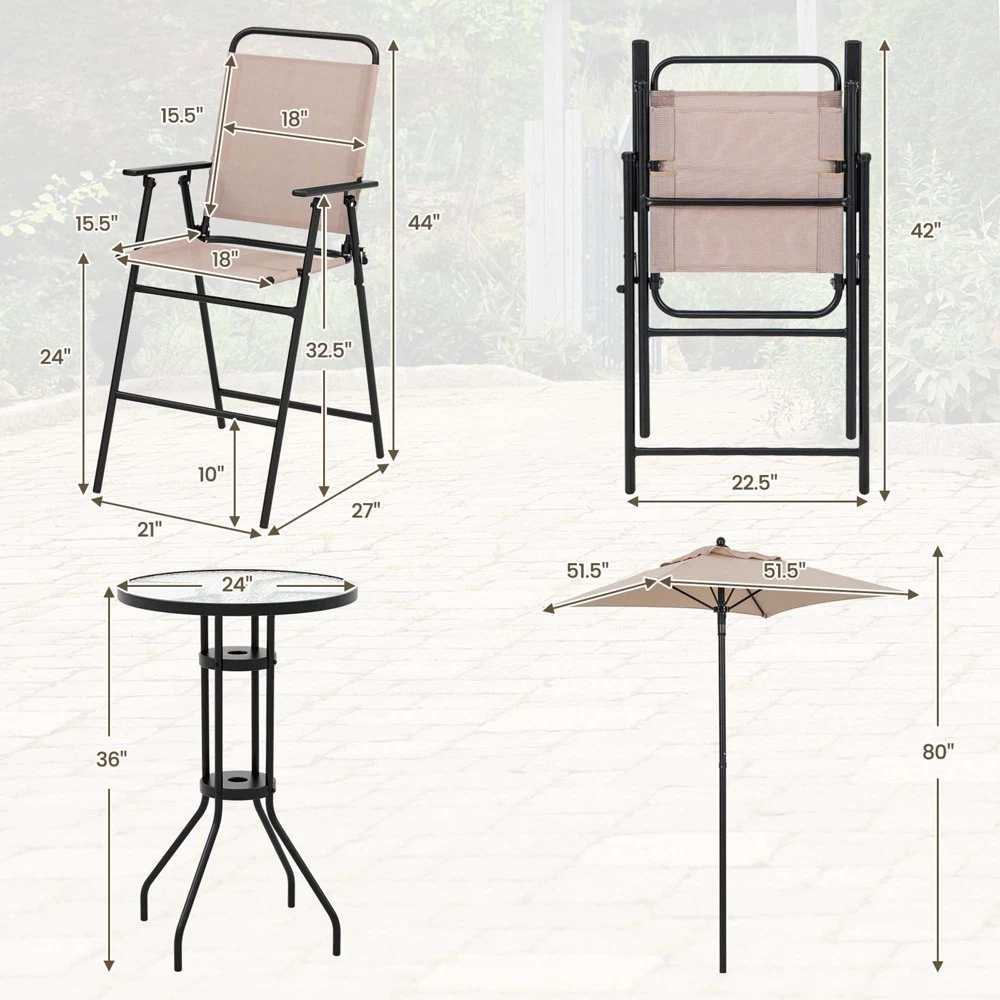 Brand: Costway Color: Beige / Black Chair Size: 21'' x 27'' x 44'' Assembled Product Weight: 38 lb Material: Does not apply Finish: Beige Chair Color: Beige Cushions Included: N Umbrella Size: 51.5'' x 51.5'' x 80'' Number of Items in Set: Four-Piece Set Includes: Table gtin13: 313108298287 Table Size: 24'' x 24'' x 36'' Manufacturer Part Number: NP11358BE Type: Does not apply UPC: 313108298287 Assembled Product Dimensions (L x W x H): 24.00 x 24.00 x 36.00 Inches