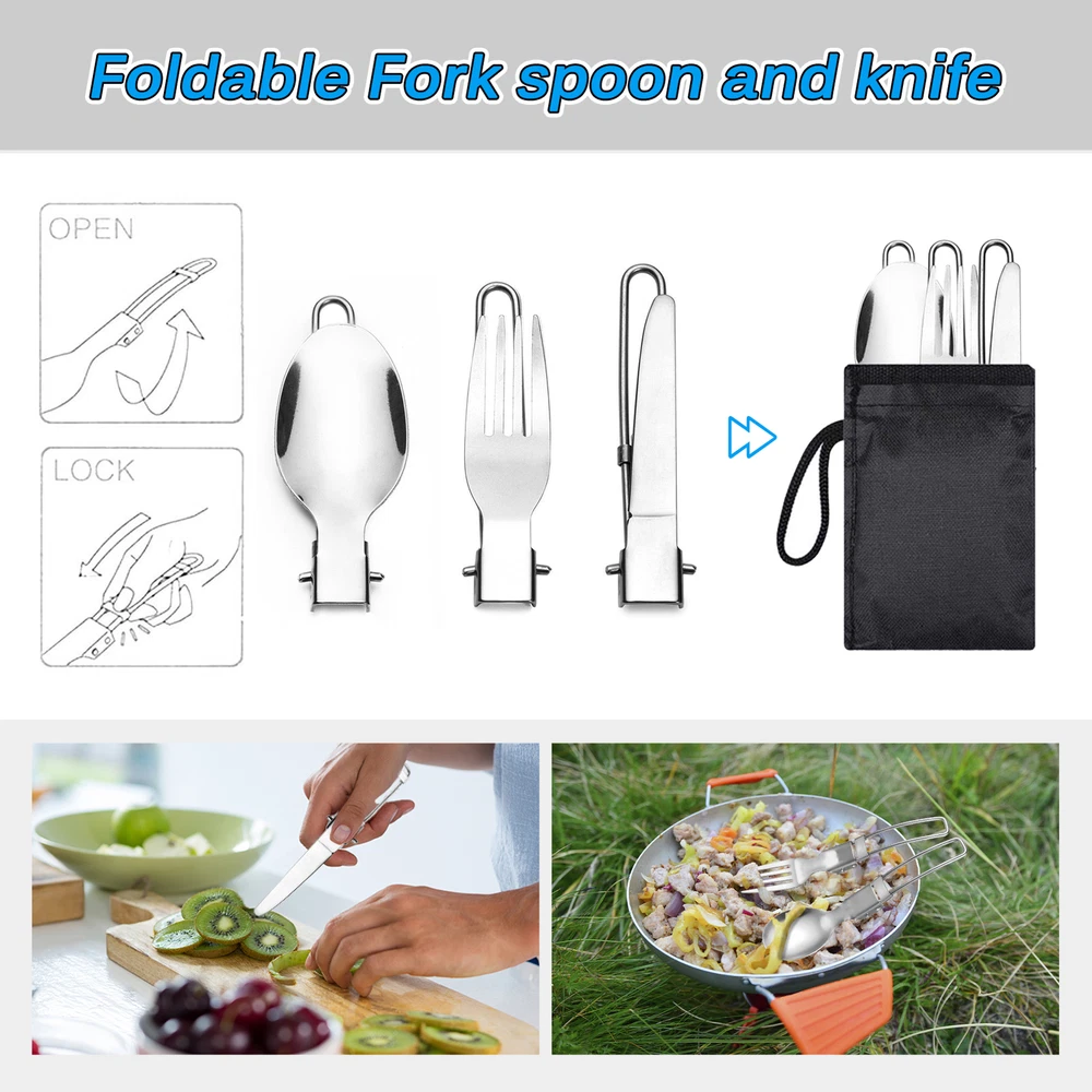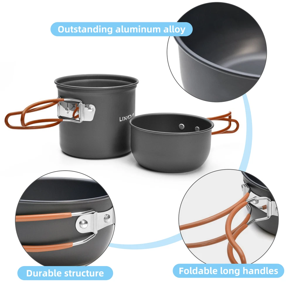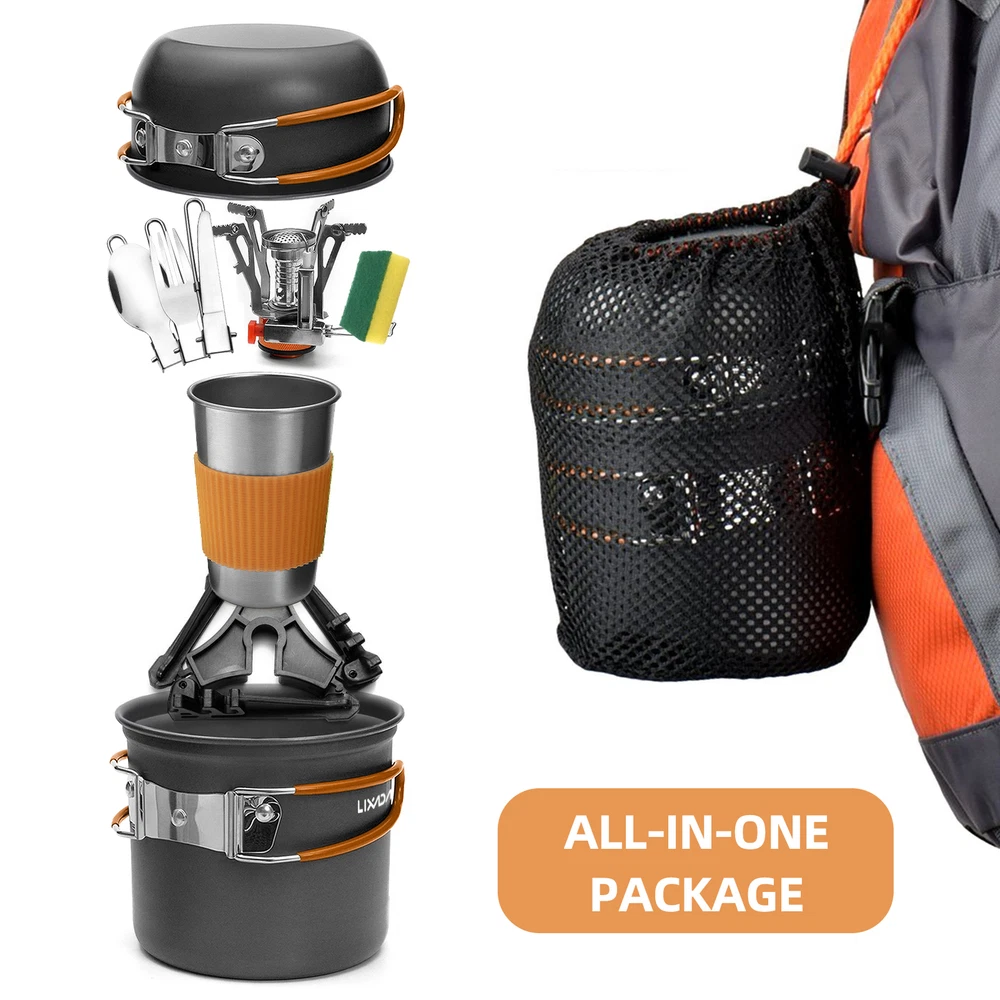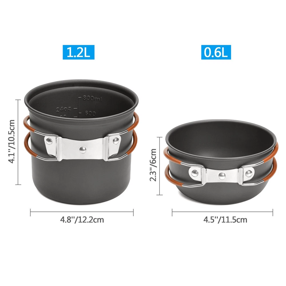 This camping cookware set is perfect for backpacking, hiking, emergency preparedness, and so on. And when you're not using it, it's incredibly easy to store thanks to its compact design. Features: Our camping pots and pans set conducts heat quickly and is easy to clean. Perfect for camping, hiking, backpacking, picnics, and other outdoor activities. Comes with a mesh bag for easy storage and transport. The folding handles on the pot and pan make this set compact and easy to store. The scale measurement design on the pot saves you time and hassle. Specifications: Material: AL alloy Color: Orange Size: 12.2*10.5cm / 4.8*4.1in (large pot); 11.5*6cm / 4.5*2.3in (small pot) Package size: 17*12.7*12.5cm / 6.7*5*4.9in Package weight: 660g / 23.3oz Package list: 1 * Large Pot 1 * Small Pot 1 * Cup 1 * Canister Stand 1 * Spoon 1 * Fork 1 * Knife 1 * Mini Stove 1 * Tableware Storage Bag 1 * Stove Storage Box 1 * Cleaning Cloth