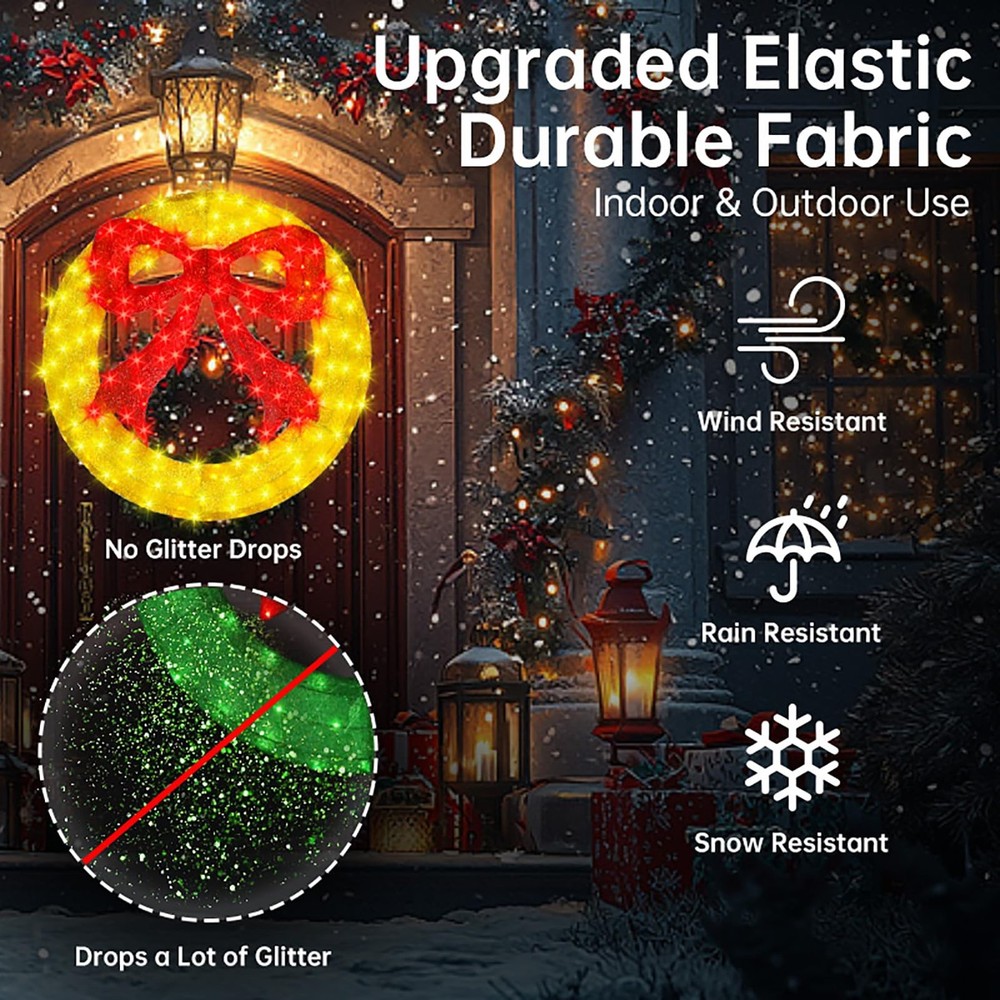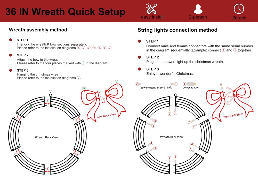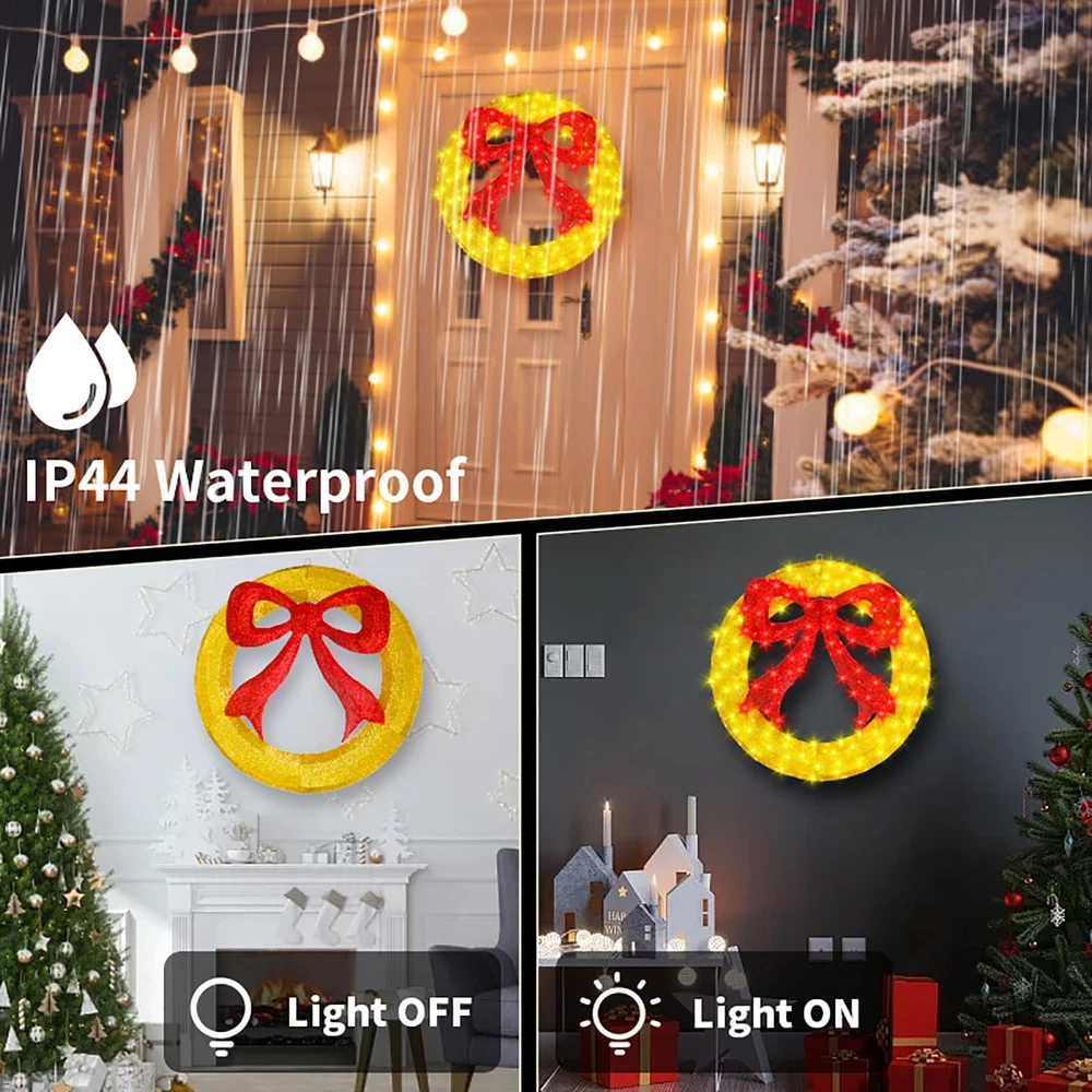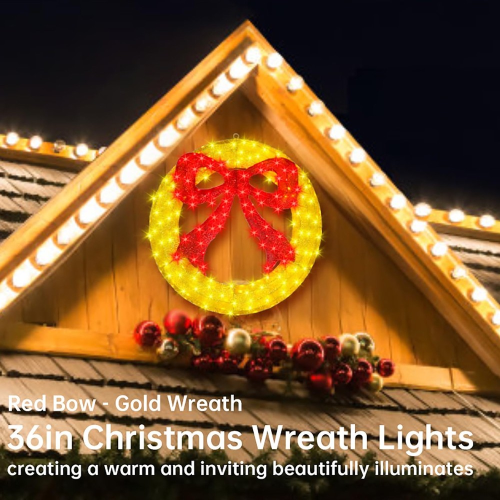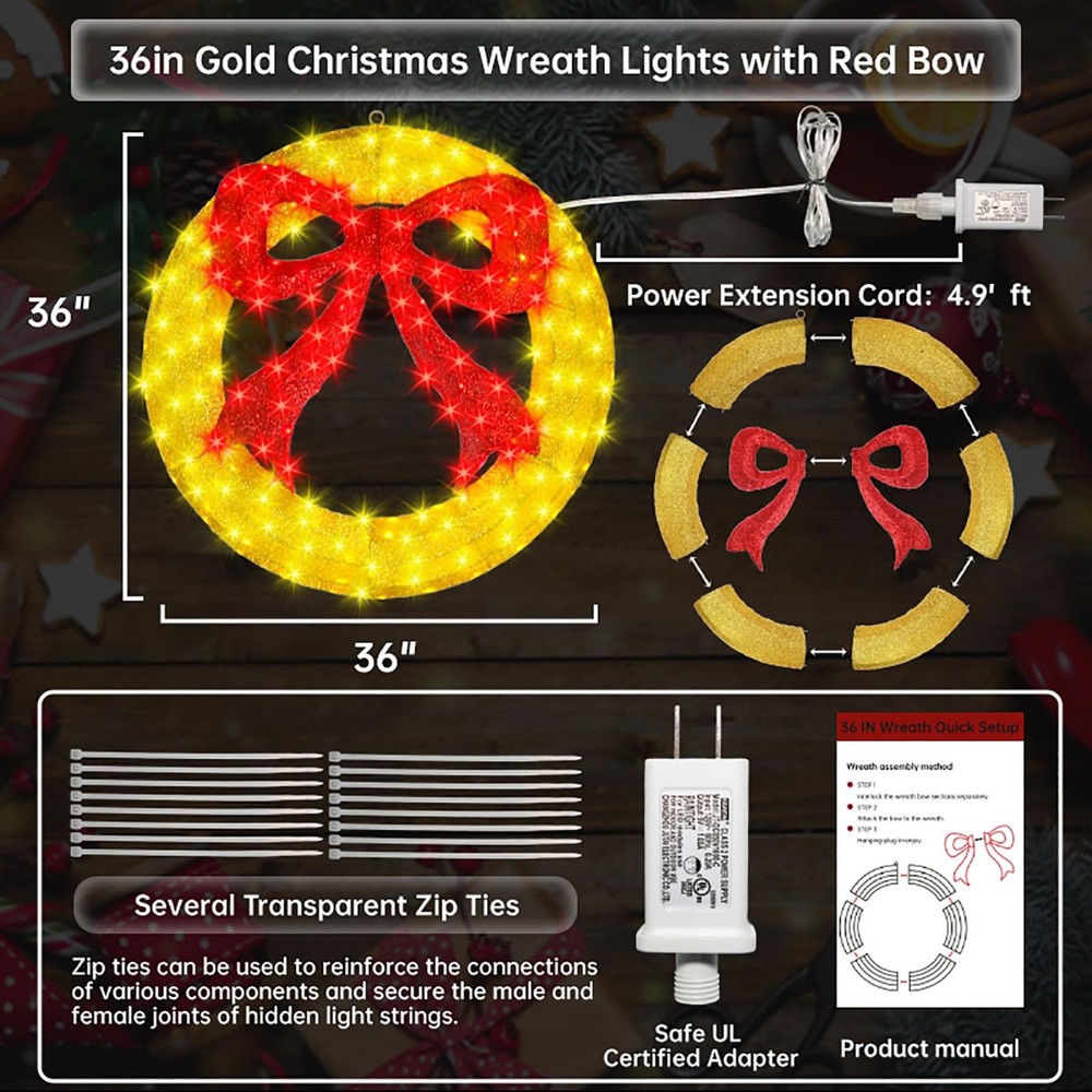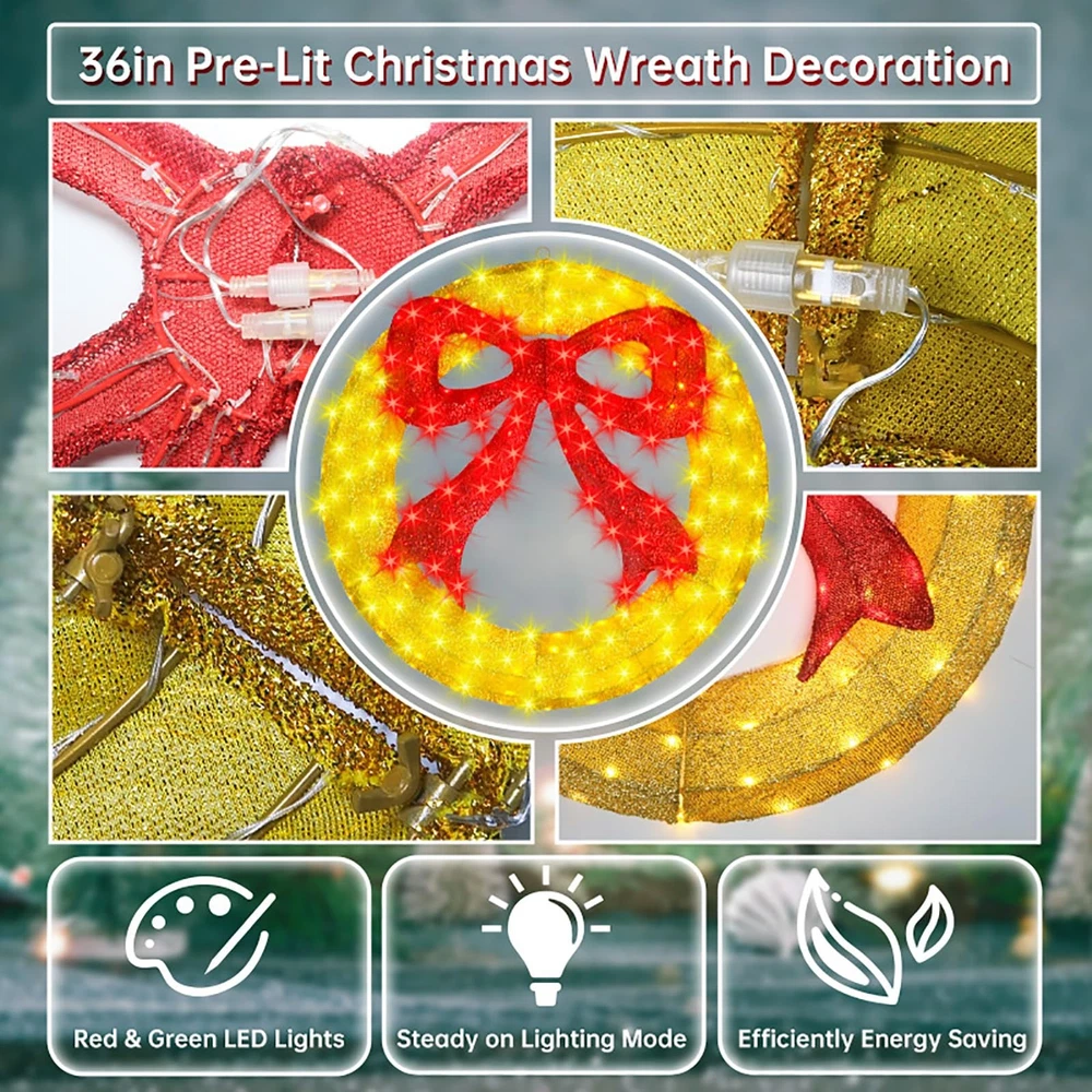 Pre-Lit christmas wreath decoration specification : 36 inch diameter outdoor christmas wreath window lights with large red bow, includes 208 count LED lights with clear wire, 4.9ft lead wire Premium and safe : The lighted christmas wreath lights made of metal and fabric, they look great day or night. 5V low output adapter ensure the safety of your family and keep at a low temperature state after long hours of usage Energy saving : Up to 90% energy savings over standard super bright mini lights, a set of christmas wreath holiday accent decoration uses only 4.16 watts replacement of 40.8 watts incandescent string lights, can efficiently save your electricity bills Easy to install : Metal christmas wreath lights composed of simple component with buckle, so just install the buckle of the component to complete the assembly, fasten a few zip ties will make it more stable. Lights are pre-strung within the wreath, connect the power cord to each connector in sequence to light up the christmas wreath Widely usage : The christmas wreath window lights construction is sturdy, ensuring it withstands winter weather with ease. The lights are evenly distributed, creating a warm and inviting beautifully illuminates. This attractive decoration is the perfect way to turn your door, window, or entryway walls into a festive display