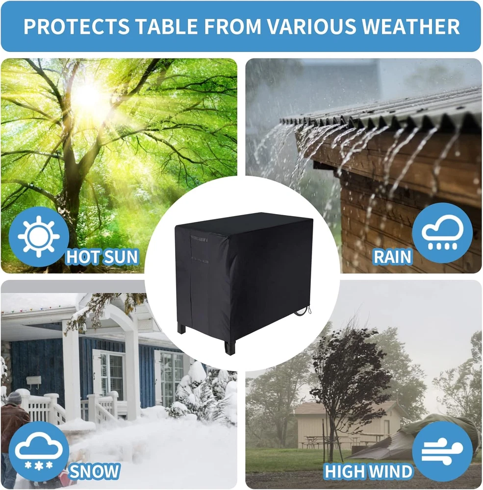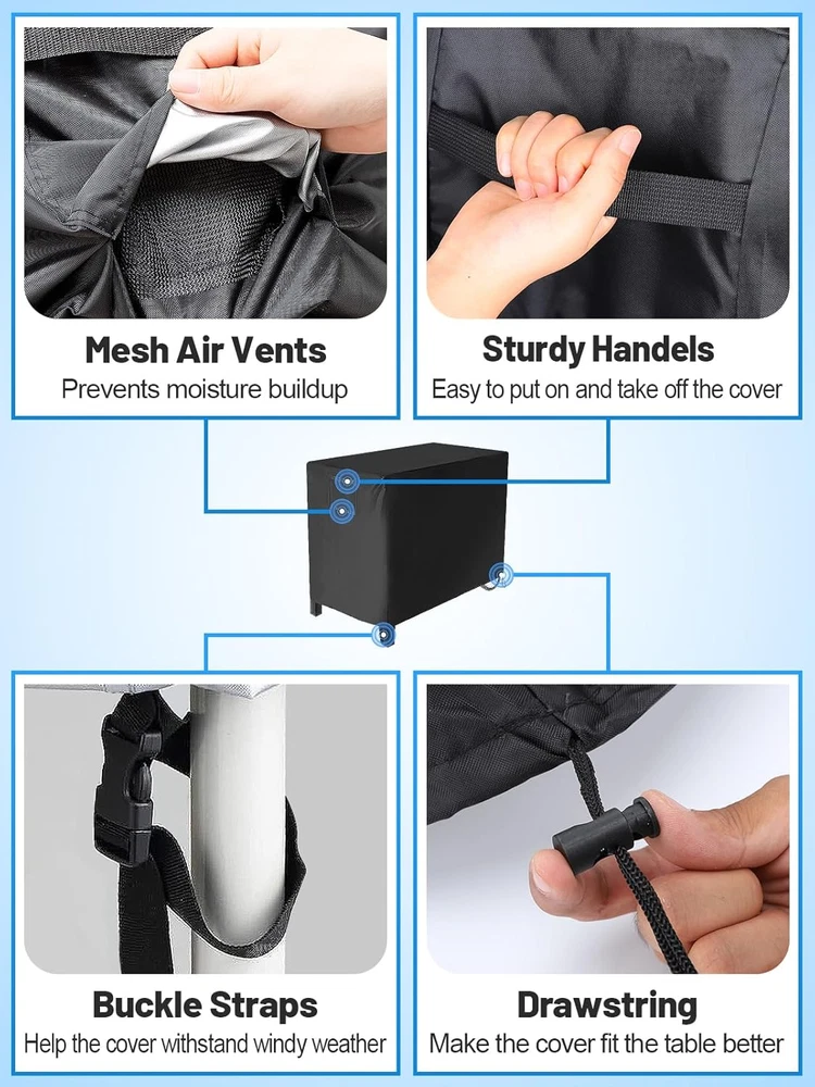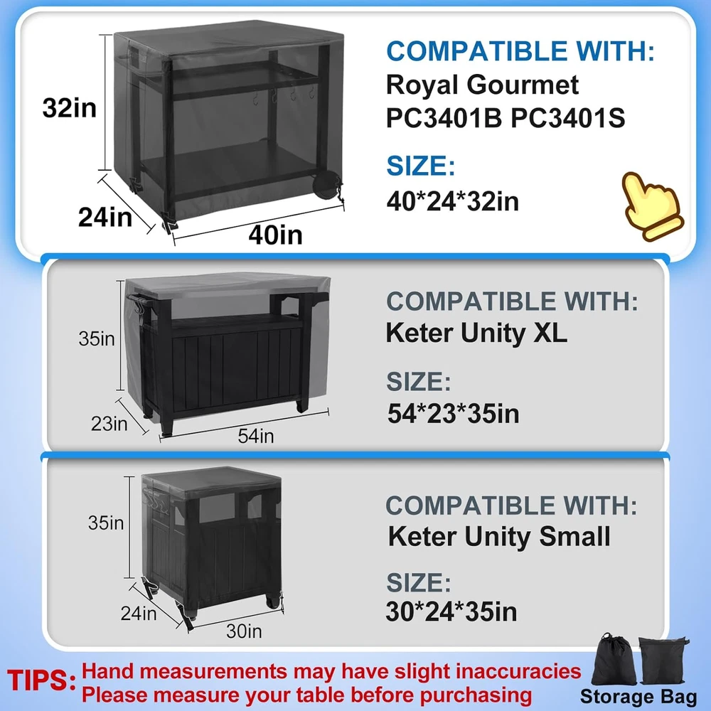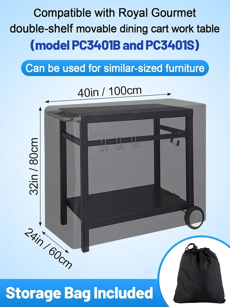 【Desirable Size】You will receive an ideal-size black outdoor prep table cover. It can be perfectly compatible with the Royal Gourmet double-shelf movable dining cart work table (model PC3401B and PC3401S). The size is measured as 40" L x 24" W x 32" H. 【Reliable Material】Made of premium 420 Oxford cloth, our dining cart cover is especially hard-wearing and keeps your worktable dustproof when not in use. It can be suitable for various weather conditions and protects your table from rain, snow, or hot sun. 【Waterproof Lining】Our cover has a PVC silver coating on the lining, which provides deeper waterproof protection for your dining cart. It can protect many hooks or screws that come with the cart from rusting. A better waterproof effect brings a better user experience. 【Thoughtful Detail】Two buckle straps that can be tied to the table legs and the drawstring at the hem allow the cover to fit snugly on the prep table and prevents the cover from being blown away in windy weather. Mesh air vents on both sides of the prep table cover effectively prevent moisture buildup. Two side handles are securely sewn to the cover and allow you to easily remove the cover from the table. 【Widely Applicable】Our prep table cover also can be compatible with furniture of similar size and used in multiple scenes, such as a bbq table, outdoor bar, outdoor prep table, outdoor prep station, grill prep station, etc. Want to provide full protection for Royal Gourmet worktable? We sincerely recommend our outdoor dining cart cover to you! Features 1. Measures 40"L x 24"W x 32"H and fits the table model PC3401B and PC3401S perfectly 2. Made of Oxford cloth, hard-wearing and keeps your table dustproof and weatherproof 3. PVC coating on the lining provides deeper waterproof protection for your dining cart 4. Two buckle straps and the drawstring allow the cover to fit snugly on the prep table 5. Mesh air vents on both sides of the prep table cover effectively prevent moisture buildup 6. Side handles are securely sewn to the cover and you can easily remove the cover from the table Specifications: Color: Black Material: 420D Oxford Cloth & PVC Silver Coating