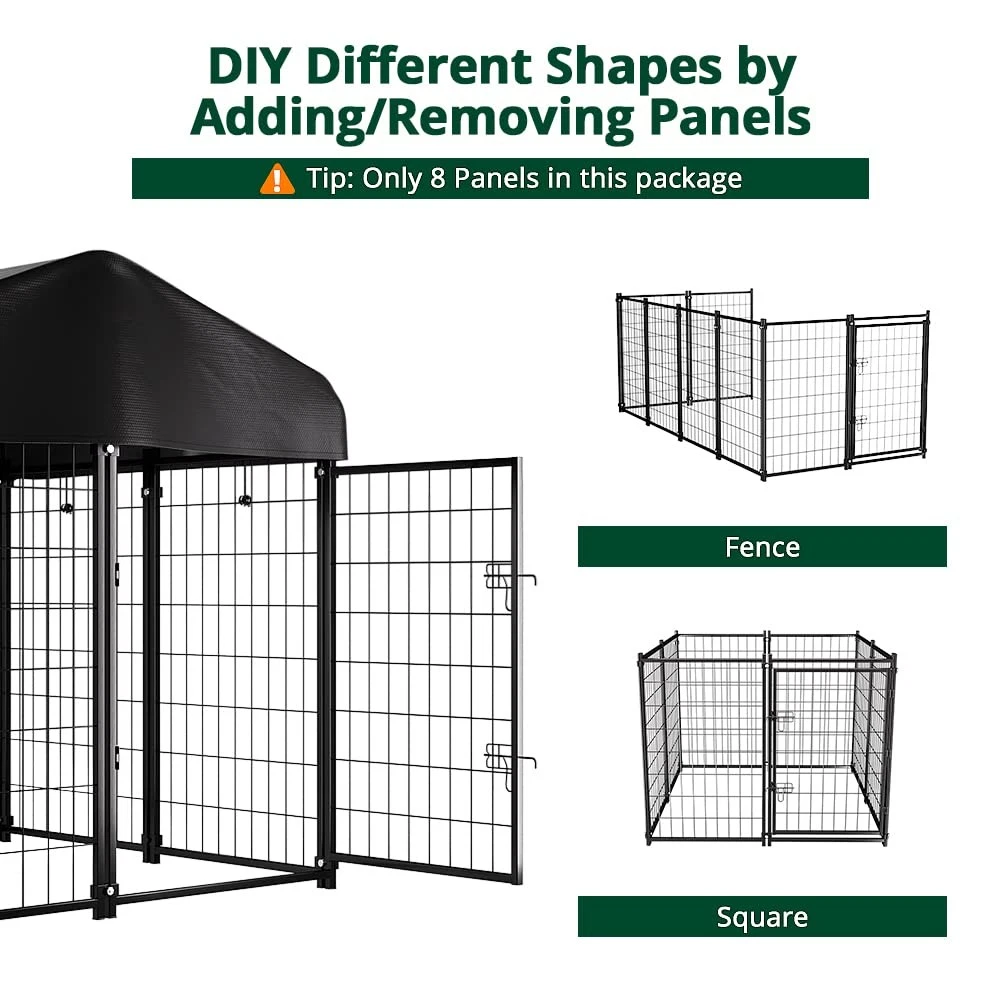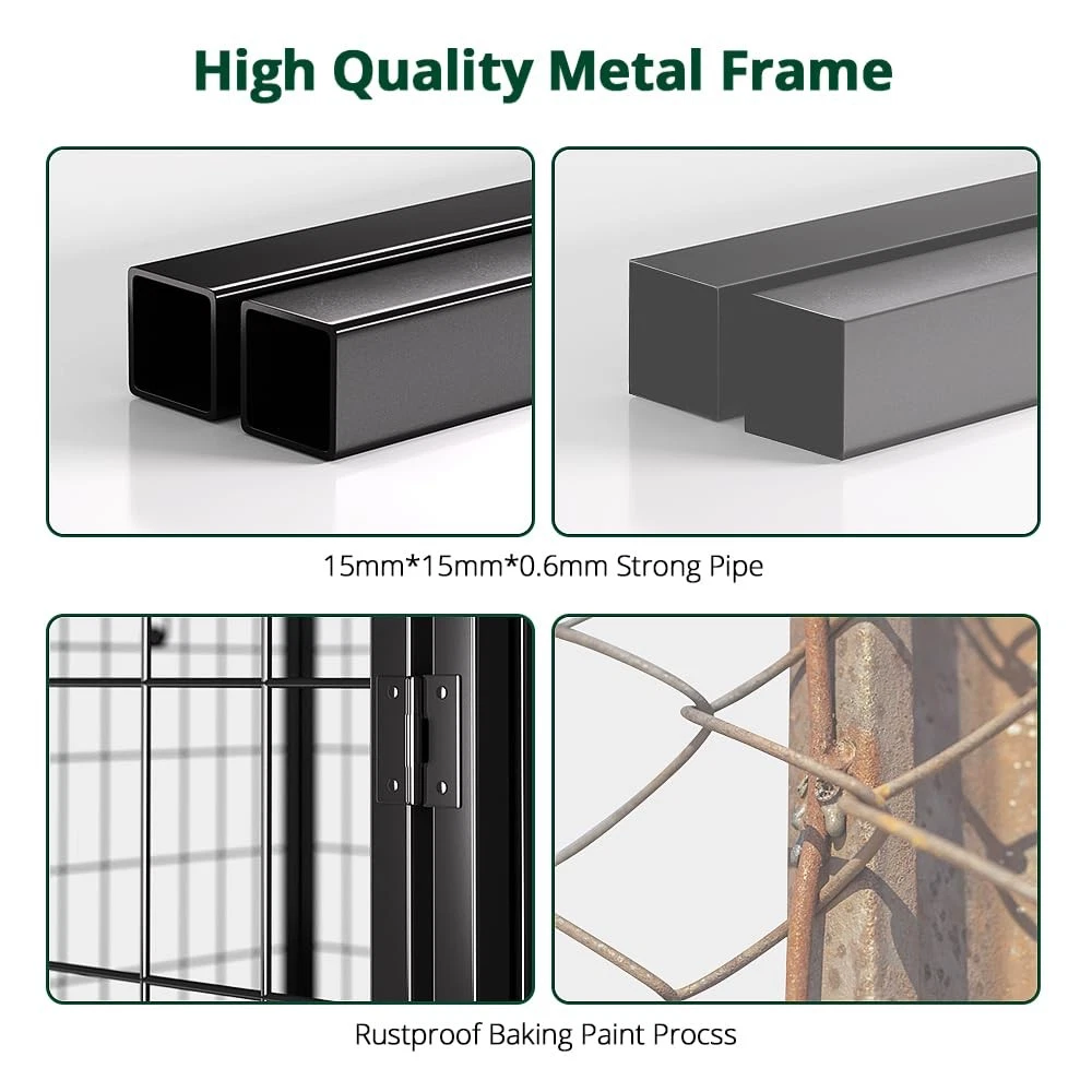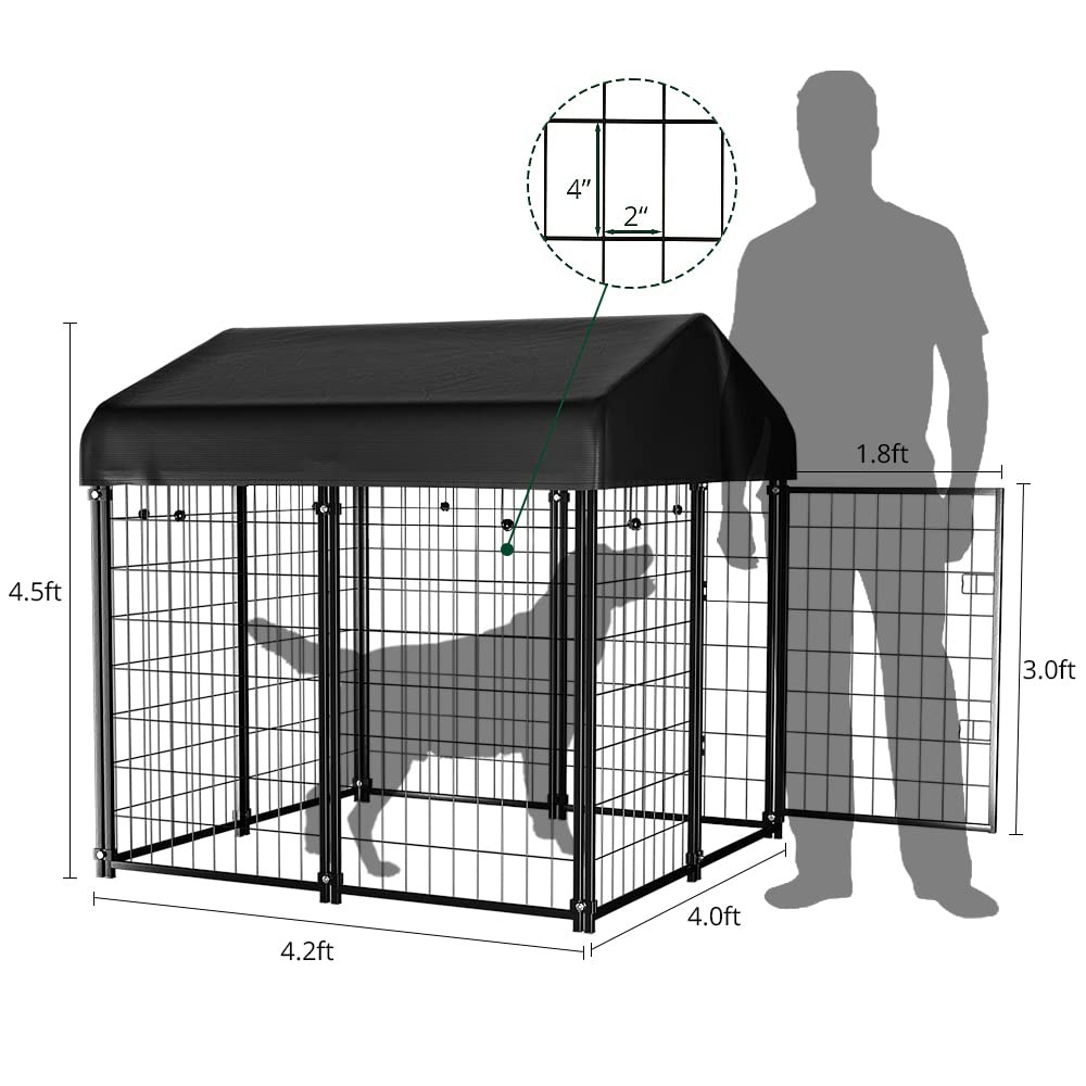 Anti-rust & Protection Design: dog cage has epoxy coating to prolong metal life, preventing rust, corrosion & fading. No need to worry about rust in rainy days. Metal surface is treated to prevent sharp edges harming pets Waterproof Removable Roof: The dog enclosure outdoor roof is made of UV-resistant and waterproof Oxford cloth, fitting outdoor dog run. Elastic ropes hold it firmly, preventing wind blow-away. The UV-resistant coating prevents fading and cracking Double door latch door: The kennel is equipped with double door locks, which are strong enough to prevent smart dogs from opening the door by themselves. Resting outdoors safely Large Interior Space: The size of the enclosures is 4ft x 4ft x 4.5ft, the right size provides ample space for your pets to rest and play in a friendly and safe environment. If you want more space, you can also connect more dog crates together Unique Design: The dog kennel has reinforced ground nails to fix the cage outdoors, preventing knockdown or movement. It's also suitable for indoor, with non-slip rubber feet to prevent floor scratching. Ideal for small/medium sized dogs within 33 lbs