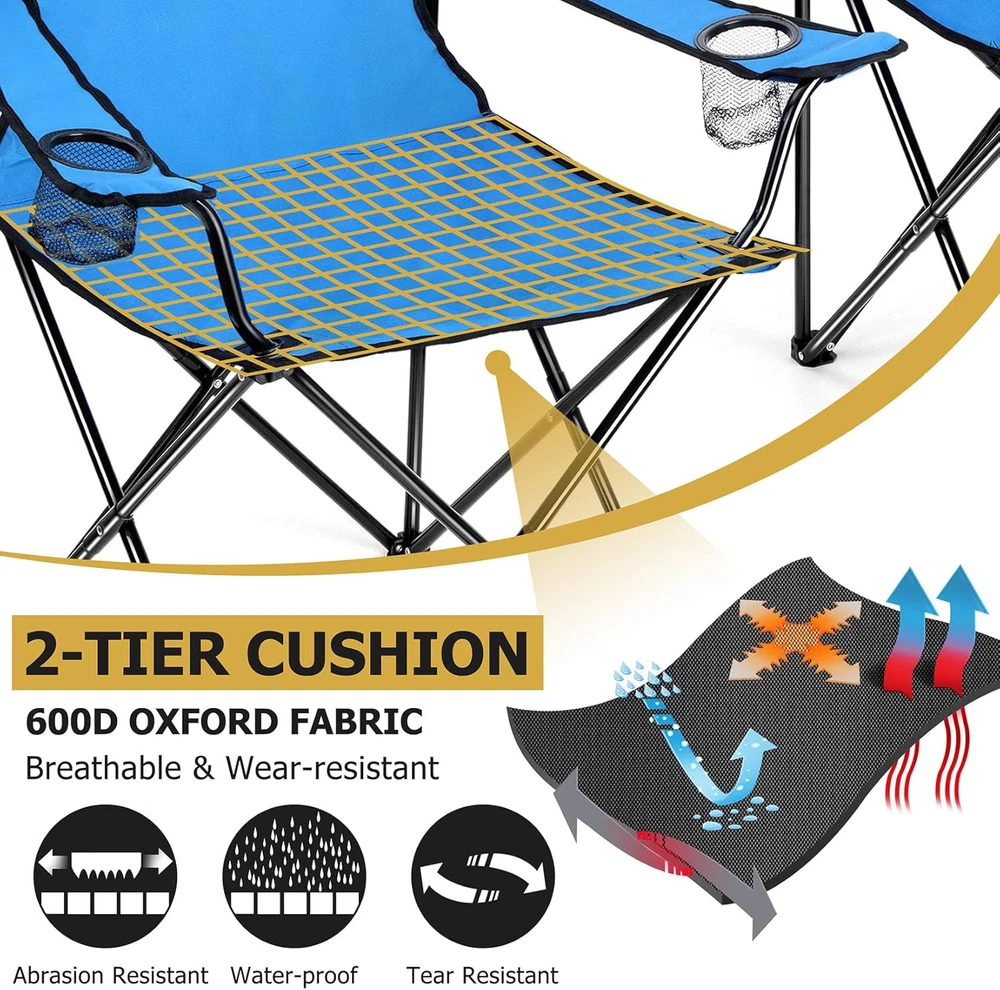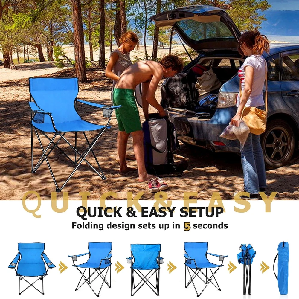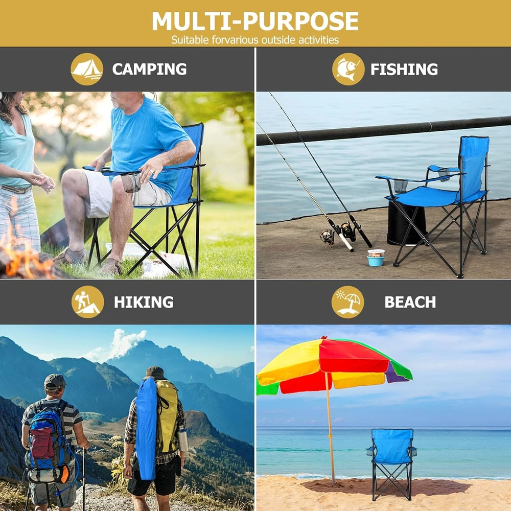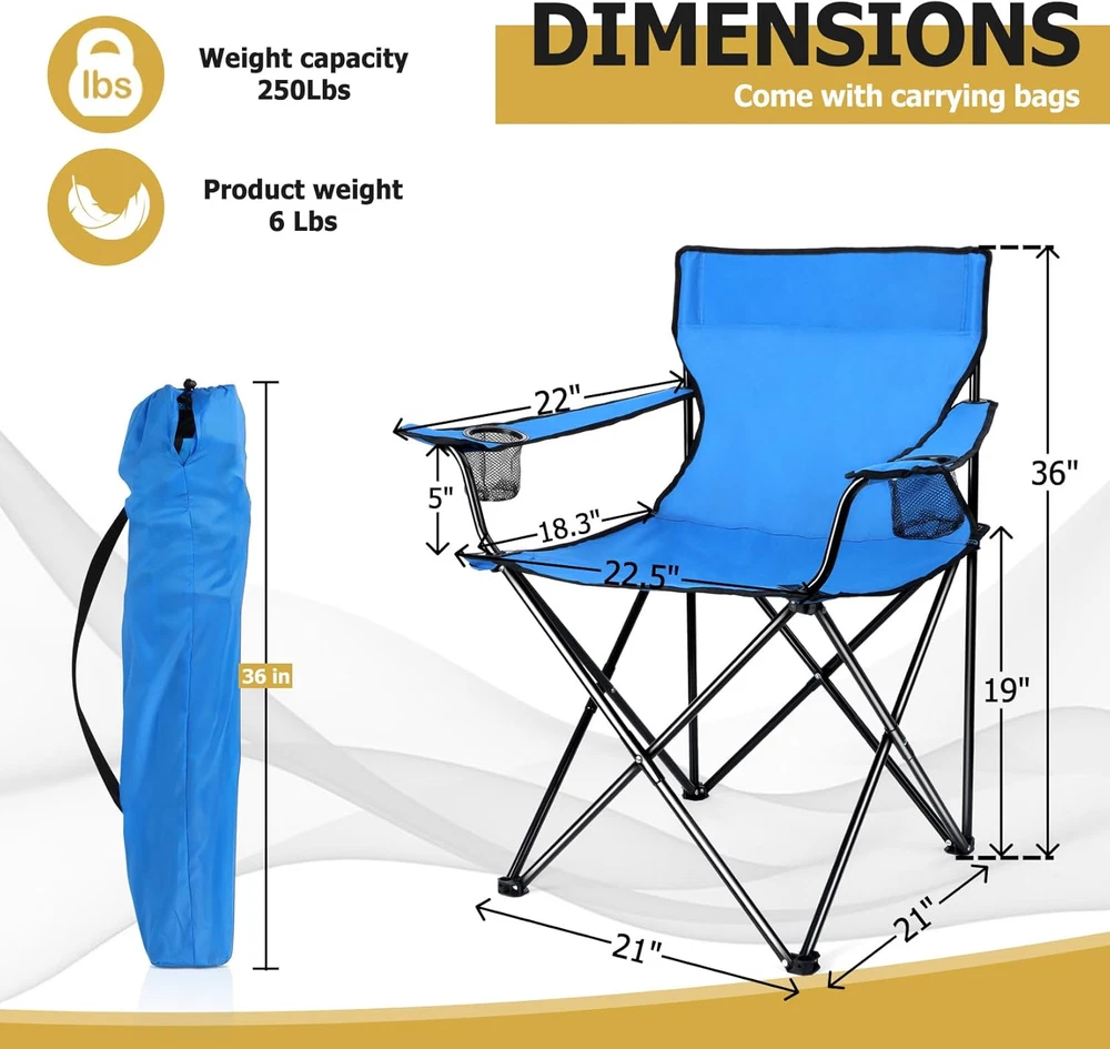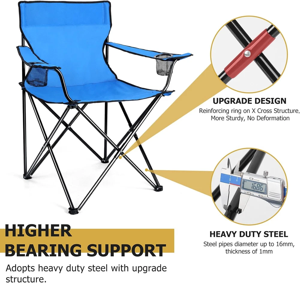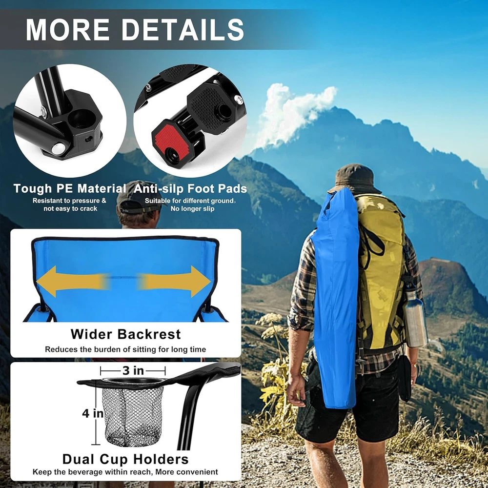 Outdoor Folding Chairs Camping Foldable Chair Carry Bag Blue for Patio Backyard 【LOAD & SAFETY】 Constructed from 16.86 mm heavy duty steel, This folding camping chair afford up to 250 LBS (114KG), Making it suitable for most people, Fastened X-shape supports and extra protective casing at the punched portion provide a stronger stability without steel pipe cracking, Double layer at the seat improve durability, Non-slip PE base help the chair stand on most outdoor ground safely and stably, Less falling accidents 【SUPER DURABLE MATERIAL】 The chair frame is made of premium steel, Will not easily deform and rust even after a long time of use, The 600D oxford fabric is highly resistant to wear and tear, And is also waterproof, Double stitching process makes the edge of the fabric connect tightly and doesn’t split, High quality material and excellent workmanship ensure a long service life 【CONVENIENT & COMFORTABLE】 Our portable folding chair combines ergonomic designs with convenient features, The 21in wider backrest supports your back better, With a seat height of 19in and depth of 18.3in, Let your body be completely relaxed, And long armrests at the proper height get you in greater comfort, Dual mesh cup holders keep your favorite beverages and snacks within easy reach 【FOLDABLE & PORTABLE】 Our outdoor lawn chair is not require assemble, Can be opened and folded up effortlessly in seconds, Measure 21” x 21” x 36” when open and fold up to 6”x 36”, A compact size make them easy to store, Each chair weighs only 6 pounds(2.75KG), Includes a travel drawstring bag with shoulder strap, Allowing you to take them anywhere conveniently and get a easeful rest whenever you want 【VERSATILE】 You can not only use this portable chair for a variety of outdoor activities, Such as camping, hiking, fishing, picnic, festival, Or lounging on your patio, garden, backyard, You can also just use it at home, It will be a good idea to add this chair to your outdoor essentials, It can also be a decent gift for campers, backpackers, hikers and other outdoor enthusiasts Product Description 1 UPGRADE DESIGN 2 HIGHER BEARING SUPPORT 3 2-TIER CUSHION 4 NON-SLIP BASE 5 CUP HOLDER Item model number Blue Portable Camping Chair Style Casual Pattern Solid Country of Origin China Theme Sport, Camping Frame Material Alloy Steel Seat Material Type 600D Oxford Fabric Number of Cup Holders 2 Unit Count 1.0 Count Room Type Patio Garden Is Customizable No Tilting No Maximum Weight Recommendation 250 Pounds Age Range (Description) Adult Form Factor Foldable Included Components Travel Drawstring Bag with Shoulder Strap Item Package Quantity 1 Indoor/Outdoor Usage Outdoor Back Style Solid Back Item Weight 6 pounds Material Steel, 600D Oxford Fabric Item Weight 6 Pounds Surface Recommendation Hard Floor Is Foldable Yes Special Feature Portable, Arm Rest, Space Saving, Cup Holders, Foldable Furniture base movement Glide Color Blue Shape L-Shape Recommended Uses For Product Camping Product Dimensions 18.5"D x 22.5"W x 35.4"H Seat Depth 18.3 inches Shipping Fast shipping is very important for us. Our expedited US shipping service is FREE. Your order will be shipped within 2 business days upon full payment received. Your order will be delivered within 2-3 business days after the handling time. Warranty & Returns 30-Day FREE Return Policy offered for unsatisfactory items. Options include: Refund or Exchange for another item. Contact us Customer satisfaction is our top priority. If you encounter any issues with our product, please don't hesitate to reach out to us. We are committed to ensuring your satisfaction and will go above and beyond to assist you. Your happiness is our goal! Thank you for shopping at our store.