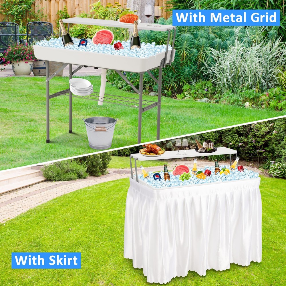 TWO LAYERS Ice Cooler Folding Table for Party 🧊DOUBLE TIER 2 IN 1: Elevated model upgraded double-tier design ice table with top stand for party foods that don't need refrigeration for storage, and table slots as ice storage for food coolers. Novel and unique shape coexists with practicality, cost-effective choice! 🧊FOLDING PORTABLE: This 4 Ft ice cooler table folds with stainless steel rigid legs that lock into place and won't pop open during transportation, and a carry handle for easy landing. 🧊EASY CLEANING AND DRAINING: Our party tables with drain prevents water from pooling, and the HDPE surface resists dirt and stains and cleans up in one wipe, reducing labor costs. 🧊REMOVABLE SKIRT AND METAL HOLDER: The drink cooler table comes with a skirt and velcro fasteners, and the faux satin sheen adds an elegant and classy vibe to your party. The metal shelf adds extra storage space and can be hidden under the skirt. 🧊READY-TO-USE SPACIOUS TABLETOP: This outdoor food keeper uses a 3.5" deep, 22"×40" large tabletop to allow users to store large amounts of ice to keep beverages, fruits, and cold foods chilled for an extended period of time. 🧊MADE FOR LONG USE: Our ice cooler folding table is made of stainless steel legs and HDPE surface, which is resistant to corrosion, rust, cold and pressure. The triangular support structure of the legs makes the whole not easy to deform and break. Suitable for weddings, parties, picnics, camping trips, BBQ, fishing, etc., indoor and outdoor universal.