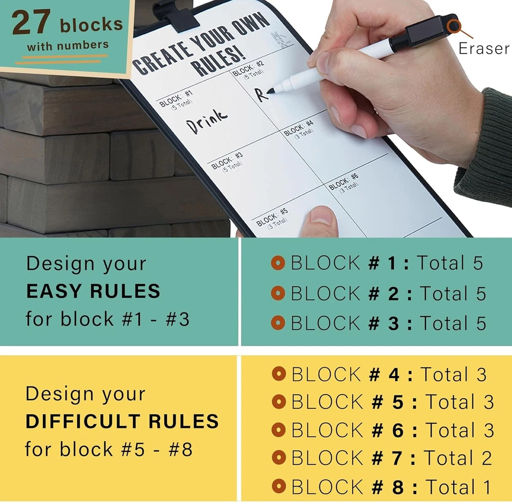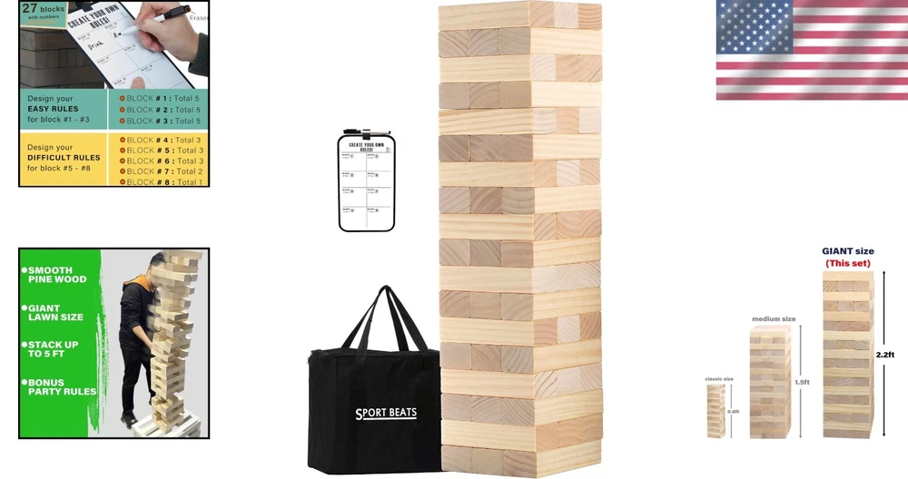 Outdoor Giant Tower Game - 54 Stacking Blocks with Scoreboard & Carry Bag ‹ › ‹ › ‹ › ‹ › ‹ › ‹ › ‹ › ‹ › Outdoor Giant Tower Game Bring the excitement of playtime to your backyard with our Outdoor Giant Tower Game, a perfect blend of strategy, skill, and fun! Product Details: Includes 54 sturdy stacking blocks crafted from premium pine wood. Each block measures an impressive 7.2 x 2.4 x 1.4 inches, ensuring a towering challenge. 27 plain blocks can be personalized to add a special twist. Features 27 blocks adorned with random numbers (1-8) for added excitement. Comes with a convenient carrying case for effortless transport. Benefits: Perfect for outdoor gatherings, family reunions, and friendly parties. Enhances social interaction and friendly competition among players of all ages. Customizable blocks provide a unique touch to suit your event's theme or message. Durable pine wood construction ensures longevity for countless hours of entertainment. Easy to store and transport in its stylish carrying case. Why Choose Our Outdoor Giant Tower Game? Transform any gathering into an unforgettable event with our Outdoor Giant Tower Game. Whether you're celebrating a birthday, hosting a barbecue, or simply enjoying a sunny day outside, this towering game offers hours of fun and engagement for everyone. With customizable plain blocks, you can create memorable challenges tailored to your family or guests, while the sturdy design guarantees long-term enjoyment. Don't just play games, create lasting memories - secure your Outdoor Giant Tower Game today! Shipping Free & Fast Shipping - We offer free shipping to most of the USA with a normal delivery time of 3-7 days. However, due to the current situation, additional delivery time (up to 3 weeks) may be required for some items. Alternative Carriers - We may use alternative carriers (e.g. USPS, FedEx, UPS, etc.) to ensure your package arrives safely and on time. Due to the use of multiple carriers, we are unable to provide a tracking number automatically. Handling Time - Orders are processed and shipped within 1-2 business days of receiving cleared payment. Shipping Restrictions - Shipping to Alaska, Hawaii, Puerto Rico, Guam, and other US territories may incur shipping charges or delivery restrictions. Please contact us before ordering, or your order can be refunded/cancelled. State Restrictions - There may be restrictions based on your state of purchase. For example, certain items may not be shipped to California due to state regulations. Contact for Tracking Updates - If you require tracking updates or have any concerns about the delivery of your order, please feel free to contact us, and we will be happy to assist you. Return 30-Day Hassle-Free Returns - We want you to be completely satisfied with your purchase. If you are not, you can return the item within 30 days of receiving it for a full refund or exchange. Easy Return Process - To start a return, simply contact us and we will provide you with a prepaid return shipping label and detailed instructions. Restocking Fee - There are no restocking fees for returns. However, the buyer is responsible for return shipping costs if the return is not due to a seller's error. Refund Processing Time - Refunds will be processed within 5 business days of receiving the returned item in its original condition. Payment We accept all major credit cards, PayPal, and Apple Pay for your convenience. Your payment information is secure and encrypted to ensure a safe and seamless transaction. Please complete your payment within 3 days of purchase to avoid any delays in shipping. Feedback Your feedback is extremely important to us. We strive to provide the best products and customer service possible. If you are satisfied with your purchase, please take a moment to leave us a positive review. If you have any concerns or issues with your order, please contact us before leaving negative feedback. We are committed to resolving any problems and ensuring your satisfaction. Contact Us If you have any questions or concerns, please feel free to reach out to our customer support team. You can contact us through the eBay messaging system. We are available Monday to Friday, 9:00 am to 5:00 pm EST, and we will do our best to respond to your inquiry within 24 hours. Thank you for supporting our small family business! UPC: Not Set Recommended Age Range: 17 Years & Up MPN: Giant_Stacking_Game Age Level: 17 Years & Up Features: Giant Stacking Game Brand: Unbranded Game Title: SPORT BEATS Game Type: Family Game Year: Not Set Type: Complete Game Theme: Not Set Min. Number of Players: 2 players Award: Not Set Gender: Unisex Country/Region of Manufacture: Not Set