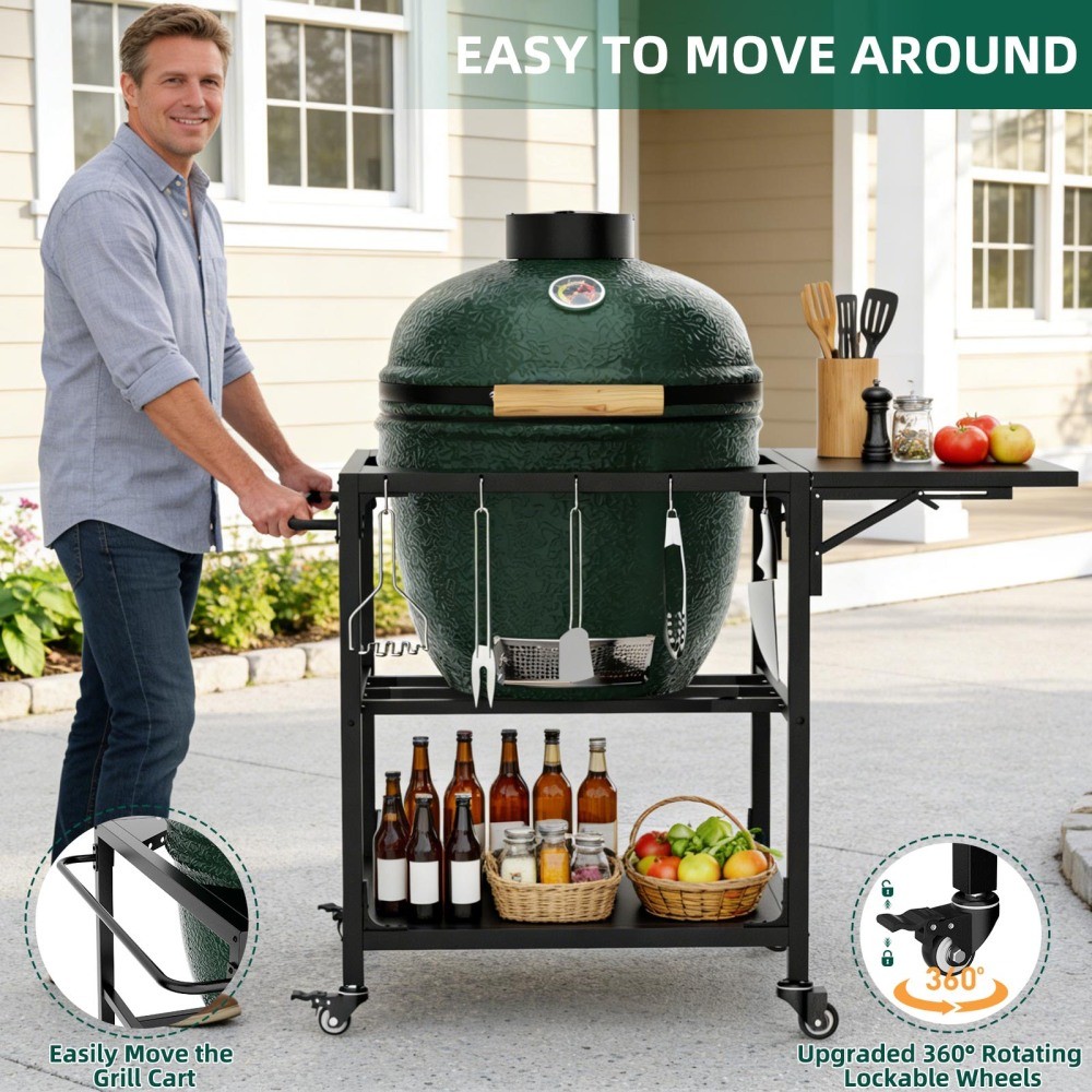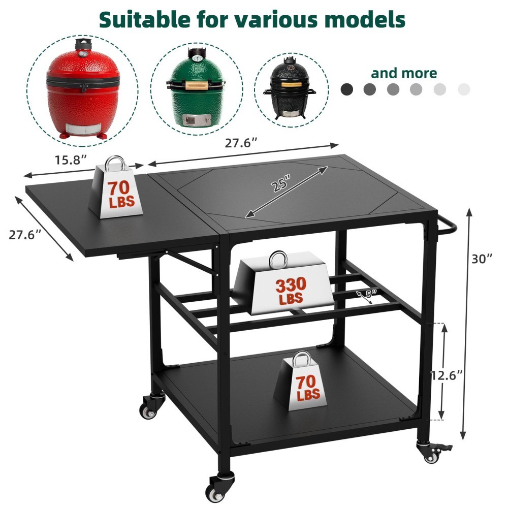 Outdoor Grill Table for Big Green Egg Style BBQ - Heavy Duty Metal Cart Prep Table with Wheels, Storage Shelf, Hooks & Removable Central Cover, Compatible with Large Big Green Egg Grill, Black Elevate your outdoor grilling experience with this heavy-duty metal grill table, custom-designed for the XLarge Big Green Egg and most 21-26 inch kamado-style grills. Crafted from durable black metal with a weather-resistant finish, this grill cart combines stability, mobility, and ample storage—featuring a foldable workspace, tool hooks, a bottom shelf, and lockable wheels. It’s the perfect addition to your patio, deck, or backyard, turning your grill into a streamlined, efficient cooking station. Custom-Fit for XLarge Big Green Egg & Kamado Grills. Designed specifically for the XLarge Big Green Egg (the result of years of design refinements), this grill stand goes beyond traditional nests by offering extra storage and convenient hooks, creating a seamless workspace that enhances your grilling workflow. It’s also compatible with most 21-26 inch kamado-style grills and supports up to 330 lbs, making it versatile enough for all your outdoor cooking needs. Heavy-Duty Metal Construction for Maximum Stability. Built from heavy-duty metal, this grill table is engineered for long-lasting durability and unwavering stability. Its robust structure ensures your Big Green Egg or kamado grill stays secure during use, so you can focus on perfecting your BBQ without worrying about wobbling or instability. The sturdy design is built to withstand outdoor elements and regular grilling use, promising years of reliable performance. 360° Rotating Lockable Wheels for Easy Mobility. Equipped with 360° rotating lockable casters and a secure brake system, this grill cart offers effortless mobility and stable positioning. Move it smoothly across any surface—patio, deck, driveway, or grass—then lock the wheels securely in place to keep it steady while grilling. This flexibility lets you rearrange your outdoor cooking space with ease, no heavy lifting required. Expansive Foldable Workspace & Versatile Storage. Designed for convenience, this grill table features a 15.8” x 27.6” foldable work surface—perfect for food prep, holding ingredients, or placing tools. Built-in tool hooks keep your grilling utensils within arm’s reach, while the bottom shelf provides extra storage for charcoal, sauces, or other grilling essentials. The removable central cover adds versatility, allowing you to customize the setup to fit your grill and needs, keeping your workspace organized and efficient. Easy to Clean & Quick to Assemble. Finished with a protective, weather-resistant powder coating, this grill table resists rust and is simple to wipe clean after every cookout—just a quick wipe with a damp cloth removes grease, food residue, and dust. Assembly is hassle-free with clear, step-by-step instructions and labeled parts, so you can set it up quickly and start grilling right away. If you have any questions or encounter issues during assembly, our professional after-sales team is always ready to assist you. With assembled dimensions of 43.40”L × 27.60”W × 30.00”H, this grill table offers ample space without taking up excess room in your outdoor area. It ships in one secure package with dimensions of 32.68”L × 30.31”W × 8.46”H and a package weight of 49.82 lbs, ensuring safe, damage-free delivery to your doorstep. The sleek black finish complements any outdoor decor, adding a modern, functional touch to your grilling setup. Product Details - Color: Black (note: actual product color may differ slightly from images due to lighting or monitor display differences) - Material: Heavy-Duty Metal; Finish: Weather-Resistant Powder Coating (Rust-Resistant) - Product Type: Outdoor Grill Table, BBQ Cart, Prep Table, Grill Stand - Compatibility: XLarge Big Green Egg, Most 21-26 Inch Kamado-Style Grills - Features: 330 lbs Weight Capacity, 360° Rotating Lockable Wheels with Brake System, Foldable Workspace (15.8” x 27.6”), Built-In Tool Hooks, Bottom Storage Shelf, Removable Central Cover, Weather-Resistant, Easy to Clean, Quick Assembly - Assembled Dimensions: 43.40”L × 27.60”W × 30.00”H - Package Dimensions: 32.68”L × 30.31”W × 8.46”H - Package Weight: 49.82 LBS - Suitable For: Patio, Deck, Backyard, Outdoor Grilling Areas - Assembly: Quick & Hassle-Free (clear instructions and labeled parts included) Warranty & Return Policy This heavy-duty metal grill table is backed by a 1-year warranty against manufacturing defects, ensuring reliable durability and long-lasting use for all your outdoor grilling adventures. We also offer a 30-day free return & exchange guarantee for your complete peace of mind. If you’re not fully satisfied with your purchase—whether it’s the fit, durability, functionality, or assembly—simply return it within 30 days for a full refund or replacement, no questions asked. Important Notes - Color Variation: Actual product color may not match images exactly due to lighting, screen settings, or resolution differences. - Size Accuracy: Manual measurements are approximate and may have minor reasonable errors. Ensure your grill is within the 21-26 inch range (or is an XLarge Big Green Egg) for proper fit. - Care Instructions: Wipe the metal surface with a soft, damp cloth after use to remove grease and residue; avoid abrasive cleaners that may damage the powder coating. Periodically check wheels and hardware for tightness to ensure stability. - Assembly: Follow the included step-by-step instructions carefully for proper assembly. Two adults are recommended for easier assembly due to the product’s weight and size. - Weight Capacity: Do not exceed the 330 lbs weight capacity to avoid damage to the cart or grill. Ensure the grill is centered on the cart for optimal stability. - Weather Protection: While the powder coating is weather-resistant, it’s recommended to cover the cart 