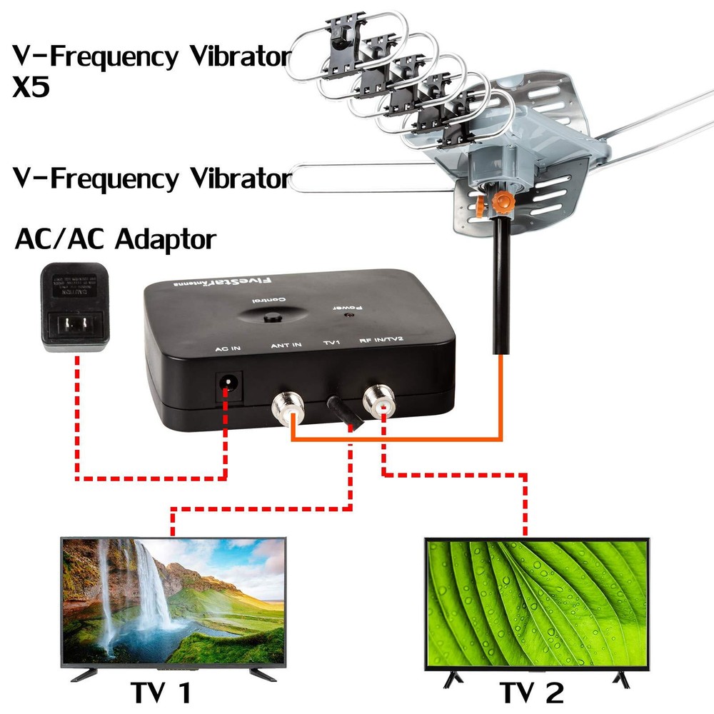 2019 MODEL WITH ENHANCED DESIGN A Minute to set up for a lifetime of free 1080HD 4K TV Clear HD image quality. "Auto Gain Control": Gain 25-35db, New technology for adjusting high quality signal reception performance. Built-in Super Low Noise Amplifier: Operating Frequency 45-860MHz. Built-in LTE filter which removes the interference caused by 4G phone signals and ensure the noise-free digital TV reception. Full band DTV/VHF/UHF Receiver: Supports 4K HD TV, 1080p,1080l, 720p Broadcast, Radio. 360 Degree Rotation. US, Canada, Mexico, Latin America and around the world Free up to 150 Local HDTV Channels 150 miles long range and dual TV outputs --full HDTV support 720p, 1080i, 1080p | receving: VHF 170-230MHz | UHF 470-860MHz | receive digital broadcast high definition TV signals. Wireless remote controller -- Built-in 360 degree Strong Motor rotor | Built-in Super High Gain and Low Noise Amplifier | includes 40FT outdoor TV antenna Coaxial cable. Easy for you to place it to get the best reception in your house. Support 2 TVs at the same time with a splitter. Weather resistant: 150 miles antenna is for outdoor using. Antenna is lightning protected, durable design with grounding done -don’t get struck out by bad weather. [Product Content] Package only included Antenna, Control Box, Remote Control, Power supply, 40ft RG6 Coaxial Cable, Mounting Pole and Instruction (4-Way Splitter is not included) Snap-On Installation--Snap On Elements no tools required. Comes with an easy-to-follow user manual so you can install the antenna with ease.