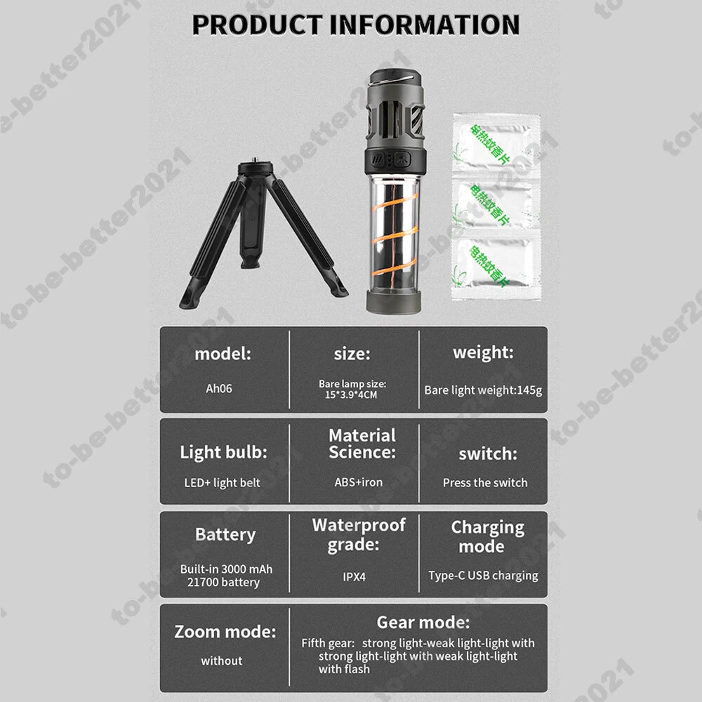 You may also like LED Light Sport Head Band Sweatband Stretch Cotton Squash Tennis Outdoor Fitness 20.89 CAD Free shipping 7 D Anti-aging Face Lifting Wrinkle Removal Double Chin Reduce Beauty Machine 1584.89 CAD Free shipping Sun Visor Hat W/Led Light Baseball Cap Empty Top Hat Unisex for Biking Trekking 28.49 CAD Free shipping Unisex 40 LED Lighted Flashlight Adjustable Baseball Hat Camping Hunting Fishing 28.19 CAD Free shipping Facial Fractional Radiofrecuencia Rf Face Lifting Skin Rejuvenation Dot Device 670.69 CAD Free shipping Moisturizing Tighten Remove Wrinkles Beauty Machine No Needle RF Mesotherapy Gun 684.49 CAD Free shipping Multifunctional 7-D Hifu Machine Skin Rejuvenation Anti-aging For Beauty Salon 1602.49 CAD Free shipping 9/12/24/36/42Pin 3D/5D/Nano for Microneedling Pen Micro Cartridges Replacement 26.39 CAD Free shipping 20L Portable Solar Heated Shower Camping Water Bathing Bag Outdoor Travel Hiking 33.59 CAD Free shipping Portable Foldable LED Lighting Light Hook Lantern ABS Camping Lamp 2400/4000mAh 27.69 CAD Free shipping Mini No Needle Nano Mesotherapy Meso Gun Moisturizing Skin Lifting Machine Kit 26.89 CAD Free shipping Mesotherapy Meso Gun Wrinkle Removal Rejuvenation Machine Nano Skin Water Pen 25.69 CAD Free shipping 5K 30FPS nti-shake Action Camera ADual Screen Remote Control Bicycle Diving Cam 124.29 CAD Free shipping 5 in 1 Anti-Hair Loss Vibration Massage Hair Growth Therapy Scalp Care Devices 806.69 CAD Free shipping 2In 1 Ozone Plasma Pen Professional Eyelid lifting Dark Spot Wart Remover Device 185.59 CAD Free shipping 360° Protective Bag Laptop PC Sleeve Case Briefcase Shockproof 11/13.3/15.6 Inch 47.69 CAD Free shipping SAFE & SECURE SHOPPING 100% SATISFACTION GUARANTEED FAST SHIPPING Store Categories Store Categories Other AU Oversea Warehouse DE Oversea Warehouse UK Oversea Warehouse USA Oversea Warehouse China Warehouse FR Oversea Warehouse You may also like Outdoor LED Mosquito Repellent Camping Light Flashlight Multi-function Tripod Product Description Descriptions: Power: 5W Charging voltage: 5V Charging time: 5-6h Lighting: 6-30 hours Battery capacity: 3000mAh Light effect range: 10-50 meters Material: ABS plastic/PC/magnet Color temperature: white/warm light Charging method: Type-C direct charging Brightness lumens: front lights 200-300 lumens/ambient lights 100 lumens Features: Large Capacity 3000mah built-in Battery With a built-in 3000mAh rechargeable battery and indicator lights displaying remaining power, this light can run for 6-30 hours in camping illumination mode. 5-Level Brightness Adjustment The lighting button toggles between 5 lighting modes, serving as a task light, ambient illumination, or flashlight. It can run for up to 30 hours at the lowest brightness setting. Magnetic Portable Compact Design Equipped with a magnetic bottom for attachment to any metal surface and includes a stand for versatile placement. The portable handle allows easy hanging in desired locations such as tents, poles, or even tree branches. Package Include: Camping Light * 1 Type-C Charging Cable * 1 Payment Method Shipping and Handing Time Returns Feedback Contact us Payment Method PayPal Only. We ship to your Ebay shipping address only. Item will be shipped out within 24 hours once we have received your payment via PayPal with confirmed shipping address only Warm Tips: Import duties, value added taxes and any other charges are not included, as an eligible importer, you are responsible for any reasonable tax or importation fees. Shipping and Handing Time We ship to your Paypal registered address only! Items will be shipped within 24 hours on payment received. All items are shipped from China or Hongkong using Post Airmail, Please allow 25-30 days for your order to arrive due to International shipping. If you do not receive your item after 35 days. please contact us immediately for further assistance. We will be responsible for any damages or losses incurred in the shipping process. Import duties, value added taxes and any other charges are NOT included in the item price or shipping costs. As an eligible importer, you are responsible for any reasonable tax or any other importation fees. Returns A customer-centered shopping experience has always been our goal and we want you to be completely satisfied with every item that you purchase online from us. If you are not satisfied with an item that you have purchased from us, you may return the item within 30 days of the order date for a full refund of the purchase price, minus the shipping & handling fees. Any "Free Shipping" item returned will have the outbound freight charge deducted from the total return. Buyers will pay for return shipping charges. Shipping, handling and insurance fees are NOT refundable. Please read our terms and conditions above carefully. Bidder or Buyer must agree all terms and conditions before placing a bid or purchasing. Feedback 1. If you are satisfied with our products and service, please leave us Positive Feedback and 5 Star Ratings , and we will do the same for you. 2. Please feel free to contact us if you have any question . We'll do reply you as soon as possible and try our best to solve your problems out. Believe us,every customer is taken as our important treasure. And please contact us by the following instructions, your cooperation would be much appreciated, and the warranty period can be extended automatically, please note. Q1: What can I do if I haven't received my item in time? A1: Please find the order record, select "Contact seller" in drop-down menu at right hand side, which lead to a new page and "Select a topic" as follows, then we will receive your email and respond within 24 hours. Q2: How can we process if I'm not satisfied with your product? A2: Please click " Return this item" bottom, find the following 3 options, and select one among them to continue should be okay. PS: The return reasons are not important, as no matter which one you select, we need to furth