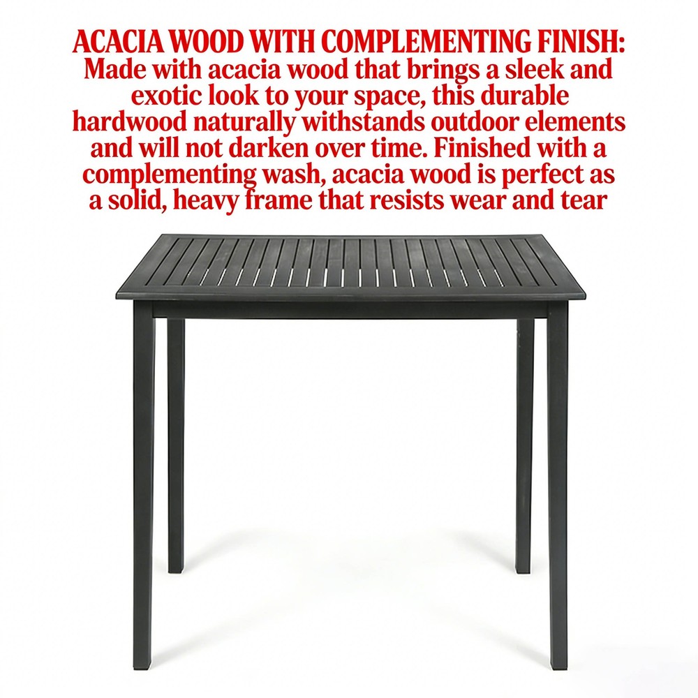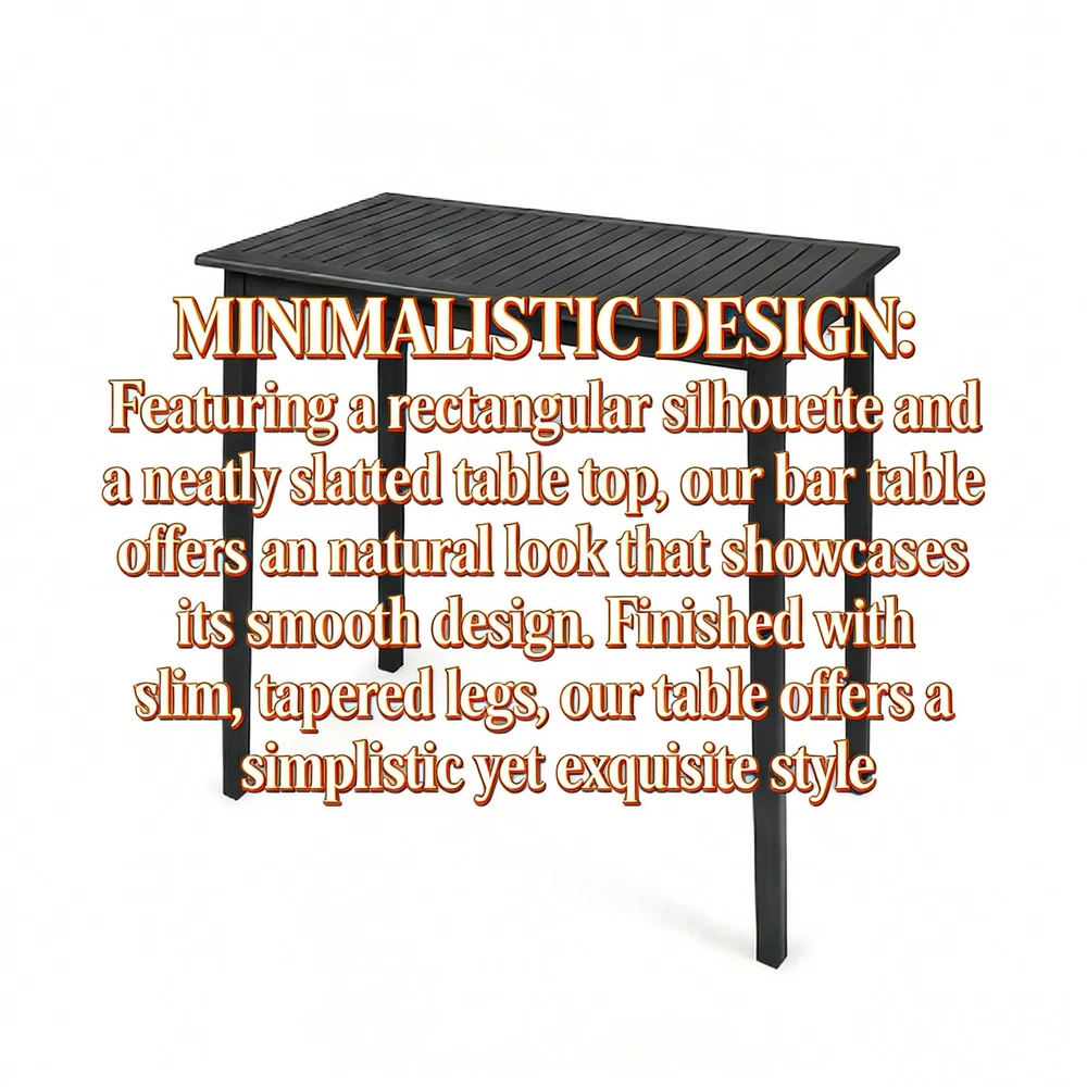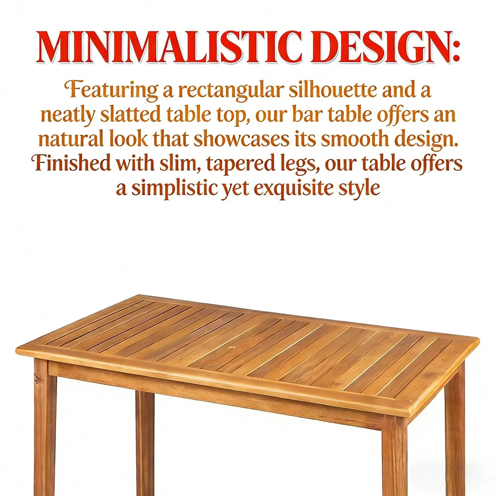 🌟 Product Highlights Timeless Minimalist Aesthetic : Boasting a clean rectangular shape and neatly arranged slatted tabletop, this bar table exudes a natural charm that highlights its smooth, refined lines. Paired with slim, tapered legs, it delivers a simplistic yet sophisticated look that complements any decor style—from modern patios to cozy kitchen nooks. Durable Acacia Wood with Teak Finish : Crafted from high-quality acacia wood, this table brings an elegant, exotic touch to your space. As a robust hardwood, it naturally stands up to outdoor elements like sun, rain, and humidity without darkening over time. The complementary teak wash enhances its natural grain while forming a protective layer, ensuring the solid, sturdy frame resists wear and tear for years. Bar Height Perfect for Versatile Use : Standing at 40 inches tall—ideal bar height—this table is a seamless addition to your outdoor patio, backyard, kitchen, or dining room. It pairs perfectly with bar stools for casual meals, cocktails, or outdoor gatherings (chairs not included). Hassle-Free Maintenance : Naturally weather-resistant to most outdoor elements, this table is designed for low upkeep. Extend its lifespan even further by covering it or storing it indoors during extreme weather conditions. Easy Assembly Included : Some assembly is required, but we've got you covered! All necessary instructions and tools are included in the package—no extra purchases needed. Set it up in minutes and start enjoying your new table. 📐 Product & Package Specifications Specification Type Details Assembled Length 44.00 inches Assembled Width 25.00 inches Assembled Height 40.00 inches Product Weight 29.76 lbs Package Length 47.00 inches Package Width 28.00 inches Package Height 6.00 inches Package Weight 35.96 lbs 🛡️ Our Promise to You We stand behind the quality of our products! Enjoy a 1-Year Warranty against manufacturing defects and a 30-Day Free Return & Exchange Policy —if you're not completely satisfied with your purchase, simply reach out to our customer service team for a hassle-free solution. Note: Chairs are not included with this bar table. For best results, clean with a damp cloth and avoid harsh chemicals.