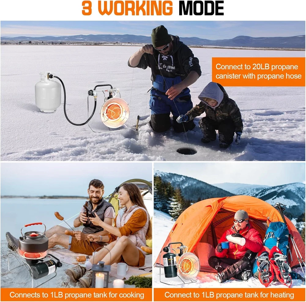 Product Description Outdoor Multi-Use Portable Propane Heater/Cooker, 18,000 BTU Gas Heater include 8.8 FT Hose and USB Lighter,Patio Heater,Tent Heater, Camping Heater for Hunting, Fishing,RV (Fuel not included) đ„Please Note : Propane Tanks are Not Included. Please keep this propane heater away from flammables. đ„ăVersatile Propane HEATER/COOKERă Our propane outdoor heater is ideal for all your outdoor heating and cooking requirements! Bring this heater along on your camping, fishing, RV CAMP and outdoor adventures, great for backyard as patio heater, as well as to sporting events and tailgate parties. đ„ăSafety Propane Patio HeaterăThe Automatic Safety Shut-Off Valve and Exterior Face Guard of the portable propane heater ensure your safety during use. Constructed entirely of metal, it eliminates the risk of fire and burning. đ„ăPropane Camping Heater Kit ăOur propane heaters for outdoor use is sold with an 8.8 FT high-pressure propane converter hose designed to connect the propane heaters outdoor to a 5-40 LB propane tank, allowing you to save money and reduce waste from disposable 1lb propane bottles. Additionally, the propane heater includes USB windproof lighter to ignite this propane heater. This rechargeable lighter eliminates the need for matches or traditional lighters, making it an essential tool for you. It can also ignite candles with ease. đ„ăPowerful Outdoor HeaterăThis patio heater generates up to 18,000 BTUs, effectively heating an area of 400 square feet. Easily set your desired heat level using the Heat Level Adjustment knob: Low (8,000 BTU), Medium (12,000 BTU), and High (18,000 BTU). It can run for up to 10 hours on low and 2 hours on high with a 1LB propane cylinder. About Us We are a reputable seller with many years of experience selling on eBay. Our goal is to provide high-quality products and excellent customer service. Payment 1.We accept PayPal only. 2.All major credit cards are accepted through secure payment processor PayPal. 3.Payment must be received within 7 business days of auction closing. 4.We ship to your eBay or Paypal address. Please make sure your eBay and Paypal address is correct before you pay. Feedback will be left automatically after we receive your feedback. Please contact us before leaving a Negative feedback or Neutral feedback. We would try our best to help you solving any problem. Shipping Items will be shipped within 1-3 business days when we received payment. (Orders are not processed on weekends & holidays) Tracking information will be sent once item is shipped. Delivery time depends on destination and other factors Item is shipped to ebay address. Leaving correct address can minimize delay. For international shipping and shipping to Guam, Hawaii and Alaska, Please contact us before placing the order. International buyers please note: Import duties, taxes and charges are not included in the item price or shipping charges. These charges are buyerâs responsibility. We will try our best to reduce the risk of the custom duties. Local pick-up is unavailable at the moment. Returns For any issues with Defects, Return, Item Exchange request, please contact us first and send us a message first before opening any type of case or request. We devote ourselves making EVERY CUSTOMER in 100% Satisfactory and resolve any problem. We highly value and appreciate your business. Thank you. No returns will be accepted without an RMA number. Please contact us for the RMA number. Return is acceptable within 30 days of delivery. Return for replacement or money back is optional. Returned items must be in the brand new, unaltered and resalable condition. Seller is not responsible for any labor cost, expense in a dealer store, or damage due to wrong installation. Contact Us We reply any email messages within 1 business / working days(off-duty at weekend). If you do not get a response from us, then please check your junk or spam mailbox. Our Business hours: Mon-Fri 9:00-18:00, UTC/GMT +8 hours. Please contact us either by clicking "contact seller" in the "purchase history" section or simply click "ask a question" at the bottom of this page. If you are unsatisfied with our item or service, please contact us before leaving any feedback. We are committed to resolve all issues in a friendly and satisfactory manner. powered by