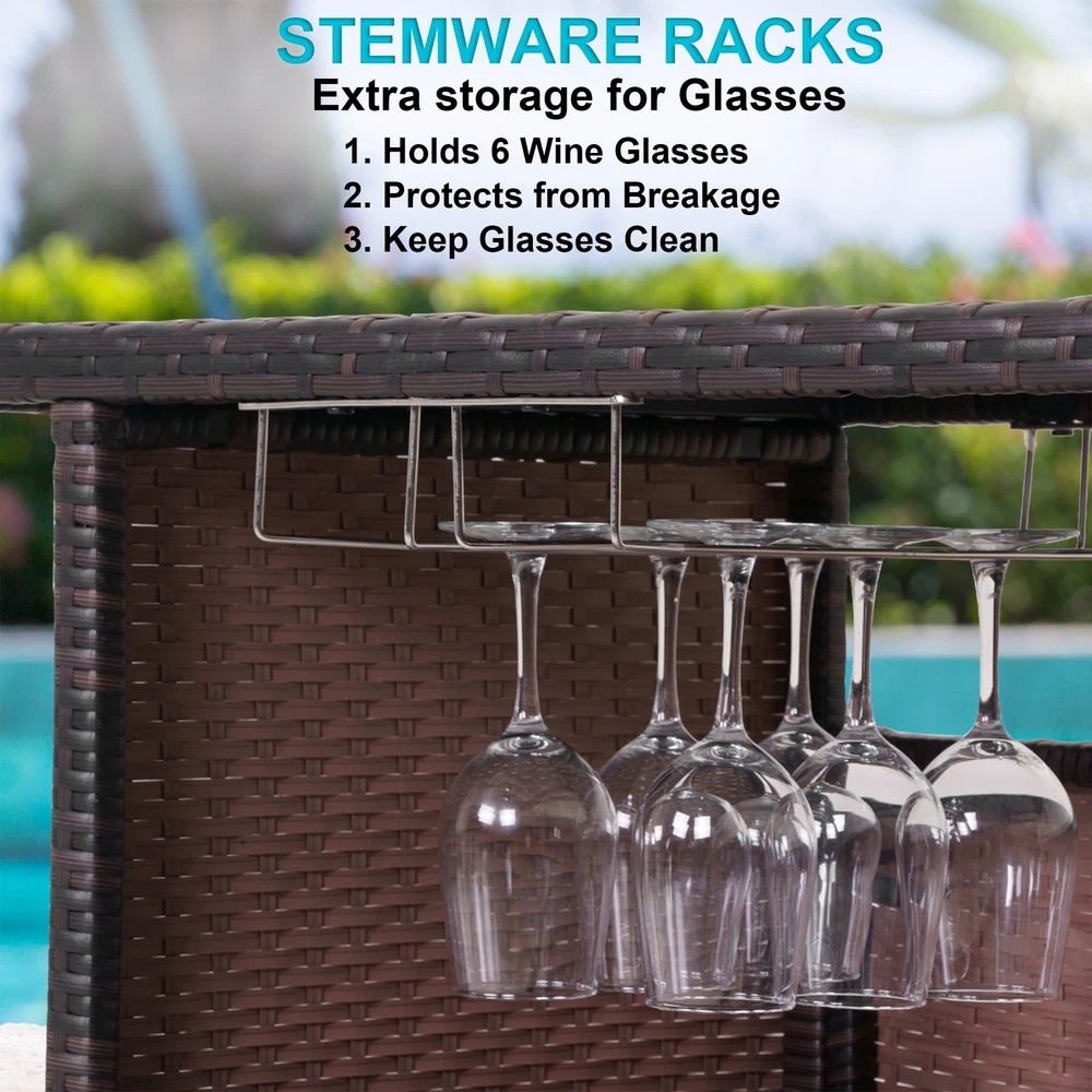JUSTMAE - YOUR OUTDOOR FURNITURE CHOICE Modern design matches your patio furniture. It is a perfect wicker bar patio table for your outdoor party to serve drinks and snacks. Besides, the elegant appearance can match well with any outdoor and indoor area including garden, yard, pool, kitchen, dining room, etc. Features: With 2 layer steel shelves under table add additional storage space for your outdoor party. 2 stemware rack for hanging wine glasses allow for easy access to drinks. Make your backyard the place to be for outdoor socials with the Patio Wicker Bar Table top support up to 88lb Weather and UV resistant made it more durable High quality rattan ensures strong wear resistance for long lasting use Specifications: Color: Brown Material: Steel & Wicker Overall Free Shipping Over $49.99* Details Outdoor Patio Rattan Bar Counter Table Product Description: JUSTMAE - YOUR OUTDOOR FURNITURE CHOICE Modern design matches your patio furniture. It is a perfect wicker bar patio table for your outdoor party to serve drinks and snacks. Besides, the elegant appearance can match well with any outdoor and indoor area including garden, yard, pool, kitchen, dining room, etc. Features: With 2 layer steel shelves under table add additional storage space for your outdoor party. 2 stemware rack for hanging wine glasses allow for easy access to drinks. Make your backyard the place to be for outdoor socials with the Patio Wicker Bar Table top support up to 88lb Weather and UV resistant made it more durable High quality rattan ensures strong wear resistance for long lasting use Specifications: ColorBrown MaterialSteel & Wicker Overall Dimensions54.72"L x 18.1"W x 36.8"H Dimension of shelves:33.9"L x 17.3"W Bottom to Top Shelf23.22"H Weight Capacity:110lbs Weight39.6lb Package Includes : 1 x Bar Counter Table 1 x Accessories Bag 1 x Manual