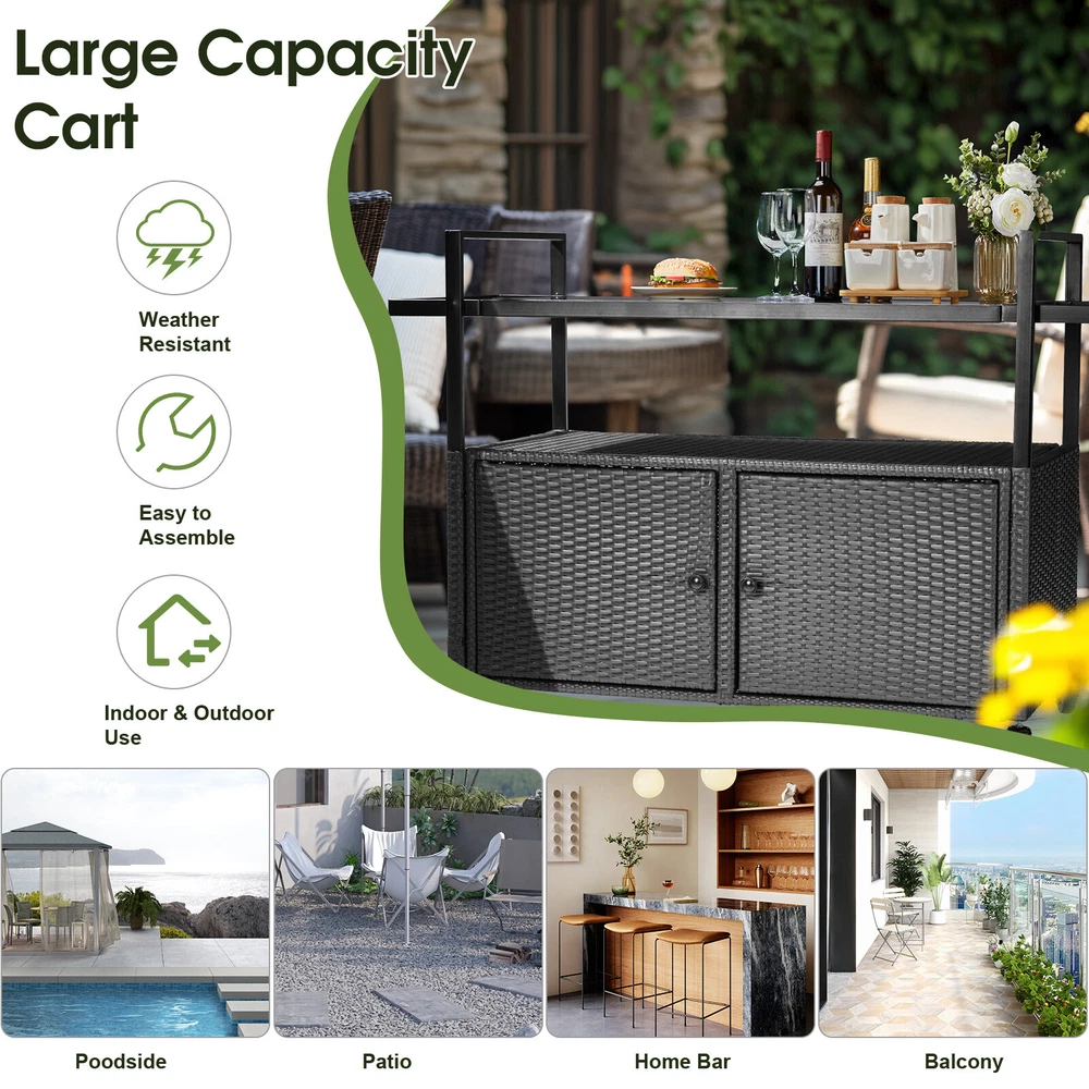listing template Visit our store Sigh up for email Outdoor Patio Rattan Wicker Bar Counter Table with Storage Cabinet, Garden Home Introductions: The Outdoor Bar Cart Table combines functionality, style, and convenience, making it an essential addition to any outdoor living space. Designed with a sleek glass tabletop, open shelf, and a large enclosed cabinet, this multi-functional bar cart can serve as a prep station or display cabinet. It offers easy mobility with lockable swivel wheels and sturdy handles, ensuring smooth transport between your garden, patio, poolside, or balcony. Crafted from durable all-weather wicker and metal, this versatile cart is built to last and withstand the elements. Perfect for entertaining or storage, it brings elegance and practicality to your outdoor gatherings. Features: 1. Multi-Functional Storage: This bar cart features a glass tabletop, an open middle shelf, and a large enclosed storage cabinet. Whether you need a prep table for drinks, a serving station for appetizers, or a storage solution for outdoor essentials, this cart has you covered. 2. Durable, Weather-Resistant Construction: This outdoor bar cart is made with high-quality all-weather wicker and a robust metal frame. The wicker is carefully crafted to endure the outdoors, resisting fading, cracking, or wear over time. The glass tabletop is not only durable and resistant to stains but is also incredibly easy to wipe clean. 3. Smooth Mobility and Stability: Equipped with four swivel wheels for effortless maneuvering and all four wheels are lockable for stability, this cart is easy to move and secure. Handles on each side make it convenient to transport across your patio or garden, and the handles can also be used to hang towels or kitchen accessories. 4. Perfect for Any Outdoor Occasion: Whether you're hosting a poolside cocktail party, an evening dinner on the patio, or a casual gathering in the backyard, this outdoor bar cart enhances your entertainment space. The sophisticated rattan finish and sleek design make it a stylish focal point in your garden, poolside, balcony, or porch. 5. Quick Assembly and Easy Maintenance: With clear, step-by-step instructions and all necessary hardware, assembly is a breeze. The weather-resistant materials make cleaning simple—just wipe it down to maintain its pristine look, ensuring your cart is always ready to impress your guests. Specifications: 1. Material: Iron, Wicker, Glass 2. Color: Black 3. Overall Dimensions: (51.2 x 19.7 x 35.4) in / (130 x 50 x 90) cm 4. Bottom Shelf Clearance: 3.0 in / 7.5 cm 5. Bottom Shelf Storage Space: (41.7 x 18.9 x 16.9) in / (106 x 48 x 43) cm 6. Glass Top Dimensions: (36.6 x 17.2) in / (93 x 43.6) cm 7. Upper Shelf Dimensions: (39.0 x 18.1 x 10.6) in / (99 x 46 x 27) cm 8. Weight: 50.7 lbs / 23 kg Package Includes: 1 x Outdoor Bar Cart Table 1 x Hardware Assembly Kit 1 x Instruction Manual You might like this more>> 6-Tier Bamboo Bookshelf Adjustable Storage Shelf Rack $49.99 Professional Cello 4/4 Full Size BassWood Set with Bag $148.99 Stainless Steel 4 Tier Steamer Cooker Steam Pot Kitchen Food $39.29 110 LB x 0.1oz All-In-One Digital Postal Shipping Scale 50kg $22.79 2Pack 10000LM LED Zoomable Flashlight Torch Lamp Light $9.99 Mini Exercise Bike Desk Pedal Bicycle $35.14 Shipping Policy 1. Ship worldwide from New Jersey by reliable shipping companies -- USPS, UPS, FEDEX, DHL, etc., and only to VERIFIED PAYPAL ADDRESS. Transport Delivery ETA. Package handling only takes 1 business day at our warehouse, so please make sure entering correct payment and shipping information before checking out. Once your payment is completed, we are not going to accept any more changes to your order. 2. International Buyers – Please Note: a. Import duties, taxes and charges are not included in the item price or shipping charges. These charges are the buyer's responsibility. b. Please check with your country's customs office to determine what these additional costs will be prior to bidding/buying. 3. Please check your shipping address carefully before checkout, it can't be changed if order completed. 4. Orders placed on weekend will be shipped within 2 days.Notification of shipment with tracking number will be sent to buyers. 5. Standard shipping: 2-7 business days Expedited Shipping: 2-3 business days One-day Shipping: 1 business day International shipping: Varies 6.Ship within 1 business day once payment completed. Notification of shipment with tracking No. will be sent to buyer. 7.We offer discounts for combine shipping. Please contact us first if you need combine shipping, and an invoice with discount will be sent to you. 8.Please allow 5 business days for delivery to US destinations on any eBay orders and 14 business days for delivery to any International destinations. We highly recommend our buyer choose priority/expess mail for international delivery which is much more stable. Return Policies 1. Refunds given only if item DOA and cannot be replaced via PAYPAL . If so, Please contact us with 5 days since you receive the item and and return to us within 30 days from the delivery date for exchange or refund. 2. If you need return, please contact our customer service representative, let us know the detailed problem and send us some pictures for confirmation. Payment Payment should be sent within 8(EIGHT) days of auction closing. Feedback If you are dissatisfied for any reason, please do not be quick to leave negative/neutral feedback. We work hard to make sure EVERY CUSTOMER 100% SATISFIED and resolve any problem for you. Work Time Work Time: Monday to Saturday About Us | Newsletter| Feedback| Contact Us Copyright © 2021 Yallstock. All rights reserved. 无标题文档 Outdoor Patio Rattan Wicker Bar Counter Table with Storage Cabinet, Garden Home Introductions: The Outdoor Bar Cart Table combines functionality, style, and convenience, making it an essential addition to any outdoor living space. Designed with a sleek glass tabletop, 