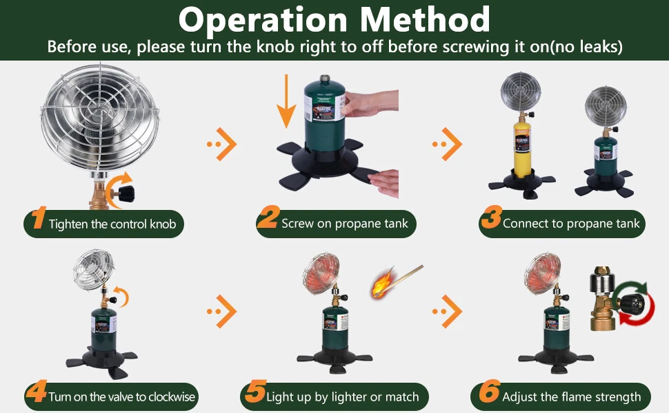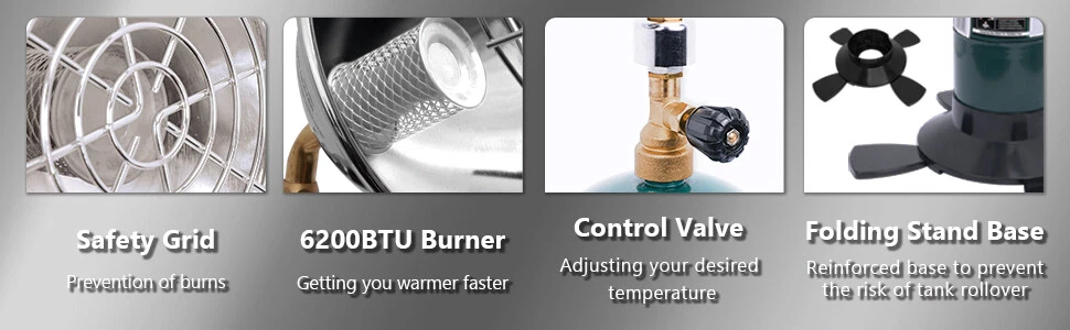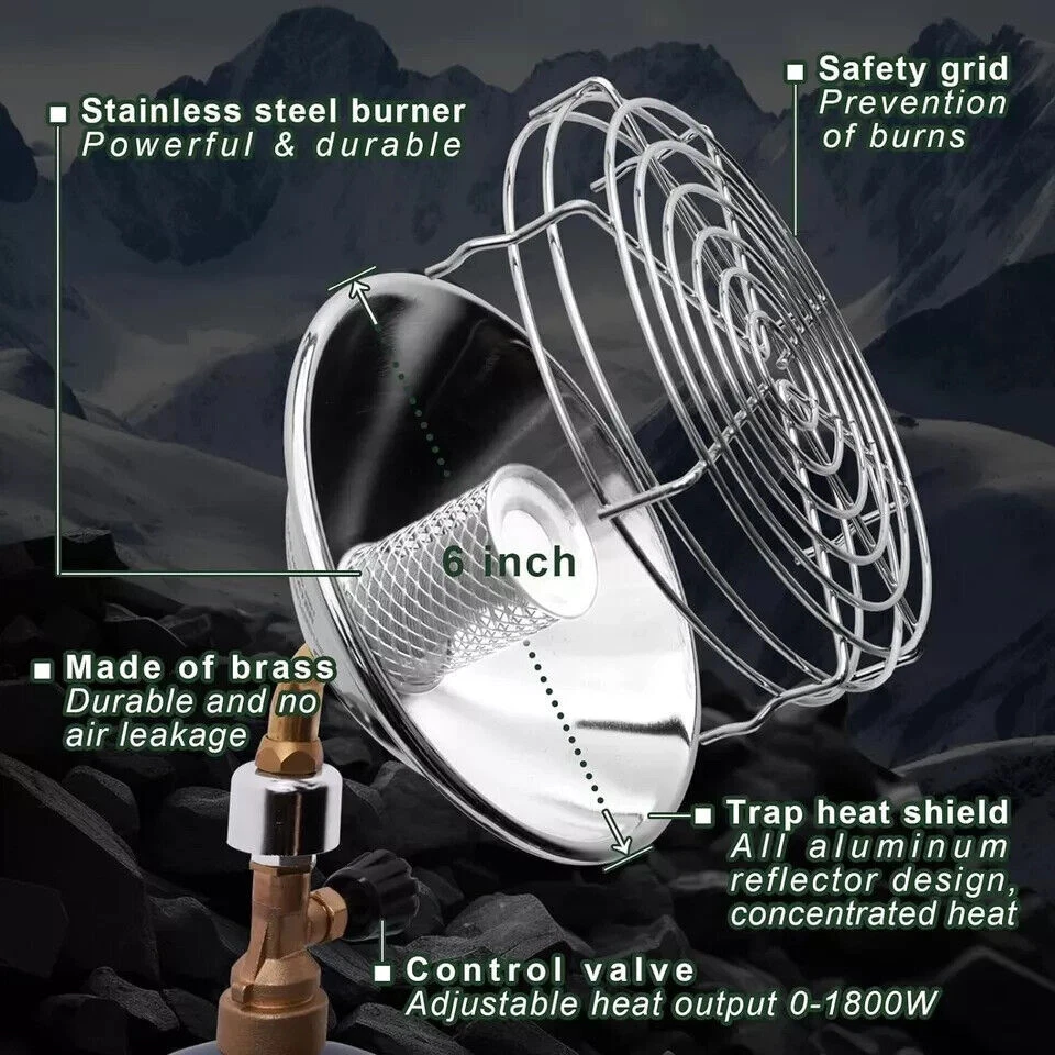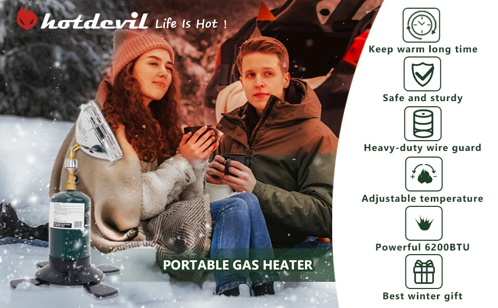 Size: Heater Brand Hotdevil Special Feature Portable, Energy Efficient, Foldable Legs, Lightweight, Adjustable Temperature Color sliver Form Factor Stand alone Indoor/Outdoor Usage Outdoor Power Source gas_powered Heating Method Radiant About this item Efficient Outdoor Heater: Experience warmth in seconds with our powerful propane gas heater, capable of heating up to 200 square feet with an impressive 6200 BTU radiant heat output. Designed for quick and efficient heating, it ensures your comfort even in the coldest weather. This outdoor heater Perfect for winter fishing, garden parties, and other outdoor activities, it’s an essential tool every homeowner should have to enhance their outdoor experiences. Portable Propane Heater: Take the warmth of home wherever you go with our compact and lightweight propane heater. This camping heater is strong enough to handle even the most challenging environments. With a powerful 6200 BTU output, it provides reliable heat for outdoor activities such as camping, picnicking, hiking, or simply relaxing on your patio. Perfect as a garage heater, patio heater, tent heater, or space heater, it runs on a propane tank (not included) and is easy to set up, making it an essential companion for both work and leisure. Adjustable Temperature Camping Heater: Stay warm indoors and outdoors with our portable propane radiant space heater. By rotating the control knob clockwise, allowing you to fine-tune the temperature from gentle warmth to higher heat levels to meet a variety of comfort needs. Whether you're in your garage, tailgating, ice fishing, hunting, camping, traveling, hiking, or enjoying any outdoor activity, this portable propane heater provides reliable, convenient heat quickly, ensuring you're comfortable in any environment. Durable Construction Propane Heater: Our outdoor heater is built with safety in mind, featuring safety mesh guards and a gas canister secure bracket to ensure worry-free use. Its durable all-aluminum reflector design withstands the rigors of various outdoor environments, delivering reliable performance in any weather. The connecting hose to the gas cylinders is made of brass to prevent gas leaks, enhancing safety. Plus, its simple yet vintage appearance adds aesthetic charm to your outdoor space, combining functionality with style. Fuel Compatibility (Sold Without Tanks): Please note that propane cylinders and tanks are NOT INCLUDED.The camping heater operates on 1-pound propane tanks, providing the perfect amount of warmth without the need for electricity. For best results, we recommend using the Hotdevil's 1lb Bluefire propane camping gas cylinders. Our customer service team is always available to assist with any issues. This heater makes a fantastic gift for outdoor enthusiasts and is perfect for family outdoor activities.