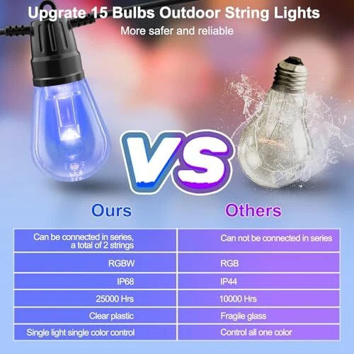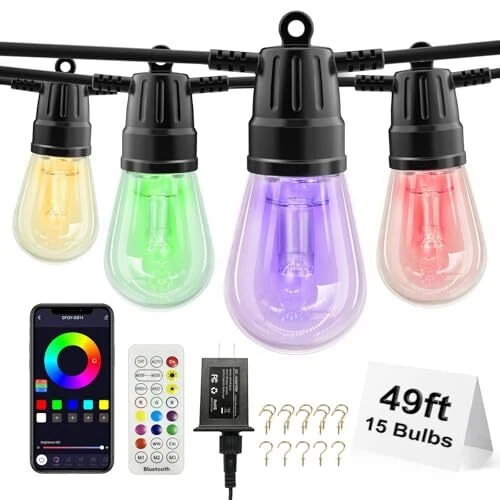 Return Policy Fast Delivery Trusted seller Outdoor RGBW String Lights, 49ft 15 Bulbs Patio Lights with Remote & APP, S14 Dimmable Color Changing IP68 Waterproof Dimmable LED Hanging Lights for Garden Yard Porch Party Product Description ?【Creative APP & Remote Control RGBW Outdoor String Lights】Customize the color of the permanent outdoor lights through the Magic Lantern APP. T are 16 million colors and 47 vibrant scene modes for you to choose from, and they can also be adjusted to warm white , you can DIY your favorite color for each bulb, suitable for a variety of scenarios use. ☔【Commercial Grade IP68 Waterproof String Lights】The RGB patio lights have 15 pieces shatterproof bulbs, This thickened PC S14 bulb is shatterproof and not easy to deform. The LED dimmable string lights adopt a fully enclosed IP68 waterproof design as a whole, and can be used in environments such as sun, wind, rain, snow, and humidity. Our Bulb composed of high-quality industrial-grade plastics, are light and safe, and have better anti-fall ability.【Note: the power adapter is not waterproof】 ?【Smart Control & Music Sync RGBW Lights】You can adjust the brightness between 0%-100% with the mobile APP, you can also set timers and schedule times to control when gazebo lights turn on/off. The smart garden lights also have a built-in microphone, which can synchronize the outdoor lights with any type of music. The party lights outdoor dance with the music, allowing you to enjoy an unparalleled immersive sound and light experience on Christmas, Halloween, and other festivals. ?【Multi-String and Easy to Install String Lights for Outside】Our 49ft RGBW hanging lights can be connected in series make outdoor color changing lights to extend up to 98ft in length, which is great for your large yard use and your need. And the 0.19"/0.016ft diameter hanging holes and included hooks allow you to easily hang your outdoor string lights on a wall, coffee shop, garden or backyard using wires, ties or screws.【Note: We only have one string lights in the package】 ?【Wide Application Indoor & Outdoor Ambient Lights】Our RGBW outdoor lights for patio provide amount of lights for deck, porch, gate, terrace, bistro, trail, restaurant, garden, tent, backyard, wedding, leisure, dinner party, Christmas, halloween decor. We provide 24 month comprehensive warranty. If you have any questions about rgb string lights outdoor, please feel free to contact us via the message box or customer service email, we will give you satisfactory solution within 24 hours. Shipping Returns Payment Shipping Shipping is FREE to all addresses other than APO/PO boxes in the lower 48 states. All our stock ships from US-based warehouses. Shipped via USPS or UPS (depending on location and package weight) Unless stated otherwise, all orders will ship within 24-72 hours of your payment being processed. Check our feedback to see the great reviews of FAST shipping we offer. Returns Seller does not accept returns Payment We currently accept payment via eBay managed payments only. Once payment is cleared, we will dispatch your shipment within 1-3 business days. Please refer to the "Shipping" tab for more information regarding shipping speed to your destination.
