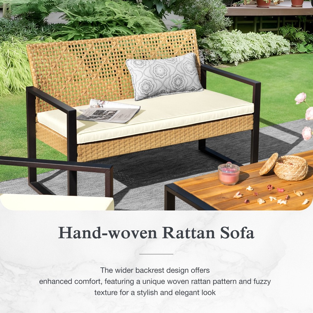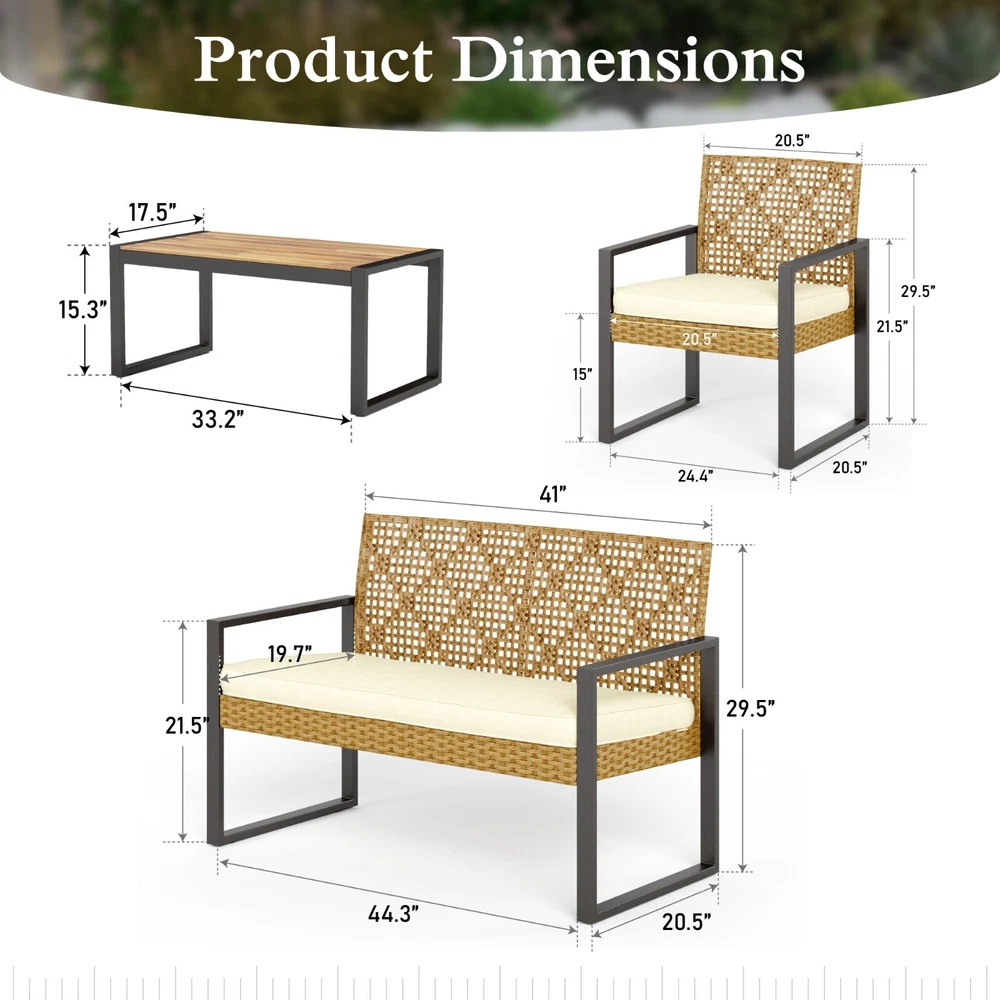 About Us Product Description: Transform your outdoor space with our stylish Rattan Furniture. This elegant rattan sofa combines comfort and charm, making it the perfect addition to your patio or garden. Designed for relaxation, this furniture set invites you to unwind while enjoying the fresh air. The durable rattan material is not only weather-resistant but also easy to clean, ensuring that your outdoor oasis stays beautiful for years to come. Enjoy gatherings with friends and family or simply relax in style on our cozy rattan sofa. Elevate your outdoor living experience today! About Us Feature: Made from beautifully woven rattan and 100% acacia wood, this furniture combines style and durability. The natural look of the woven rattan adds a touch of elegance to your patio, garden, or balcony, making it perfect for relaxing with friends or family. The sturdy acacia wood frame ensures that your furniture is built to last, providing comfort for years to come. Easy to maintain and weather-resistant, our Rattan Furniture is the ideal choice for any outdoor setting. Elevate your home today with this luxurious and functional addition! About Us Our products come with 1-year-warranty, ensuring that there will be no defects in materials and workmanship under normal use. We do our best to hear from customers and update our products. If you have more problems, please be free to contac
