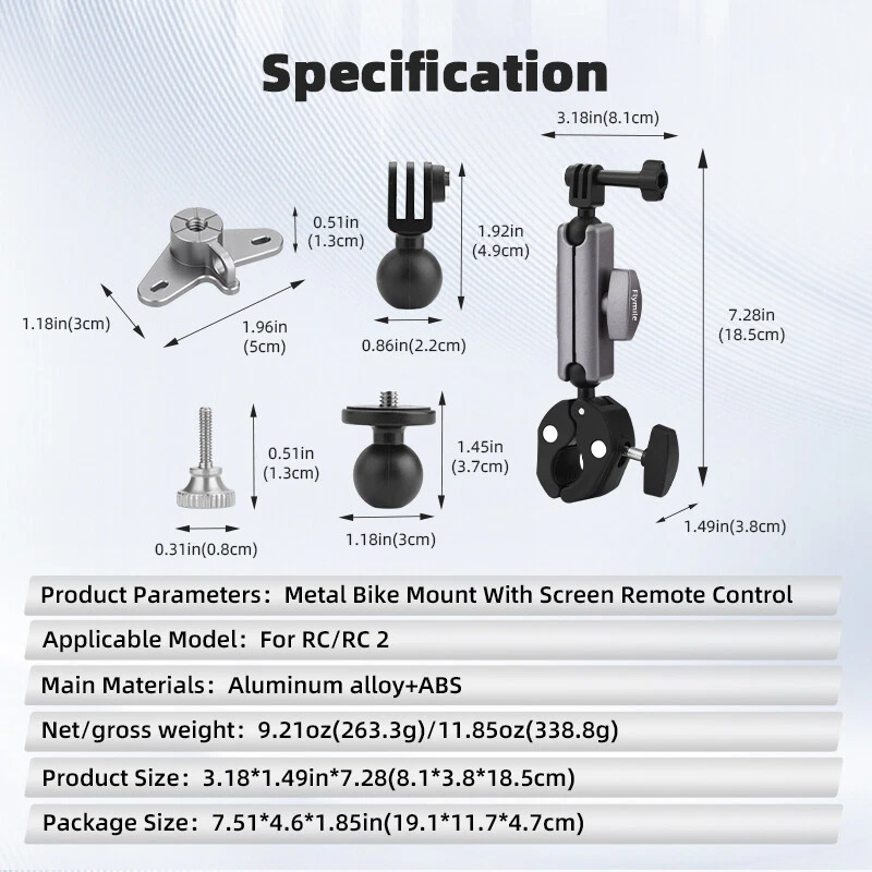 Product Description If you have any questions, please contact customer service first, do not open disputes easily, thank you! Feature: 1.Aluminum alloy base specially designed for DJI RC/RC 2. 2.Dual ball head design, more flexible, meet more angle adjustment. 3. Clamps to any 0.78 to 1.96in (2 to 5cm) diameter tubes. 4.The metal clip has two screw holes, which are compatible with RC/ RC2 remote controllers with screens. 5.1.Attached to aluminum alloy spacer to connect to DJI RC/RC2 remotes. Can be attached directly to cameras with screw holes. Complimentary adapter, you can connect /OSMO Pocket 3 / Action 4 and other cameras 6.Can be stored in a carrying case, explosion-proof box, original packaging, etc. Specification: Material: Aluminum alloy+ABS Applicable models: For RC/RC2 Remote Control(other models are not applicable, please check your remote control model before purchase) Color: Black+Silver Net weight:9.21oz(263.3g) Packaging includes: Cycling Mount*1 Sankwa Adaptor*1 1/4 adapter*1 Long screw*1 Hand screw*2 Metal buckle*1 Instructions manual*1 Note: 1.Does not include Sports camera, 2.Transition: 1cm=10mm=0.39inch, 3.Please allow 1-3mm error due to manual measurement. please make sure you do not mind before ordering, 4.Due to the difference between different monitors, the picture may not reflect the actual color of the item,please make sure you do not mind before ordering, Thank you! About Us We accept all payments authorized by eBay. powered by On Aug 8, 2024 at 00:31:45 PDT, seller added the following information: