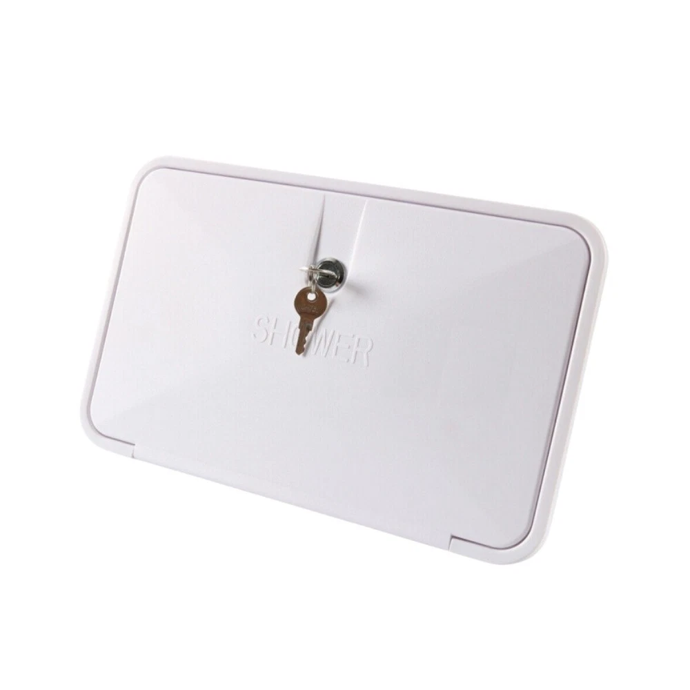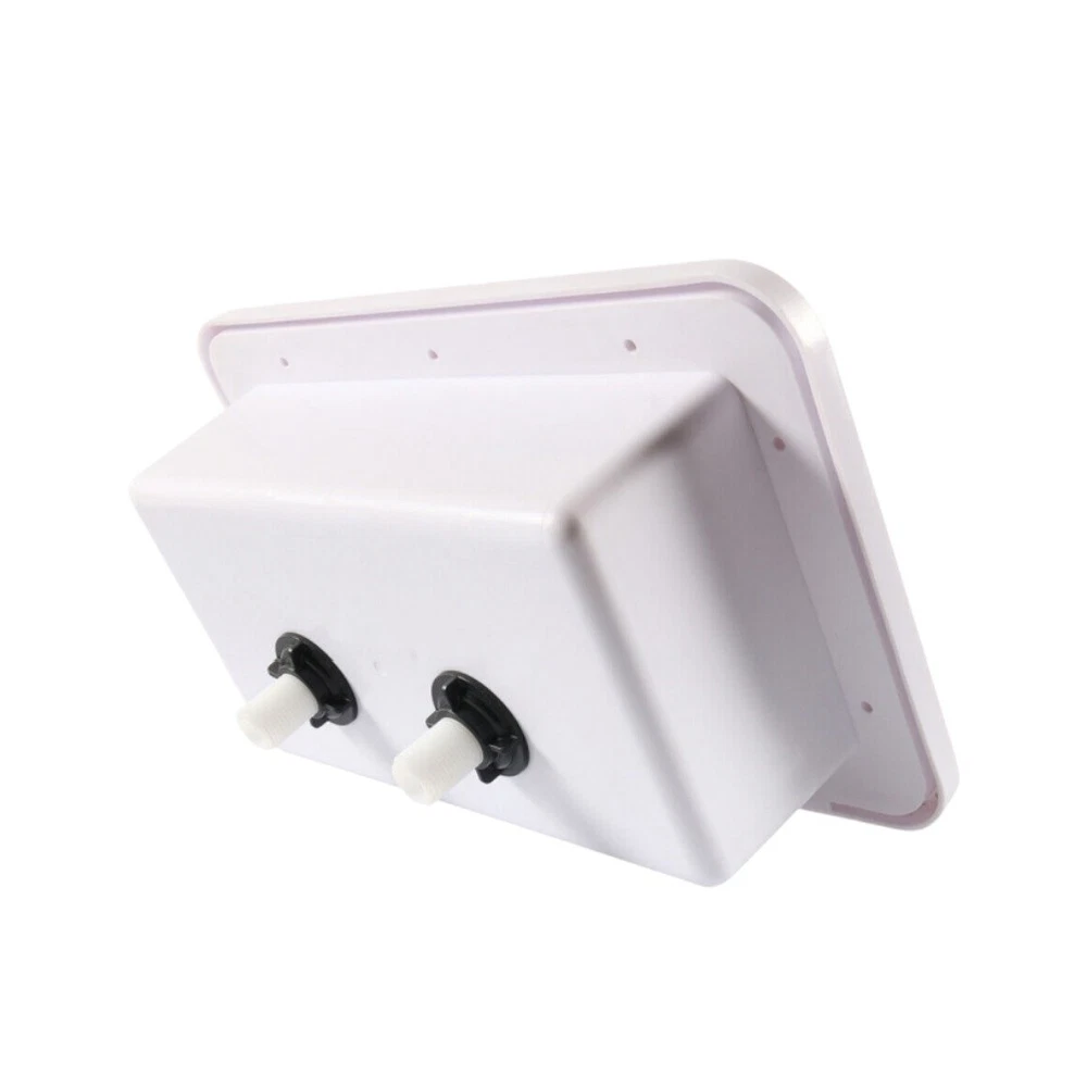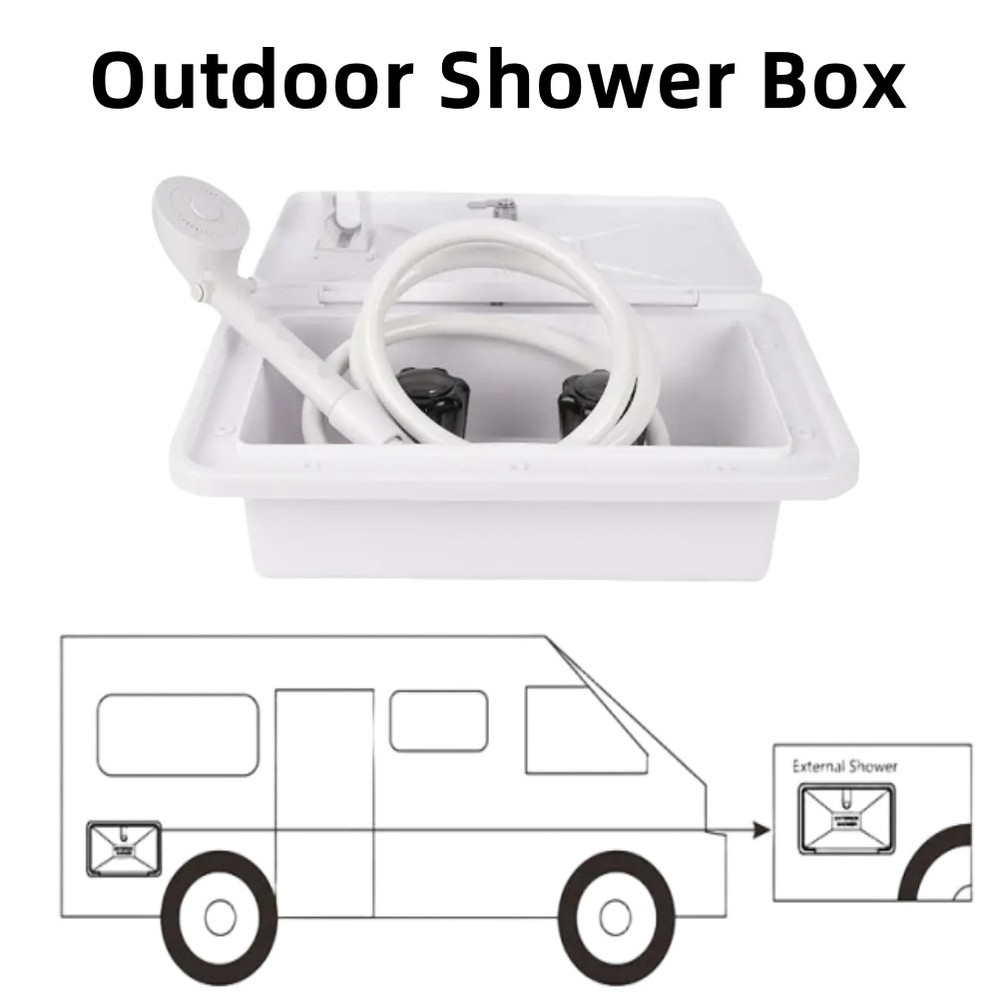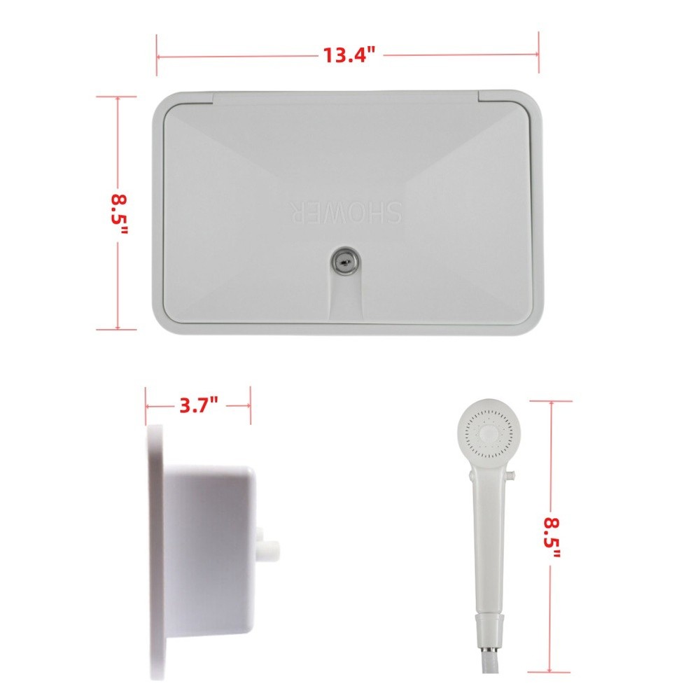 Specification: Hose Length: 47.2" D imensions: 13.4" Width x 8.5" Height H andle Type: Dual Knob Material: Plastic Installation Position: Exterior, Rear Features: Easy to control the spray from high to small to save water. Constructed with premium grade light weight material. Both hot and cold knobs for precise control over water temperature. Add winterizing flulid,open valves to purge water close valves drain shower head and hose. Outdoor shower is perfect for rinsing off beach sand,bathing pets,cleaning sports equipment and more. Package Included: 1Pc Shower Box (I nclude Key Lock)