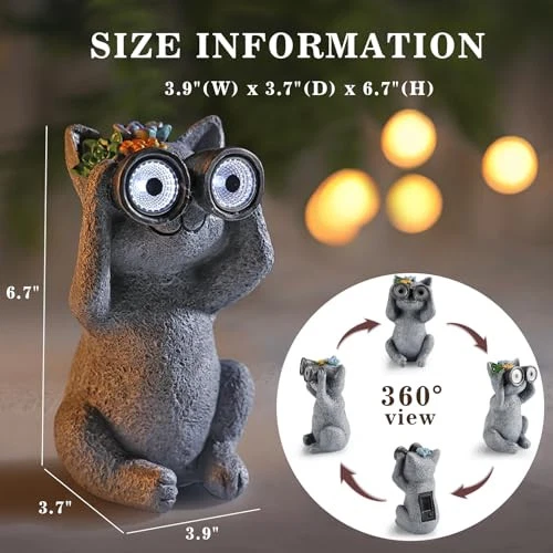 30 Days Return Policy Fast Delivery Trusted seller Outdoor Solar Garden Statues, Funny Garden Decor Statue - Resin Animal Statues Decor with Binoculars, Outdoor Solar Statues for Patio Decor, Unique Garden Gifts for Women. Product Description ?Cute Cat Statue: This outdoor garden statue is made of high quality resin with good waterproof and dustproof; the solar garden cat statues measures 3.9'' (W) x 3.7'' (D) x 6.7'' (H); the solar cat statue holding binoculars to look into the distance embellished with cute flowers, unique design, bring lasting and charming decorative effect to the garden. ?Solar Automatic Charging: The solar garden decor statues comes with solar panel. This garden statue is easy to install, simply switch the solar lantern ON and leave it in the "ON" position during the daytime. The solar panel will charge during the day and automatically light up at night. If you are not sure whether the button is turned on, please cover the solar panel with your hand. If the switch is turned on, it will light up. ?Unique Gifts: This outdoor statue is exquisite and cute, and will add a charming touch wver it is placed. It is a unique gifts for animal lovers and gardening gifts; warm gifts for mom and grandmother who love outdoor space, Our cute solar statues are great gifts for Housewarming, Mother's Day, Father's Day, Easter, Thanksgiving, Birthdays, New Year, Christmas, etc. ?Beautiful Home and Garden Decoration Gift: The unique and cute design style of this solar statue makes it a very beautiful decor accents. Suitable for all kinds of scenes. Due to its unique shape and solar functionality, it is not only suitable for garden decor, lawn decor, porch decor, patio decor, backyard decor, adding life to small corners of the garden. It is also suitable for home decor, house decor, used to decorate window sills, desks, corridors, balconies and so on. ?Professional After-Sales Service: We take your shopping experience very seriously, if you have any questions about this product, please contact us directly, we will provide you with a wonderful experience from purchase to placement in your garden. Shipping Returns Payment Shipping Shipping is FREE to all addresses other than APO/PO boxes in the lower 48 states. All our stock ships from US-based warehouses. Shipped via USPS or UPS (depending on location and package weight) Unless stated otherwise, all orders will ship within 24-72 hours of your payment being processed. Check our feedback to see the great reviews of FAST shipping we offer. Returns As our valued customer, we will do our best to make sure the product you receive arrives to you on time and as expected. If you are not satisfied with your purchase, please contact us within 30 days of receiving your order to process a return. Payment We currently accept payment via eBay managed payments only. Once payment is cleared, we will dispatch your shipment within 1-3 business days. Please refer to the "Shipping" tab for more information regarding shipping speed to your destination.