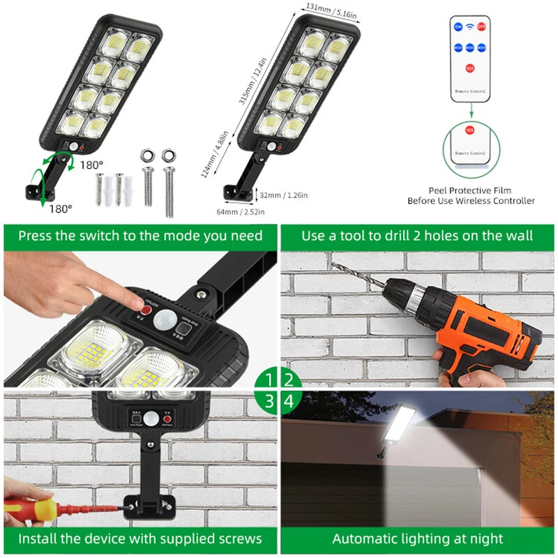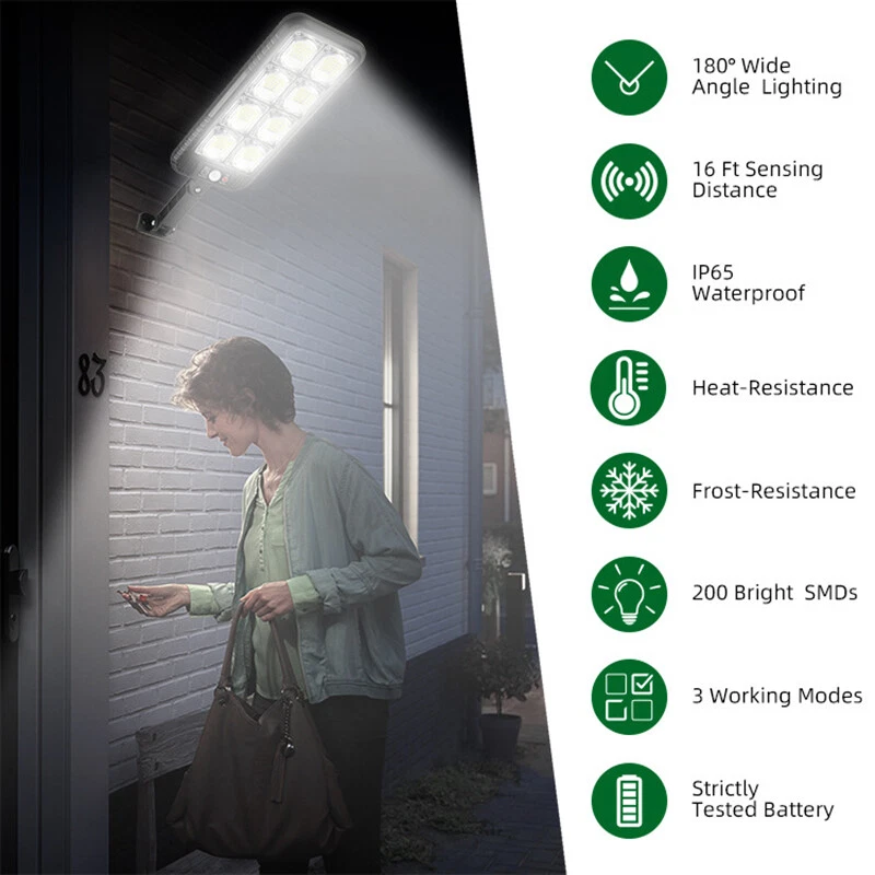 Outdoor Solar Street Light Motion Sensor Lamp Commercial Dusk To Dawn Road Lamp Note: Please check the size carefully before making order Item size: 31.5 x 13.1cm / 12.4 x 5.16in Light Arm: 12.4cm / 4.88in Description: LED Solar Light Outdoor: The LED solar street lights outdoor produce ultra-high brightness illumination for a wide area, providing lighting and security to front door, pathway, gutter, porch, front/back yards, gardens, driveways, fence, wall, stairways, landscape, patio or any outdoor places that needs lighting, bring you a super bright lighting experience. 3 Optional Modes & Remote Control: 1. Sensing Mode - Strong light for 20s once movement detected, then turn off. 2. Constant Light + Sensing Mode - Dim light all night, and strong light for 20s when sensor detects movement. 3. Constant Light Mode - Medium light mode all night. 120° Wide-Angle Solar Lighting: The outdoor wall lights features high sensitivity and adjustable bracket design, can sensitively sense moving objects in 10 ~ 15ft with 120° range, providing security and convenience for your home when night falls. High Efficient Solar LED Outdoor Lights: These solar light are made of more energy saving laminated solar panel and premium LED lights, which will be more long-lasting and suitable for longer usage time. Build-in 2400mAh rechargeable lithium-ion battery to allows the LED solar lights to be continuously illuminated for 6 ~ 10 hours in bright mode to meet your lighting needs. IP65 Waterproof & Easy Installation: The solar street lights is made of long-lasting and high-impact ABS Material which makes it to withstand a variety of outdoor environments and other extreme weather conditions. Easy to install and set, no wire and tools need. Specification: Product Name: Solar Street Light Light Body Material: ABS + PC Light Color: Cold White 6500K LED QTY: 200SMD Waterproof: IP65 Battery Capacity: 3.7V 2400mAh Charging Time: 6 ~ 8hrs Direct in the Sun Working Time: 6~ 10hrs Installation Height: 2 ~ 3m / 6.56 ~ 9.84ft Lamp Body Size: 31.5 x 13.1cm / 12.4 x 5.16in Light Arm: 12.4cm / 4.88in 3 Lighting Modes: OFF: Light OFF Mode; Mode 1: Lights on when people pass by, lights off when people leave; Mode 2: Lights on when people pass by, 20% brightness when people are away; Mode 3: Automatically light up when dark, Keep on till the sky gets bright. Package Included: 1 x Solar Street Light 1 x Remote Control 1 x Set of Installation Accessories Payment Shipping Return Contact us About us Payment 1.Paypal, Credit Card, G Pay etc, many payment way is accepted. 2.Please be sure your shipping address is correct before make a payment. Shipping 1.We will ship out the item within 1-3 business days after comfirming the payment, appreciate your patience. 2.If the items are broken on the way( we usually check the item clearly before we send them ),please contact us within 3 days you receive it. We will send you a new one or refund your payment. Return 1.We stand behind every buyer.Items can be returned for exchange or refund within 30 days. 2.Please contact us when you have any confusion of our item, we will solve the trouble for you as soon as possible. Contact us 1.This is professional Seller.We will reply your message within 24 hours. 2.Please contact us whenever you have any question about the item. We will deal with it as soon as possible. 3. If you are unhappy with the item or our service,please Contact Us before leave feedback,just give me a chance,thank you! About us 1. Unless specified otherwise, all our products are IN STOCK and are shipped from Local warehouse - Not Overseas! 2. We provide a 30 day Satisfaction Guarantee or your money back (provided items are in the same new and resaleable condition.) 3. We have a PayPal Verified Business Account, please buy with Confidence! 4. Every item will be tesrted before send.We know our products well and if we don't have the answers we will do our best to find them for you! 5. Our friendly team look forward to serving you! Your satisfaction is our No.1 Priority We will do our best to satisfacy you. Brand Unbranded Color Black Color Temperature 5600 - 6400 K Daylight/Cold Control Style Remote Control Features Dusk-to-Dawn, Energy Saving, Water Resistant, Waterproof, Weather Resistant Installation Area Outdoor Light Color Clear White Lighting Technology LED Material ABS Model Solar light Mounting Wall Mounted MPN Does not apply Number of Lights 1 Number of Settings 3 Power Source Solar Sensor Type Motion Style Modern Theme Garden Type Street Lamp Size 31.5 x 13.1cm / 12.4 x 5.16in Light Arm 12.4cm / 4.88in Notes: Please check the size before making order