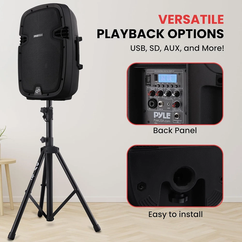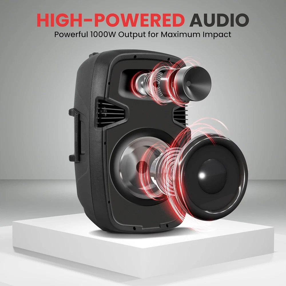 Item dimensions L x W x H 30 x 24.5 x 47 inches Connectivity Technology Bluetooth Color Black Compatible Devices MP3 Player, Tablet, Smartphone Wireless Portable PA system - 1000W High Powered Bluetooth Compatible Active + Passive Pair Outdoor Sound Speakers w/ USB SD MP3 AUX - 35mm Mount, 2 Stand, Microphone, Remote 1000 WATT POWER: This portable high powered 2 way full range audio projection loudspeaker PA system has a maximum power output of 1000 watt peak power / 500 watt RMS so you can play your favorite tracks as loud as you want and with style 10 inches SUBWOOFER 1 inches TWEETER: This active + passive pair PA speaker kit is equipped with 10 inches subwoofers, high performance 1 inches tweeters and compression driver w/ titanium diaphragm for surround stereo sound reproduction and impressive bass response COMPATIBLE WITH BLUETOOTH: This PA loud speaker is compatible with bluetooth for wireless audio streaming and works with devices like iPhone, Android mobile phone, iPad, tablet, PC. Ideal for personal indoor home use or for outdoor DJ party. Power Cable Length is 4.9 ft 5 INPUTS: Equipped with a USB flash drive and SD card reader so it can serve as an MP3 player, 3.5 millimeter AUX input,1/4 inches SpeakOn Input, and XLR microphone input for karaoke. Has a 35 millimeter stand mount and comes with 2 stands, remote, microphone, power cable EQ CONFIGURATION: This high powered heavy duty PA system also features a digital LCD display and rear panel rotary dial / button control center to adjust the master volume, mic volume, treble, bass so you can balance the audio levels to your liking Size 10"Inch
