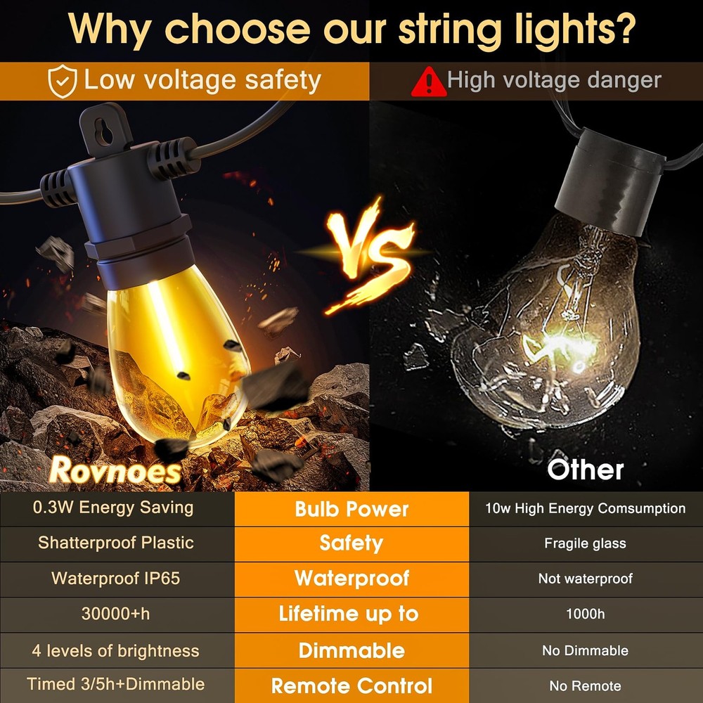 【Dimmable String Lights with Remote】control with remote, 3 lighting modes - breath / lighting / flash mode, adjustable 4 levels of brightness - 25%/50%/75%/100%, meet your different lighting needs for your party in patio. 【IP65 Waterproof】IP65 water proof, not only as hanging lights for indoor, also can as outdoor led lights to withstand humidity, rain, wind, snow, and extreme weather, suitable for your various lighting scenes in your daily life, help you to creat a cozy ambiance. 【Safe Low Voltage String Lights】new advanced low voltage design, more energy saving, same lighting effect as high voltage ones, but no risk of high voltage, safer for family members to use. 【Shatterproof LED Edison Bulbs】plastic led lights bulbs, no worry about broken bulbs, extra-long 15,000 hour lifespan, no need for frequent replacements, save your time & money, provide reliable and long-lasting outdoor lighting. Enclosed lamps, ultra low fever, combined with low-voltage wires, safer to install & detach, protect you and your family. 【Easy to Use & Widely Scenes】with hanging holes on its cord, easy to hang and as decorations for your porch, patio, backyard, garden, gazebo, pergola, tent, balcony, terrace, bedroom, living room, bistro, cafe, market, well fit for birthday, wedding, holiday, house party or other conditions.