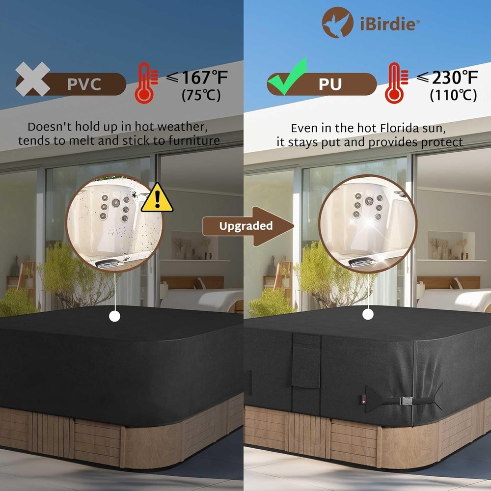 Store New Arrivals Add to Favorite View Feedback Contact Outdoor Waterproof Rectangular Hot Tub Cover 89 X 79 Inch Fit 88 X 78 or 87 X 77 or 86 X 76 SPA 600D Heavy Duty Rectangle Weatherproof Protectors Protective Cover Cap Description Item model number Black Hot Tub Cover 89 x 79 Closure Type Zipper Style hot tub cover Color Black Pattern Black Material 600D Fabric, polyurethane(PU) Item Weight 4 pounds Installation Type Manual Shape Rectangular Model Name Black Hot Tub Cover 89 x 79 Size 89" x 79" (7'5" x 6'7") Special Feature UV Resistant, Waterproof Product Dimensions 89"L x 79"W Proper Dimensions: Cover size 89 inch long, 79 inch wide, 18 inch high; Please measure the length and width of your hot tub before ordering, and order a cover that is longer and wider than your hot tub Weatherproof: Perfect for protecting your hot tub and hard top cover from inclement weather, our hot tub covers protect against falling debris, rain, snow, hot sun, and more, keeping your hot tub safe and in good condition Air Vents Design: Both sides are designed with air vents to expel moisture from the interior; Also designed with two fabric handles, it is easy to put on and take off; Please note, This cover can not be insulated, you still need to use the hard cover Well Made: iBirdie Hot Tub cover is made of heavy-duty fabric with a waterproof coating; All seams are double-stitched for strength and have a sealant attached to the seams to prevent tears, leaks, etc Secure Fit: Four adjustablebuckles and waterproof zippers on each corner ensure a secure fit for your spa cover, even in strong winds.You can trust our cover to stay in place and keep your spa protected, no matter the weather Product description Note: Order a cover that is longer and wider than your hot tub Can this hot tub cover handle snow and winter weather? Yes. This cover is designed for winter conditions such as snow, wind, cold temperatures, and debris. It helps protect your spa cover from weather exposure, but it is a soft protective cover and not designed to support heavy snow loads. Is this a replacement insulated hot tub cover? No. This is a protective weather cover designed to go over your existing hard spa cover. It does not provide insulation or heat retention and should always be used together with your original hot tub lid. Does the zipper closure help keep rain and snow out? The cover uses 4 corner zipper combined with adjustable buckles to help reduce water entry during rain and snow. For best performance, fully close all zippers and secure the buckles snugly. Proper installation helps improve weather protection. How does the cover stay secure in windy conditions? The cover features adjustable straps and buckles that fasten around the spa to help prevent lifting or shifting. When tightened correctly, they provide reliable wind resistance during normal outdoor conditions. How do I choose the correct size for my hot tub? Measure your hot tub’s length and width before ordering. Choose a cover that is slightly longer and wider than your spa for proper fit and easier installation. Measuring first helps ensure better protection and a more confident purchase. This hot tub cover offers two options: Black cover(600D fabric + PU coating) resists extreme temperatures, PU is lightweight but expensive; Brown cover(600D fabric + PVC coating) PVC is affordable, thicker, heavier. Both are Long-lasting and waterproof, please select your ideal cover based on needs. ABOUT US We offer the best prices around on high quality products. Our E-store includes media such as books, movies, music and games while offering electronics, toys, sporting apparel, clothing, tools, general home, garden items and more. SHIPPING We are always working hard to ensure your package arrives as soon as possible. Please understand that some factors like weather, high postal traffic, and the performance of shipping companies are outside of our control. We offer free shipping to the lower 48 states and ship within 2 business days of payment, usually sooner. We do not accept P.O. Boxes. Please provide a physical address. For shipping outside of the continental USA, we only use eBay's Global Shipping Program.The item is shipped to KY and then sent to the rest of the world. International customers are responsible for all duties and taxes. Continue to check out in order to calculate costs for shipping the item to your country. Messages regarding eBay's Global Shipping Program MUST be directed at eBay EXCLUSIVELY. RETURNS We offer a 30-Day Return Policy on items which you are not completely satisfied with. You have the option for a full-refund or an exchange of the item. No returns are available on items shipped outside of the USA. PAYMENT We accept PayPal. CONTACT US This page content is yet to come Please ad us to your favorite seller and visit again later Thank You CUSTOMER SATISFACTION We try our very best to make sure every customer is completely satisfied. If there's a problem, message us! We're happy to help. WE ACCEPT Copyright © 2021 AutoDS. | All Rights Reserved